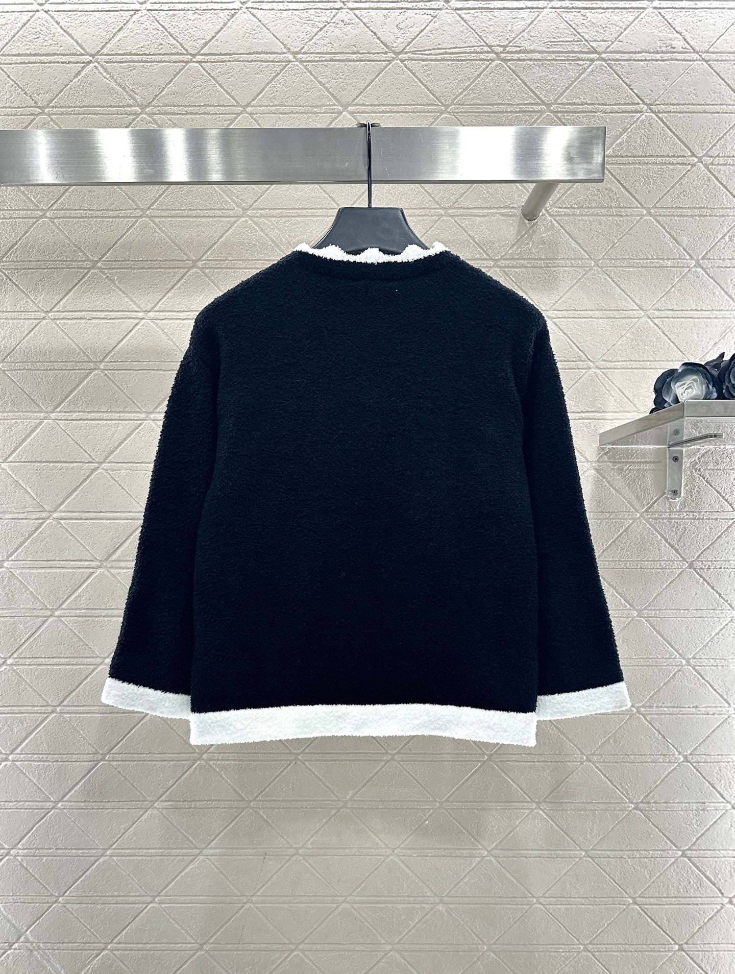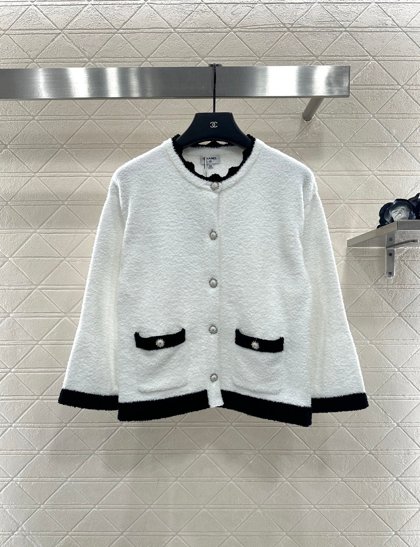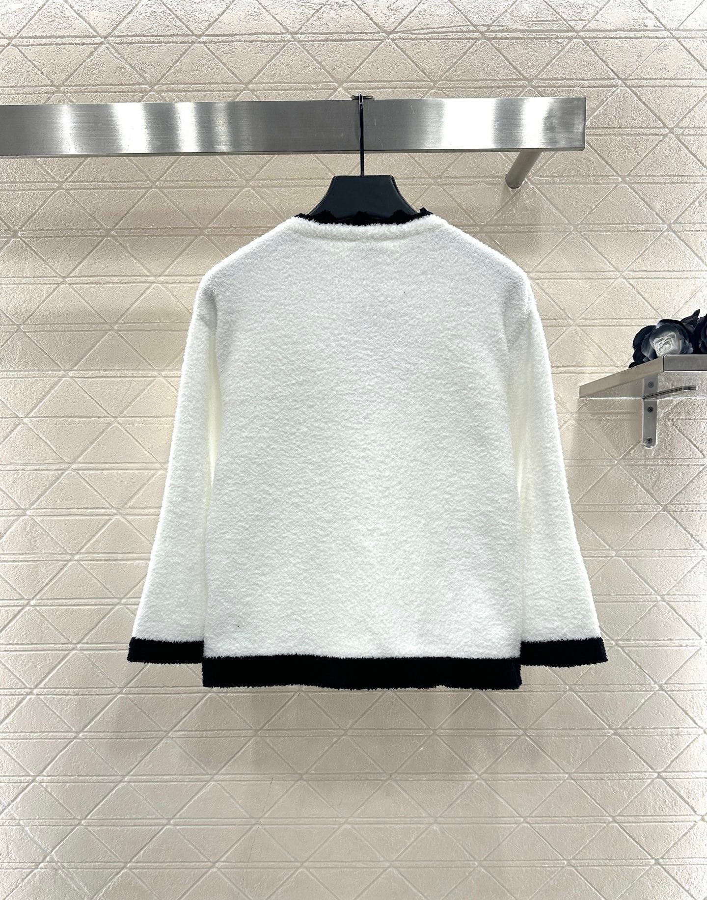 Weaved with silk and wool yarn, the texture is high-end and comfortable to wear. The button round neck knitted cardigan is cut in a simple and atmospheric manner, with black and white splicing and contrasting colors throughout the body. The collar is designed with wavy lace, and the threads echo the edges of the pockets. Paired with double C rhinestone flower round buttons, it highlights the understated and exquisite elements of simplicity. Paired with the same series of slightly flared wide leg knitted pants, the drawstring and elastic threads easily outline the waist, and the wavy contrasting color hem of the hem echoes, further enhancing the high-end texture. The complete set shows elegant temperament and fashionable style
