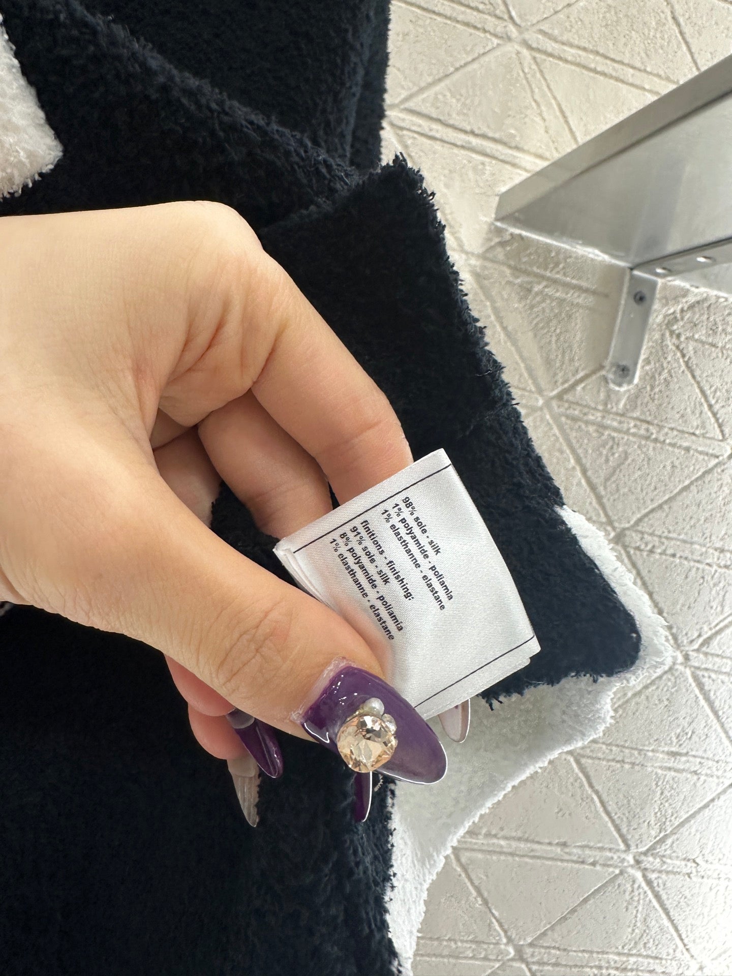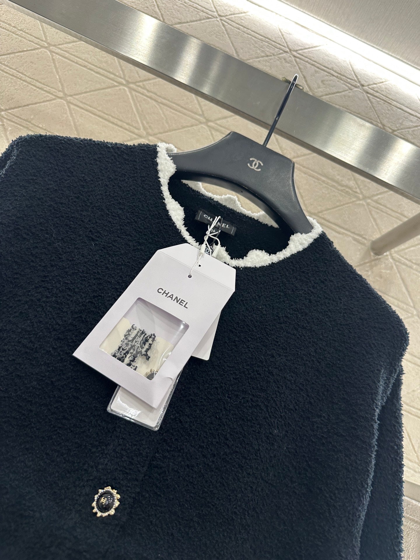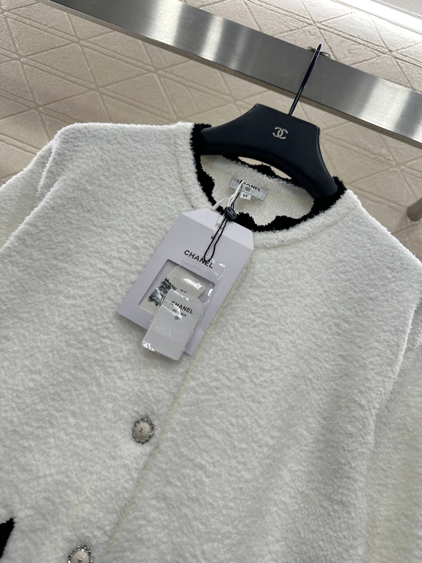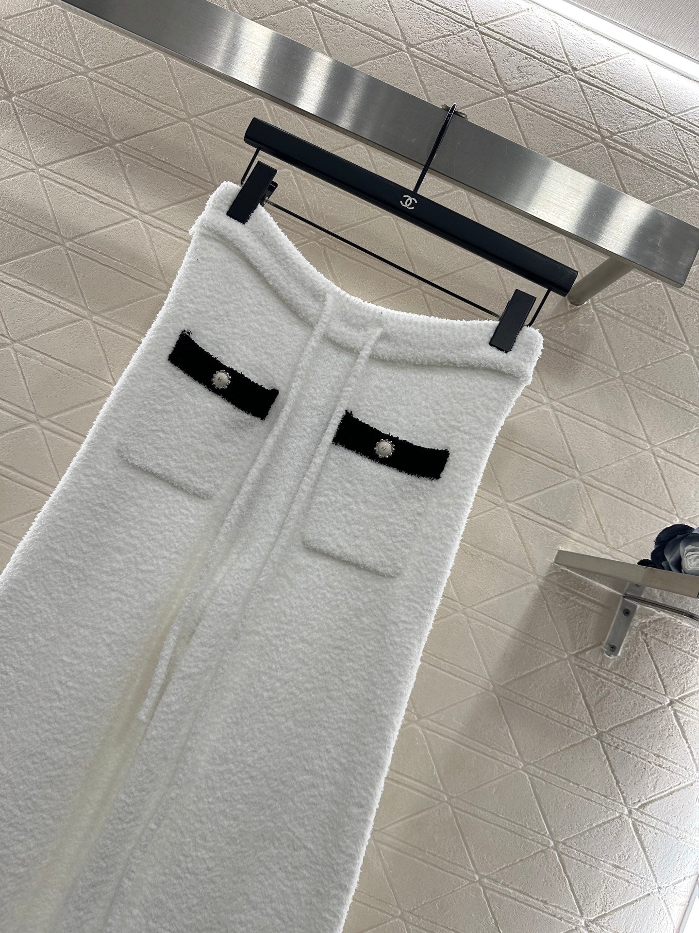 Weaved with silk and wool yarn, the texture is high-end and comfortable to wear. The button round neck knitted cardigan is cut in a simple and atmospheric manner, with black and white splicing and contrasting colors throughout the body. The collar is designed with wavy lace, and the threads echo the edges of the pockets. Paired with double C rhinestone flower round buttons, it highlights the understated and exquisite elements of simplicity. Paired with the same series of slightly flared wide leg knitted pants, the drawstring and elastic threads easily outline the waist, and the wavy contrasting color hem of the hem echoes, further enhancing the high-end texture. The complete set shows elegant temperament and fashionable style