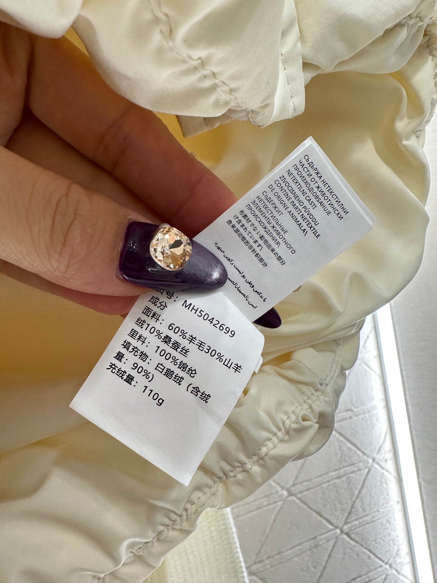 Windproof and waterproof nylon material, with upgraded material technology, enhances the function of keeping warm in autumn and winter. The interior is filled with white goose down, making the whole piece lightweight and warm. The torso is embossed with a rectangular grid, complemented by shirt style lapels and chest flap pockets for added practicality. Paired with two sleeves of spliced cashmere knit material, the layers collide and the design is rich and varied, highlighting a low-key and high-end feel. Exquisite details can successfully break free from dullness, combining warmth and fashion