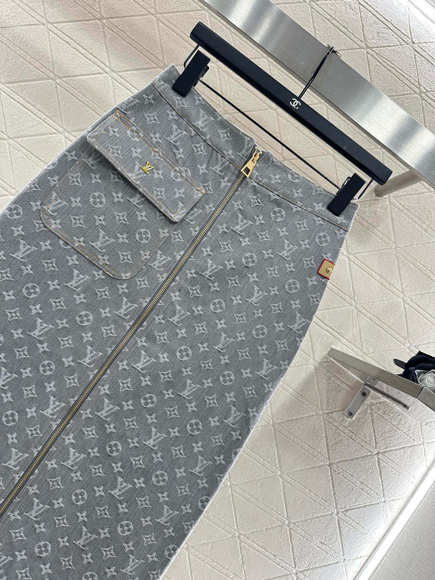 Twill cotton denim material texture is crisp and stylish, with a zippered jacket and a loose design with a shoulder drop and a collar. The whole body is washed with enzymes, evenly dyed, and covered with four leaf clover elements and letter jacquard retro vintage money. It is versatile and durable, suitable for autumn casual wear. The light colored leather label on the chest corresponds to the zipper buckle, and the same series straight tube mid length zipper half skirt has a three-dimensional cut flap pocket ➕ Metal letter logo