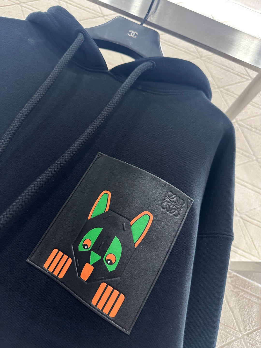 This collaboration series features 100% cotton fabric, showcasing superior quality and a visibly luxurious feel. The inner lining is made of short, looped fleece for added warmth. The hooded drawstring sweatshirt design includes a leather chest pocket, adorned with an embossed logo and contrasting cat pattern for a richer visual effect and a stylish look. The relaxed fit further enhances the overall appeal.