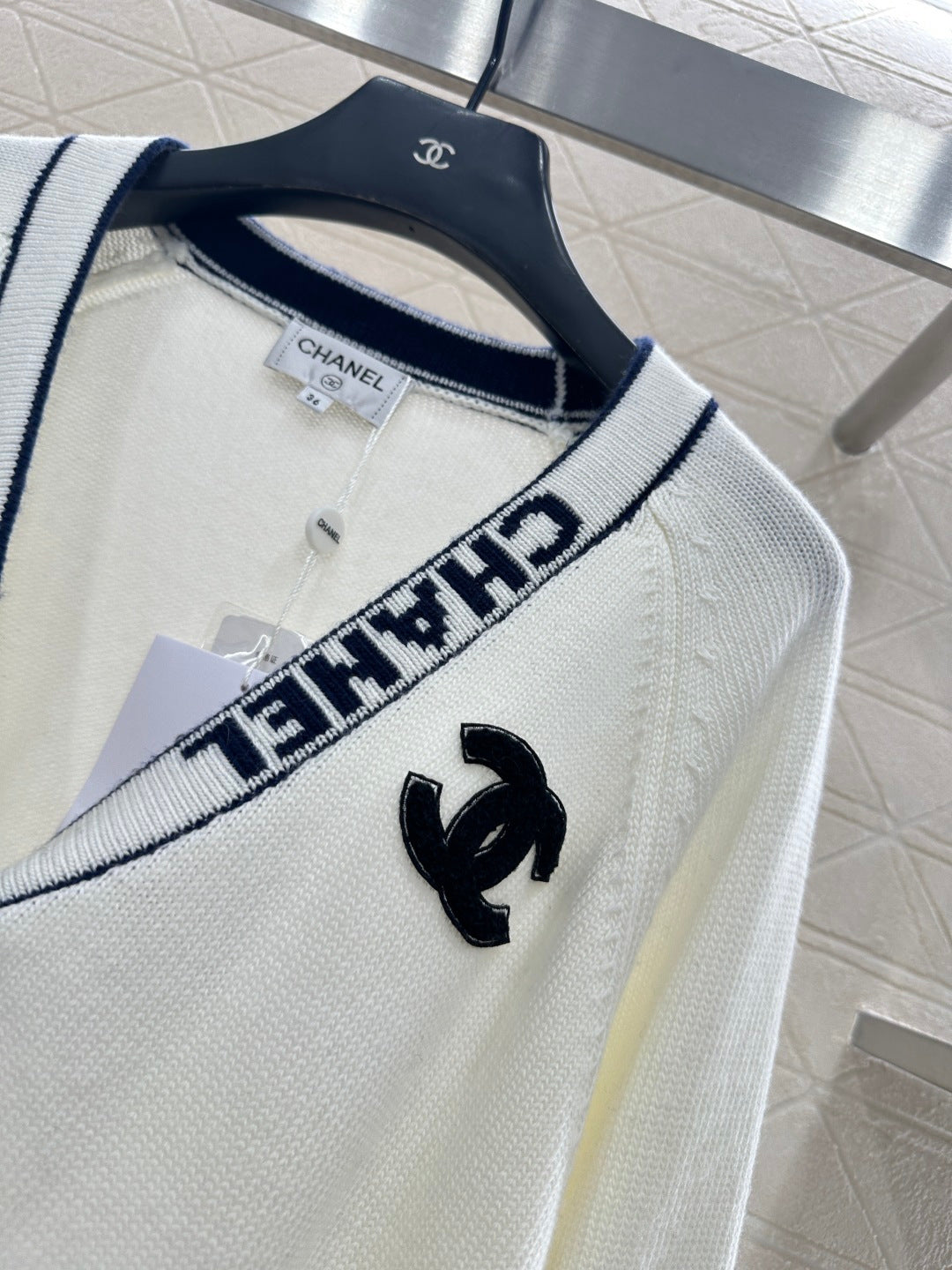 Wool yarn, finely knitted for a soft, comfortable feel against the skin. This V-neck cardigan features a delicate design with round buttons, double C embellishments, pearls, and camellias on the front, complemented by crocheted lettering on the collar and front, and flocked double C embellishments on the chest, enhancing its fashionable appeal.
