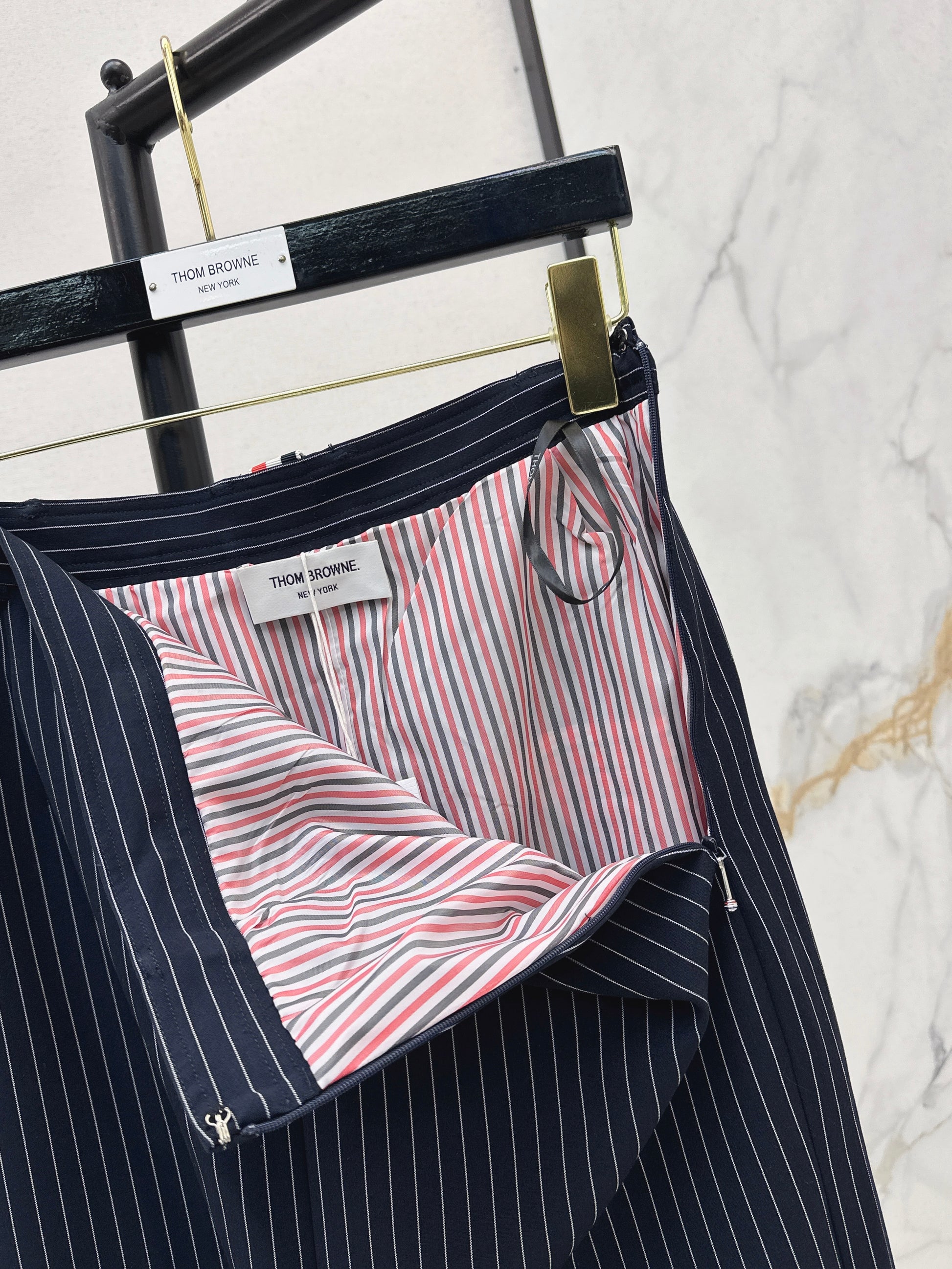 The navy blue striped fabric with stripes and a silhouette creates a seamless and streamlined silhouette. The skirt features a short pleated design that optimizes the body proportions, making it stand out with long legs. Seoul transfer students feel a sense of age reduction and a sense of ruggedness