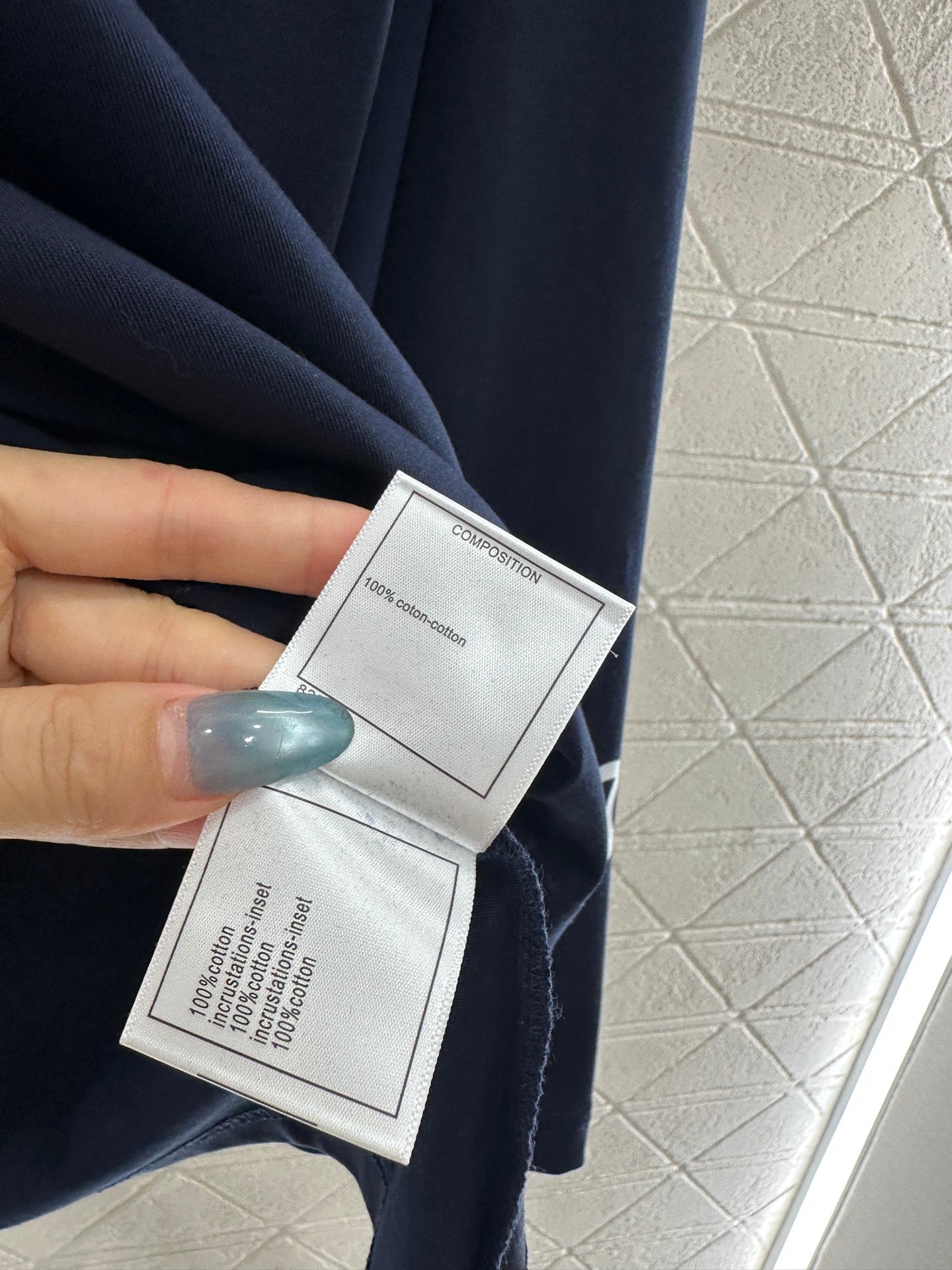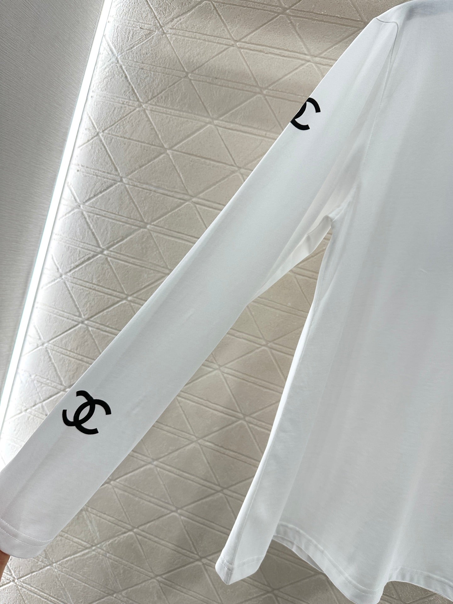 Made of all cotton material with delicate texture, comfortable to wear. The loose long sleeved top is trimmed with a rhinestone double-C metal logo decoration in the center of the chest, which echoes the print on the sleeves and back, highlighting the brand style. It has a strong sense of elasticity and relaxation, visually narrowing and elongating, slim fitting and slimming, and is fashionable when worn alone.