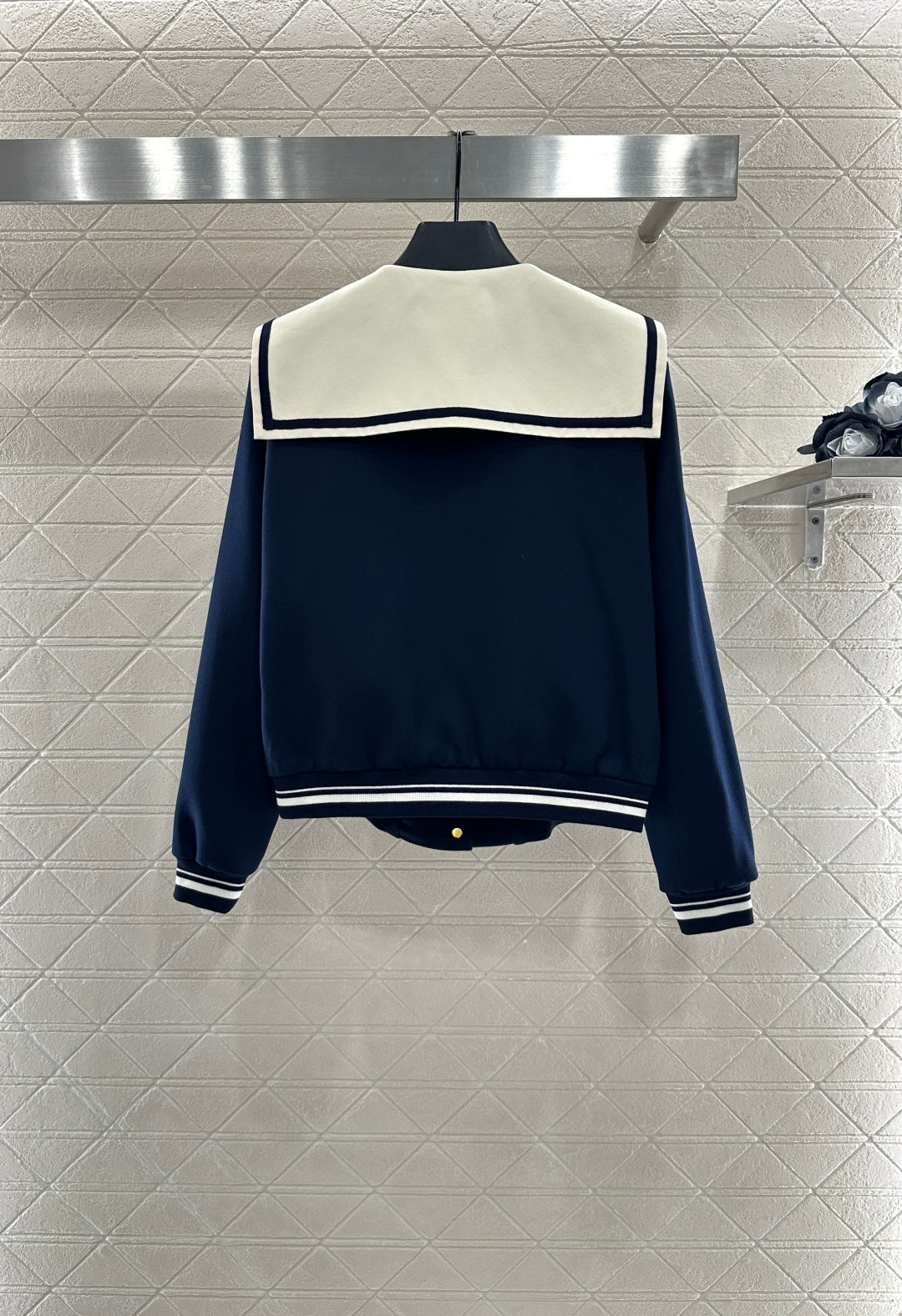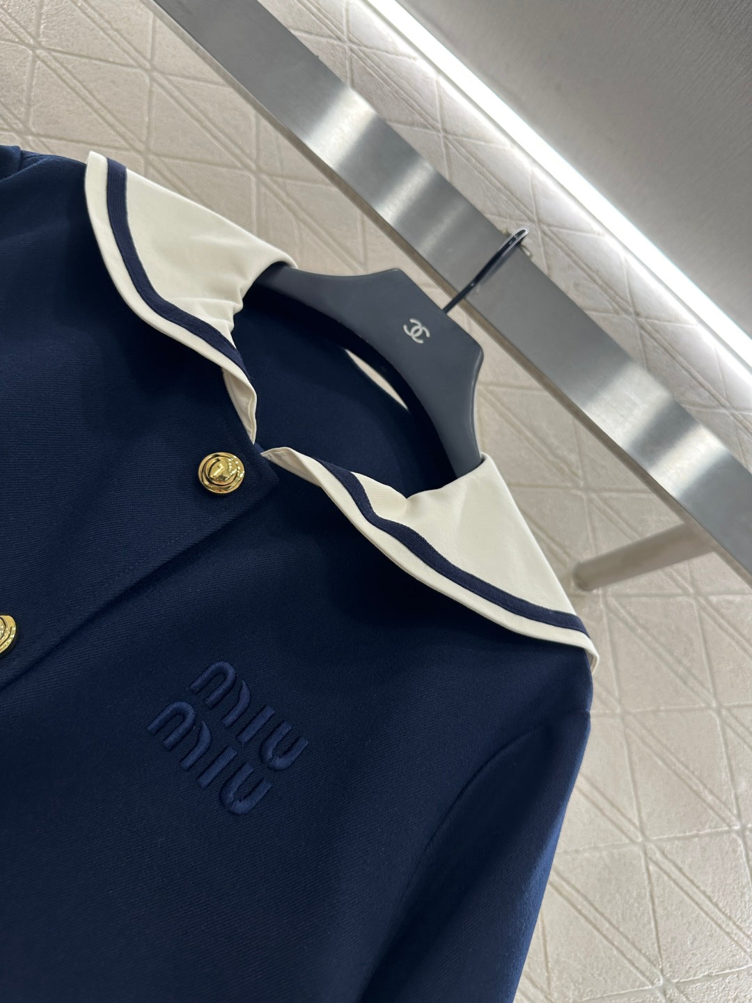 Imported material texture, glossy and comfortable shawl lapel button coat cut, large body navy blue color matching with shawl collar and blue and white cuffs, fully showing the charm of the navy style, adding sweetness, chest embellishment, letter embroidery, increasing brand style, matched with the same series of pleated short skirts, waist and abdomen pressed pleat stickers, full of Korean style