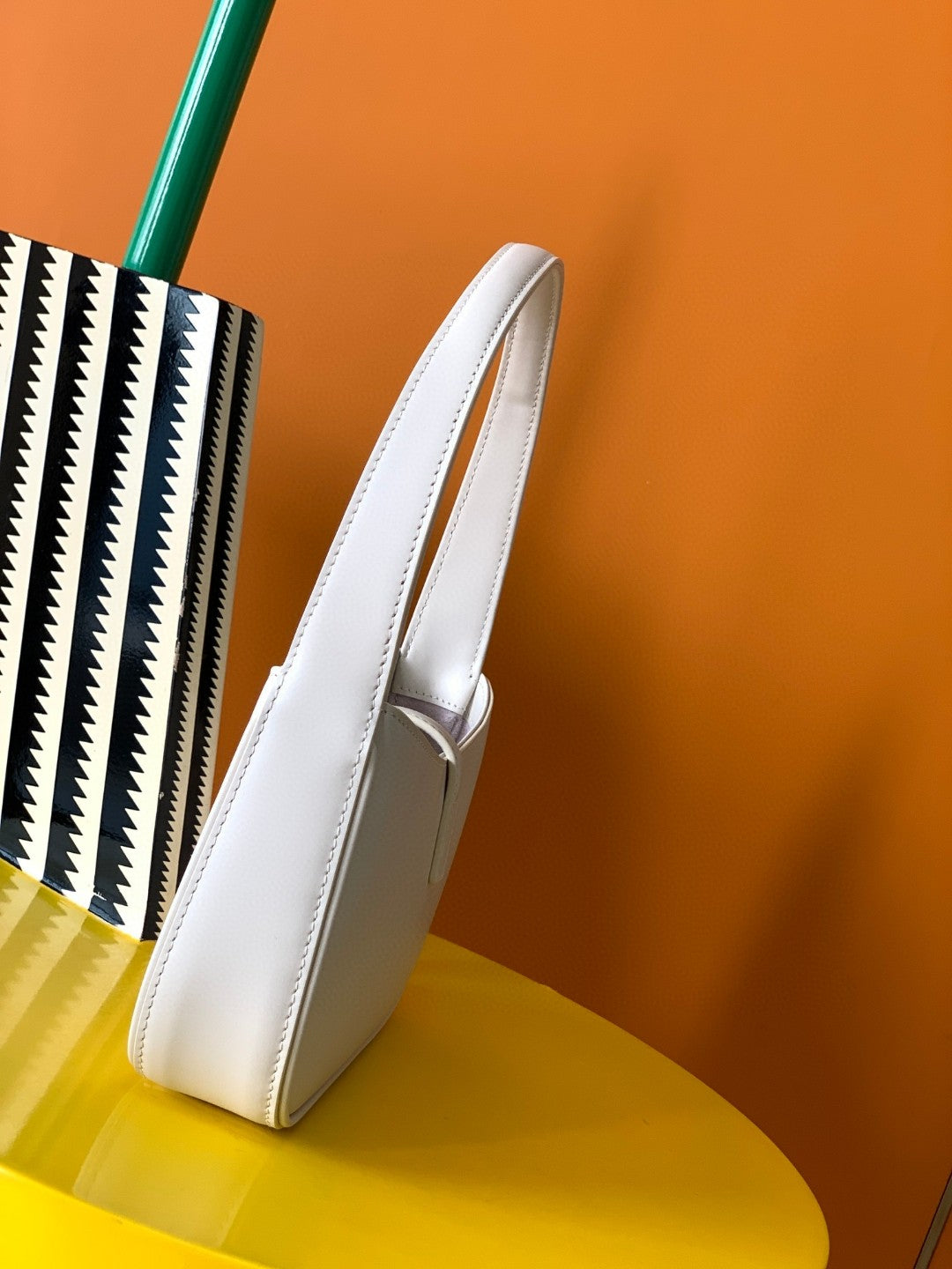 LE 5 À 7 MINI WITH A LEATHER TAB FASTENING, CASSANDRE EMBELLISHMENT AND MATCHING SUEDE LINING.
