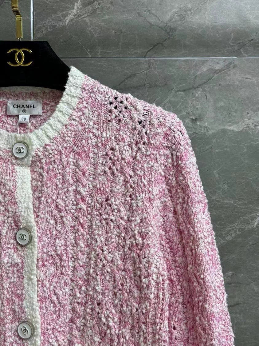 Round neckline design, tweed hollow weave pattern, double C button decoration, exquisite and fashionable, custom-woven and dyed cotton yarn, soft and comfortable, short version, slim and elegant upper body