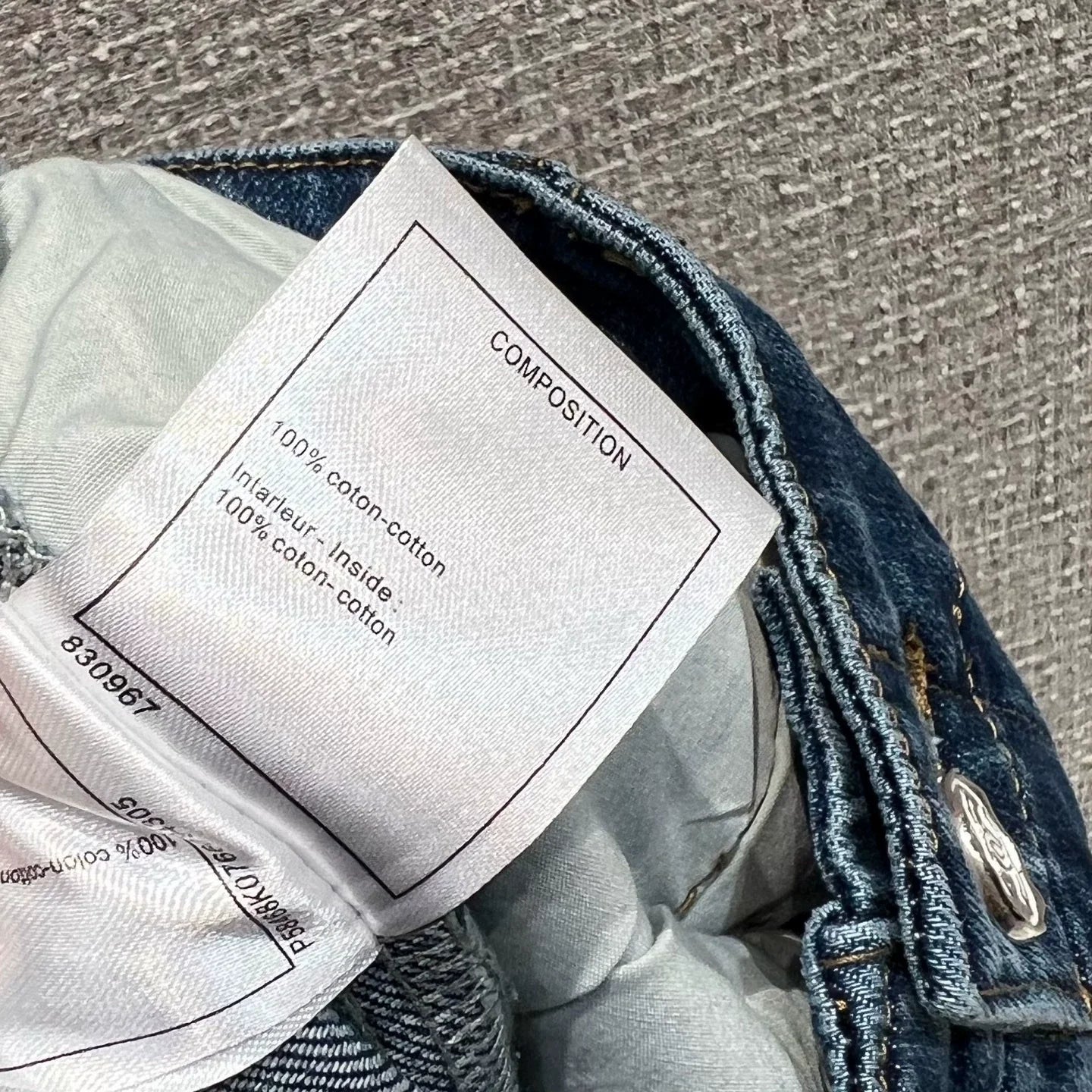 Made from distressed denim fabric with pearl and rhinestone woven details on the pockets, the vintage blue hue exudes a sophisticated, timeless charm. Soft and comfortable against the skin yet retaining its shape, the high-waisted, wide-leg cut cleverly elongates the legs, flattering all leg types and effortlessly creating a sophisticated look for every occasion.