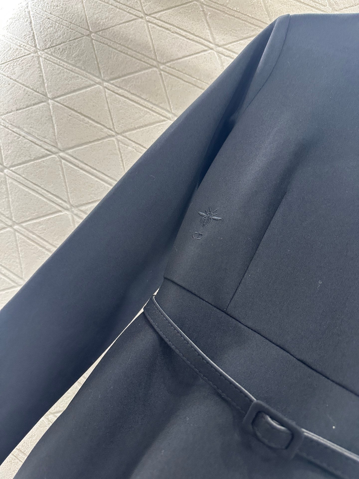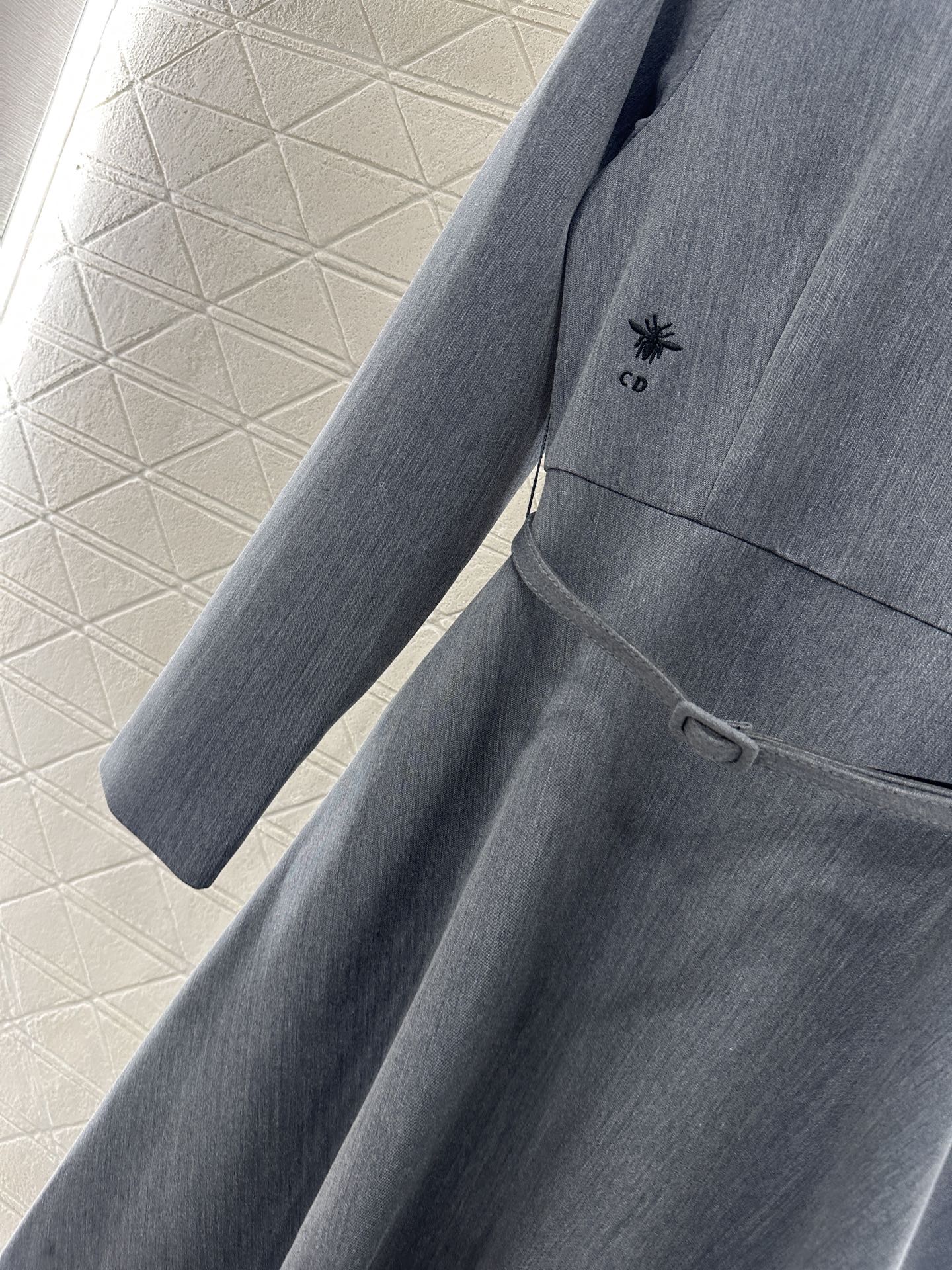 Cotton wool material, delicate texture, stylish drape, long sleeved round neck dress cut, using cutting and details to enhance delicacy, surrounded by pearls scattered around the collar, the design of the shoulder sleeves is atmospheric and elegant, and the belt of this fabric is matched with three-dimensional cutting and pleating to outline the body shape, highlighting the beauty of women's curves. Combined with the embroidered bee CD logo, it low-key highlights the luxurious tone, enhances the charm of softness, and the umbrella shaped large skirt easily outlines the graceful body shape, showing the overall intellectual temperament and inclusive body shape. The upper body is simple and high-end.
