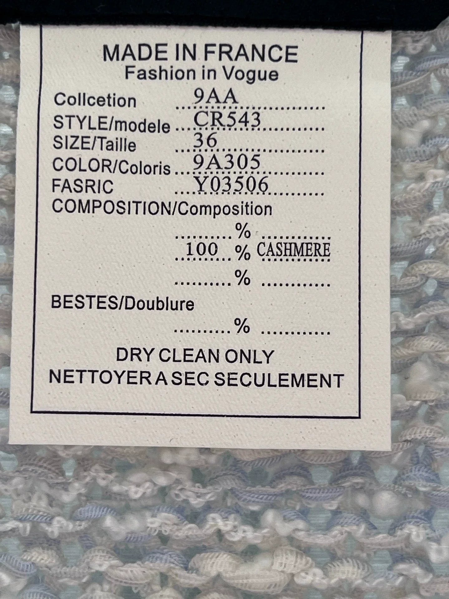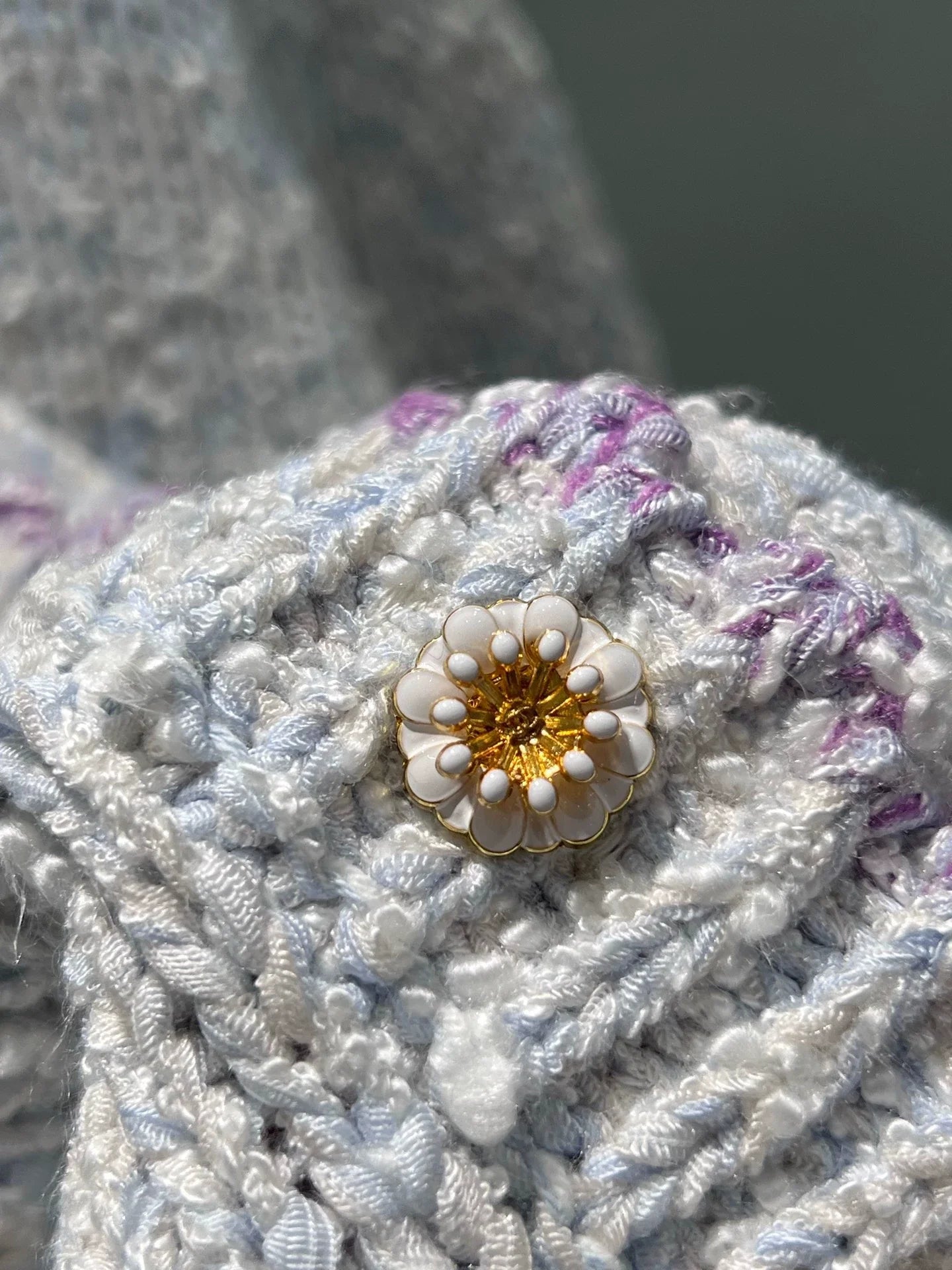 The light blue mixed-tone knit fabric is embellished with subtle shimmering elements, exuding a sophisticated sheen in an understated way. The V-neck design is paired with contrasting purple frayed trim, while the metallic buttons on the front and the side pockets add a touch of elegance and relaxed sophistication.