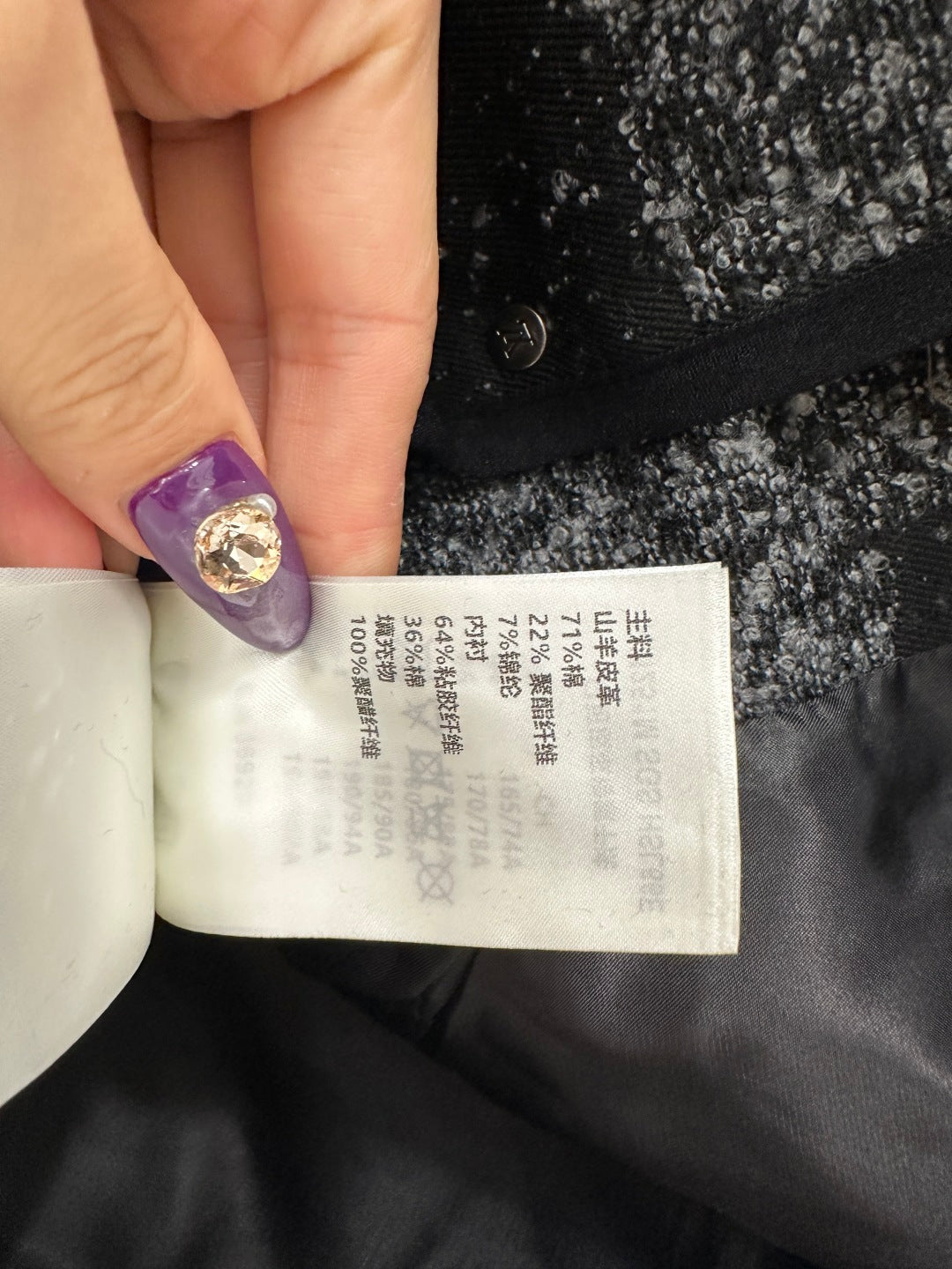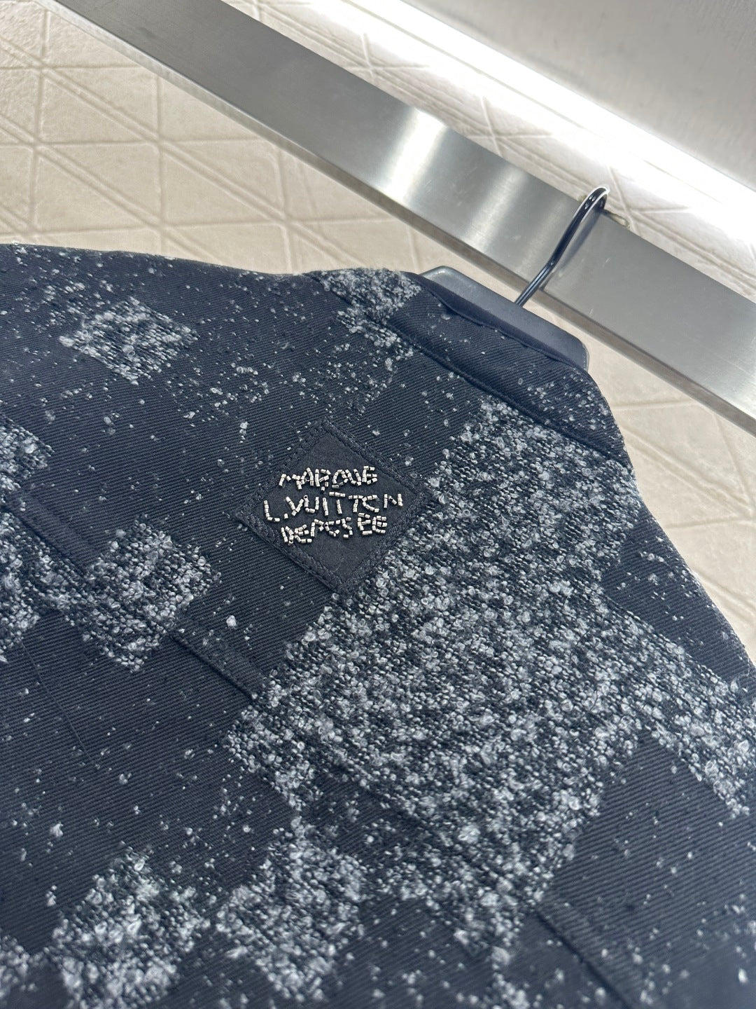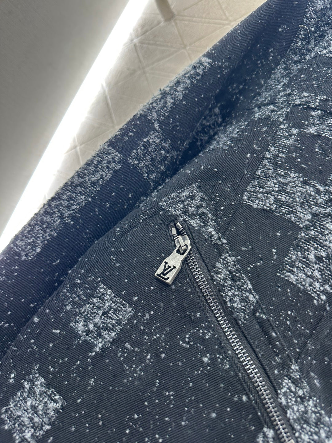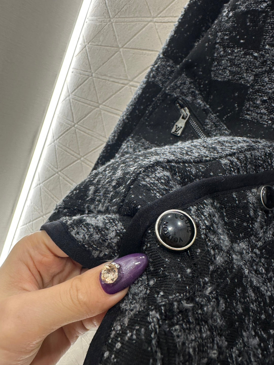 Jacquard cotton material, high-end heavy industry, full of appearance, small stand up collar jacket cut, black and gray throughout the body with alternating shades to create an irregular checkerboard pattern shape. The back collar is fixed with nail bead embroidery, outlining a three-dimensional letter logo decoration, presenting the brand concept, echoing the details of the open button and zipper pocket