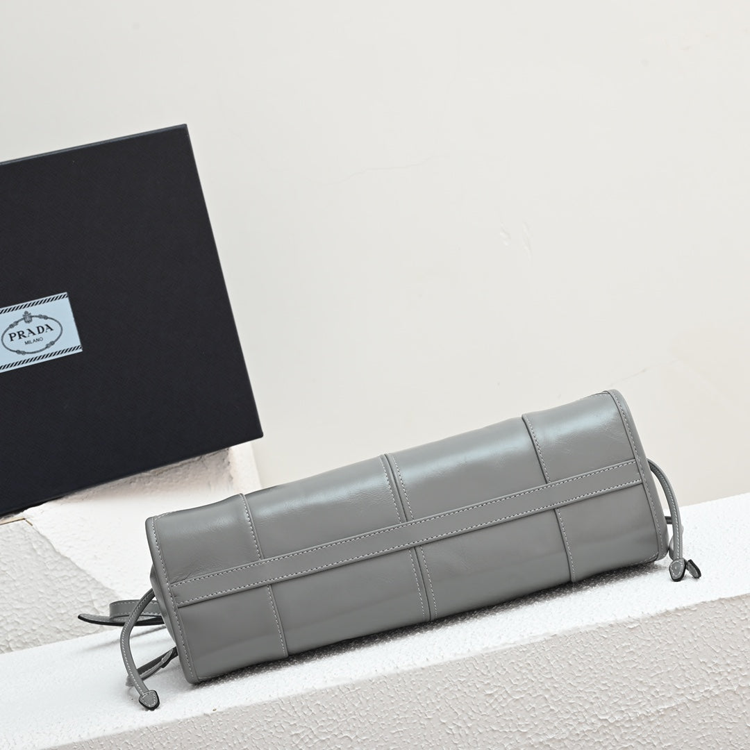 This pragmatic and refined handbag is made of soft leather with a glossy finish that emphasizes its versatile, modern allure. The geometric design blends different influences into one style with a distinctive but sleek aesthetic. Embellished by the sophisticated strap detail, the rectangular silhouette has zipper pockets inside. The enameled metal triangle logo completes the look with its iconic signature.