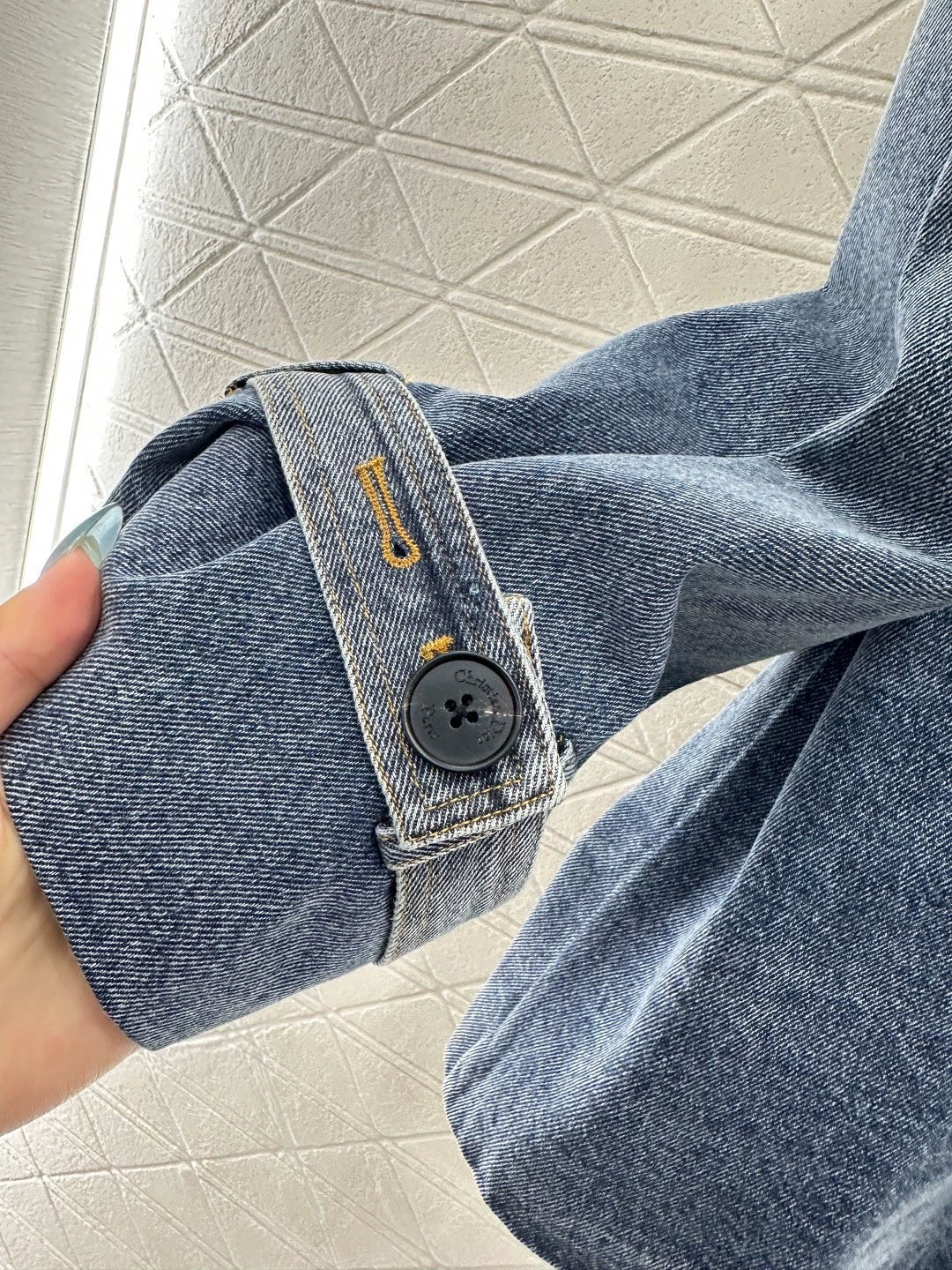 The twill cotton denim material is crisp and stylish, washed with enzymes, presenting a gradient polished white effect of tannin retro blue. The collar denim trench coat is fixed to the front chest on one side, with letters printed on the lining to showcase the brand's style. The perforated waistband design cleverly outlines the waistline, and the shoulder cuff buckle echoes, making it even more stylish. Whether paired with casual pants or elegant skirts, it can easily create a fashionable look