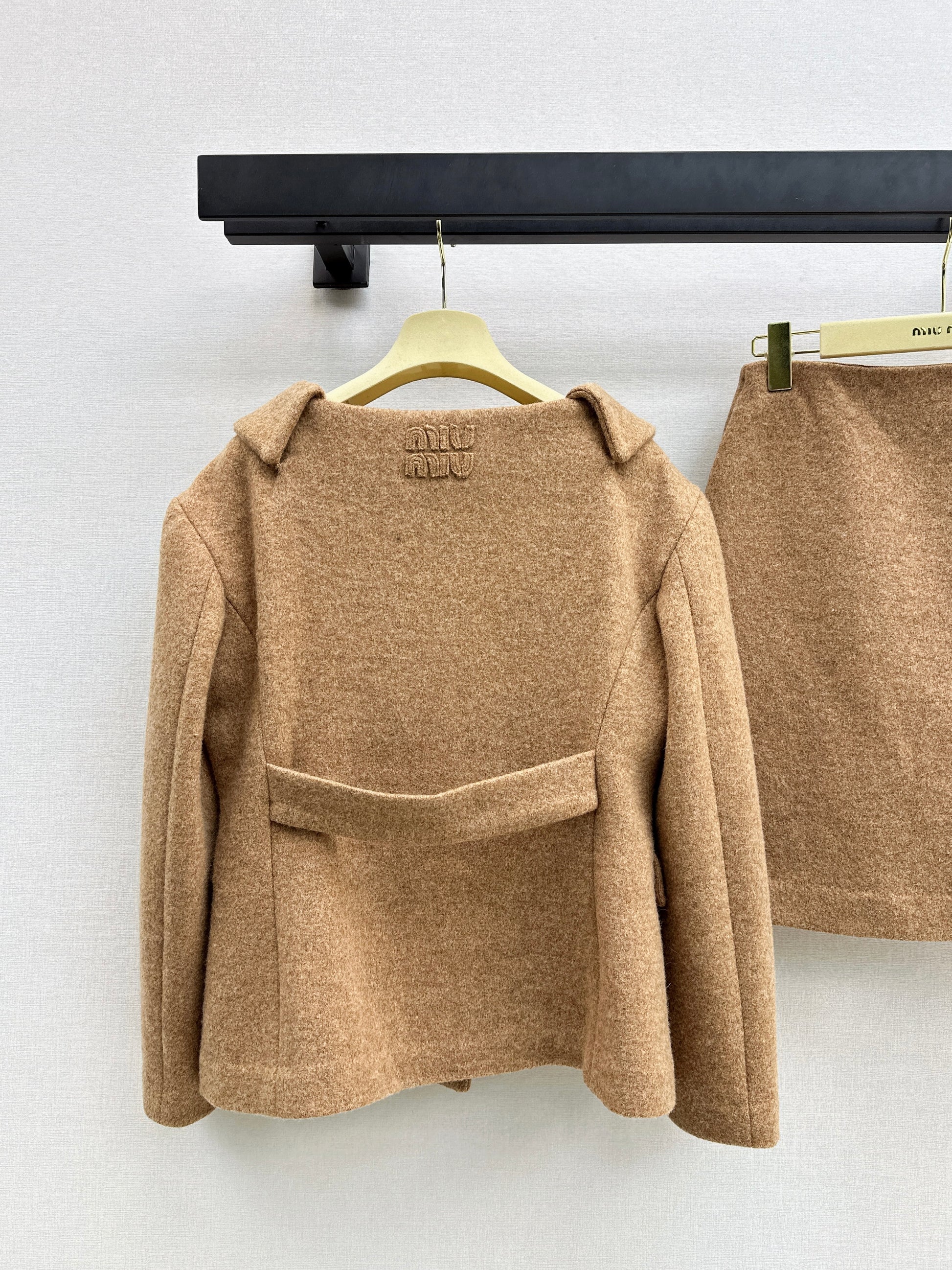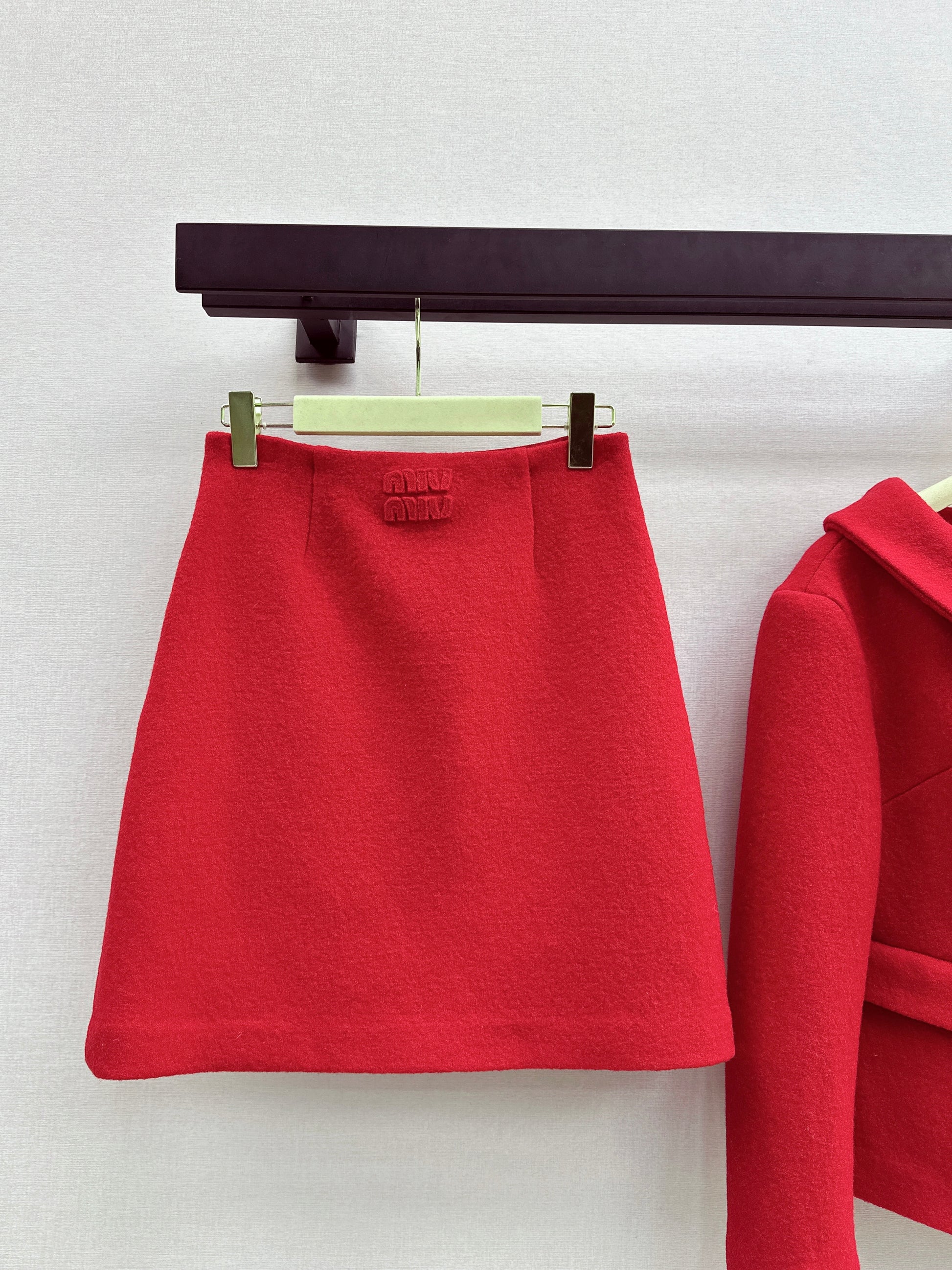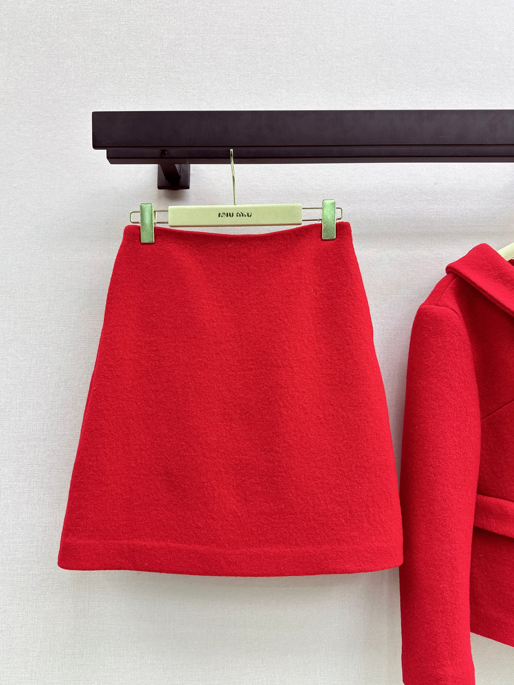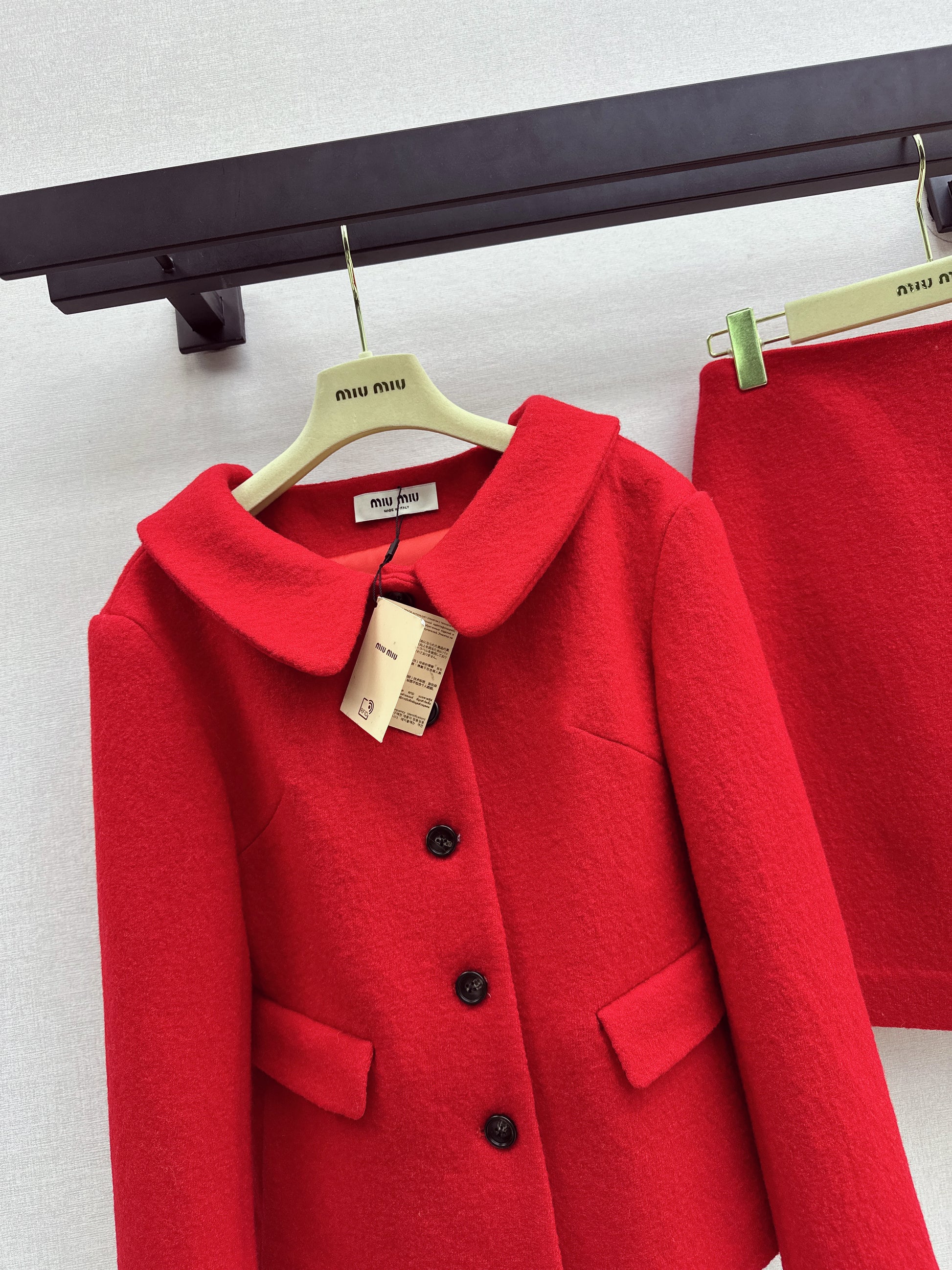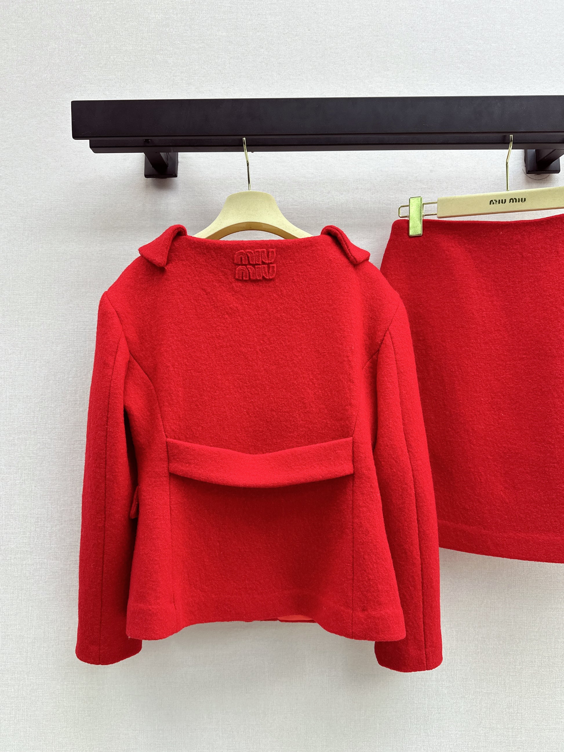 Woolen fabric, with a strong and eye-catching bright red color tone, and a cute and retro design with a large lapel. The button arrangement of the single-sided slanted collar breaks the conventional symmetry and injects Miu style rebellion into the classic style; The waist cinching cut accurately outlines the waistline, and the retro silhouette of the pockets on both sides