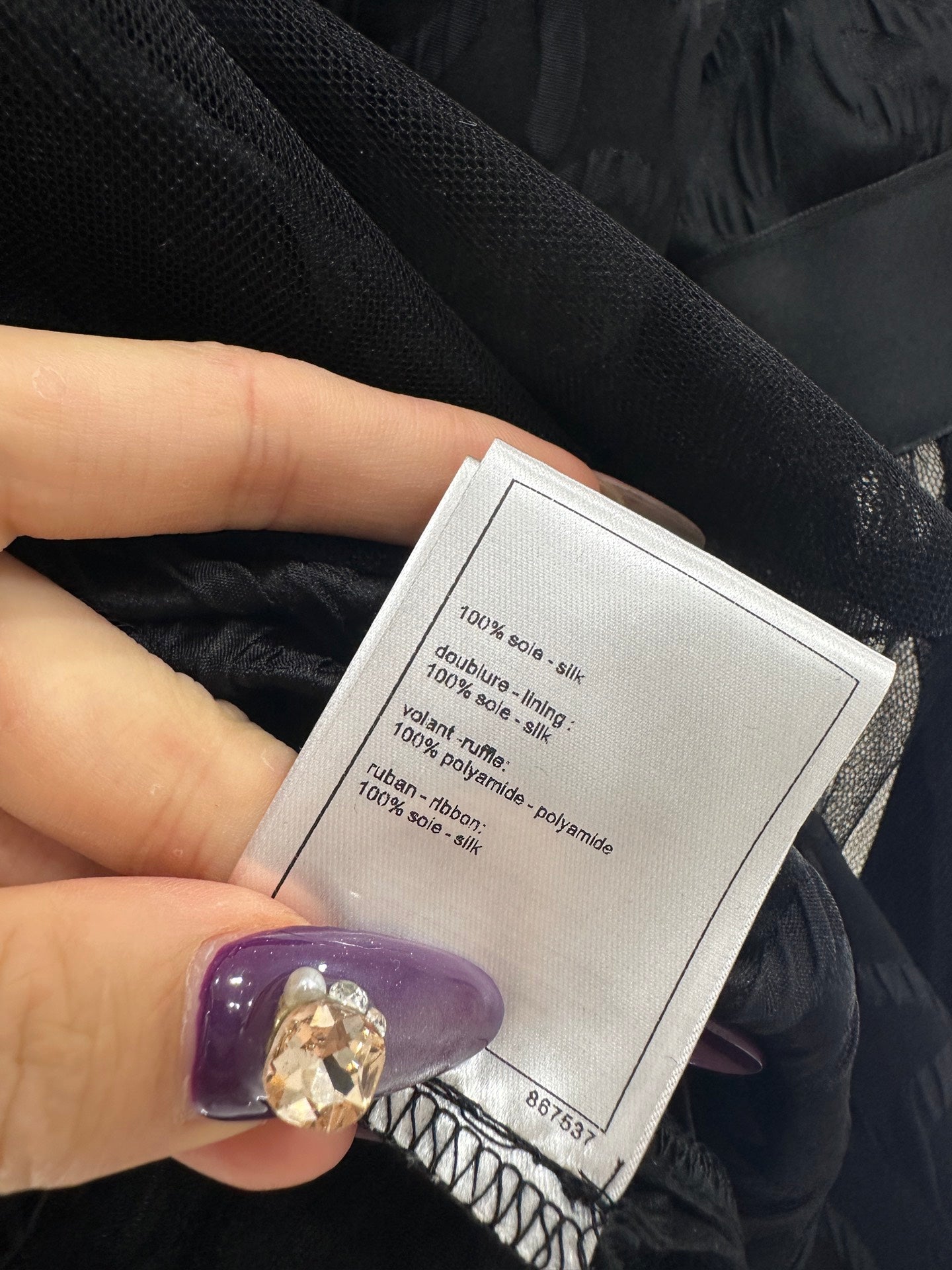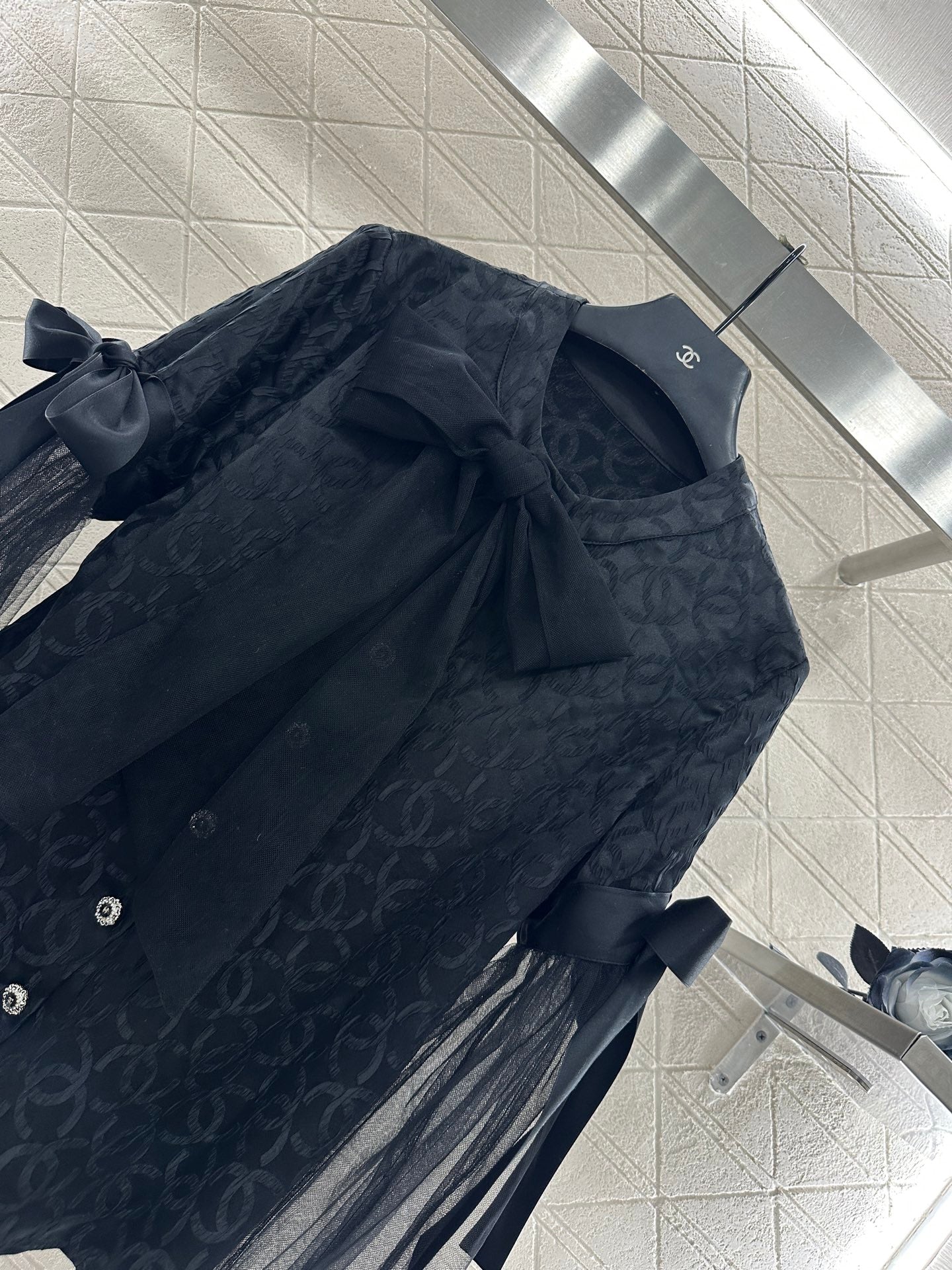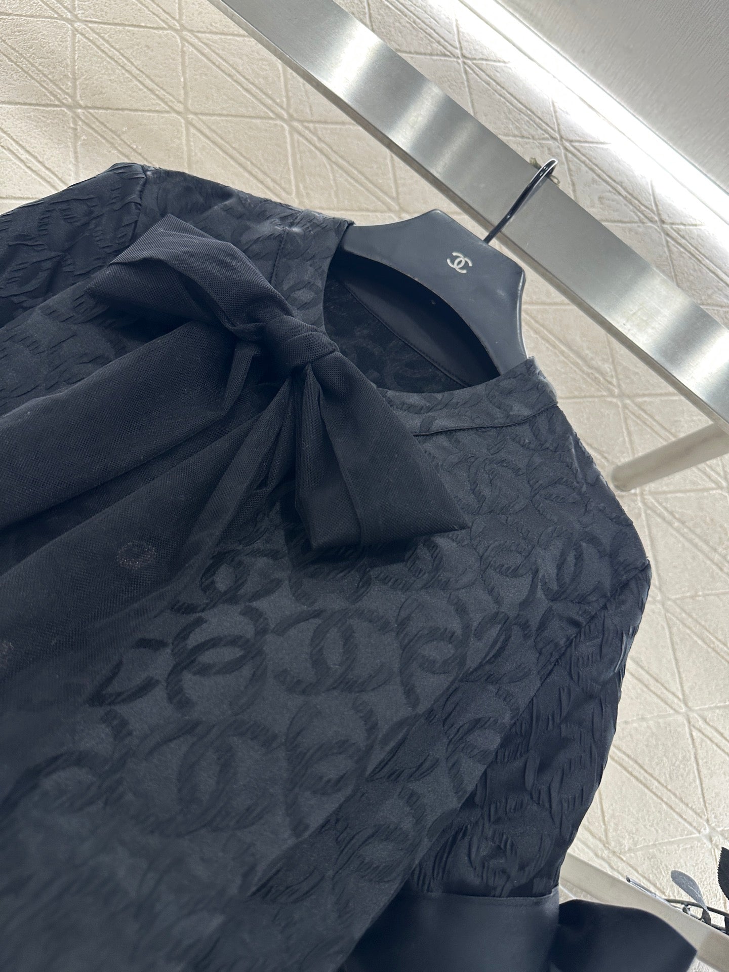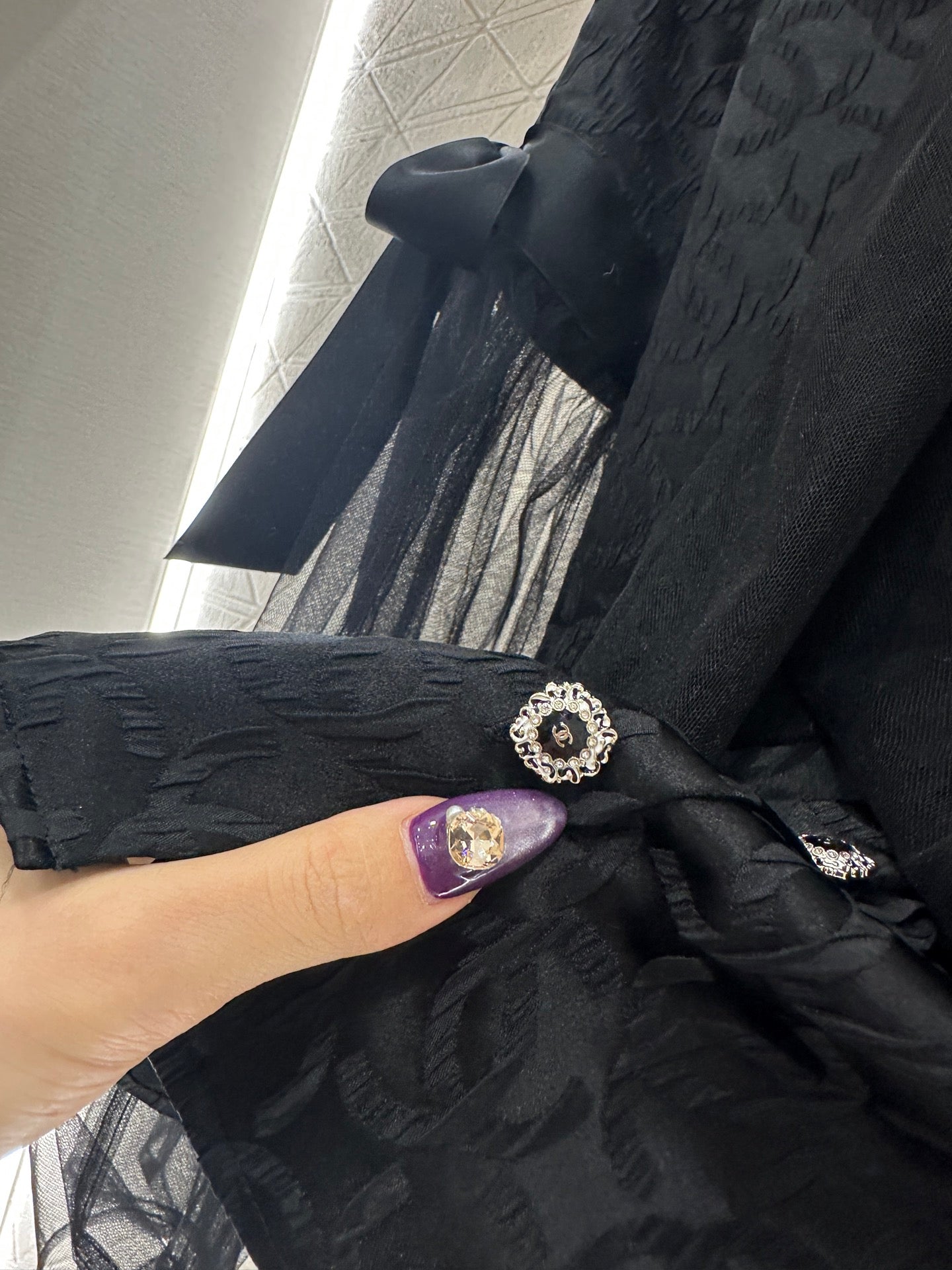 Satin silk material, high-end texture, elegant temperament, round neck top cut, full body double C jacquard dark pattern treatment, collar ribbon butterfly knot embellishment, rich layers, tranquil temperament, silk yarn design at the elbow position ➕ The butterfly knot embellishment echoes, the trumpet shaped outer sleeve edge, and the slightly transparent gauze texture are light and elegant, adding a European court luxurious atmosphere. It is a suitable item for daily use or banquets, with an elegant upper body temperament