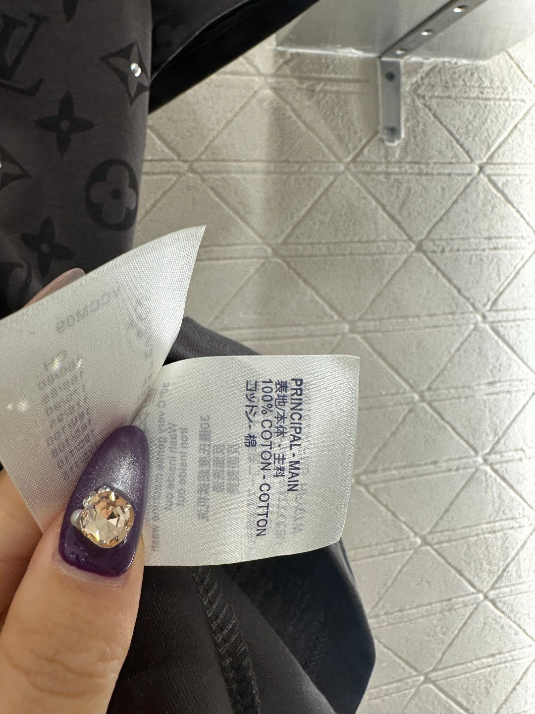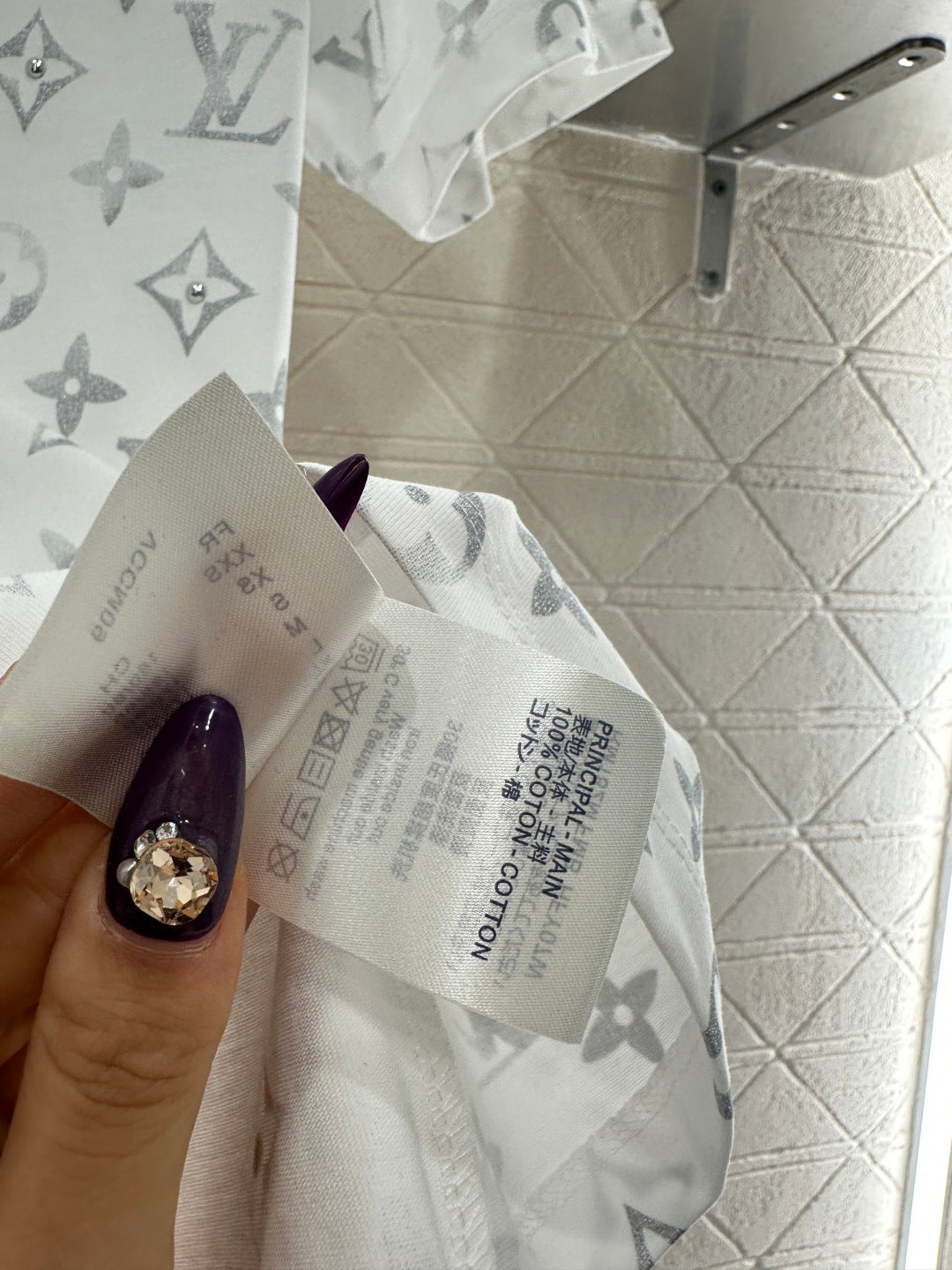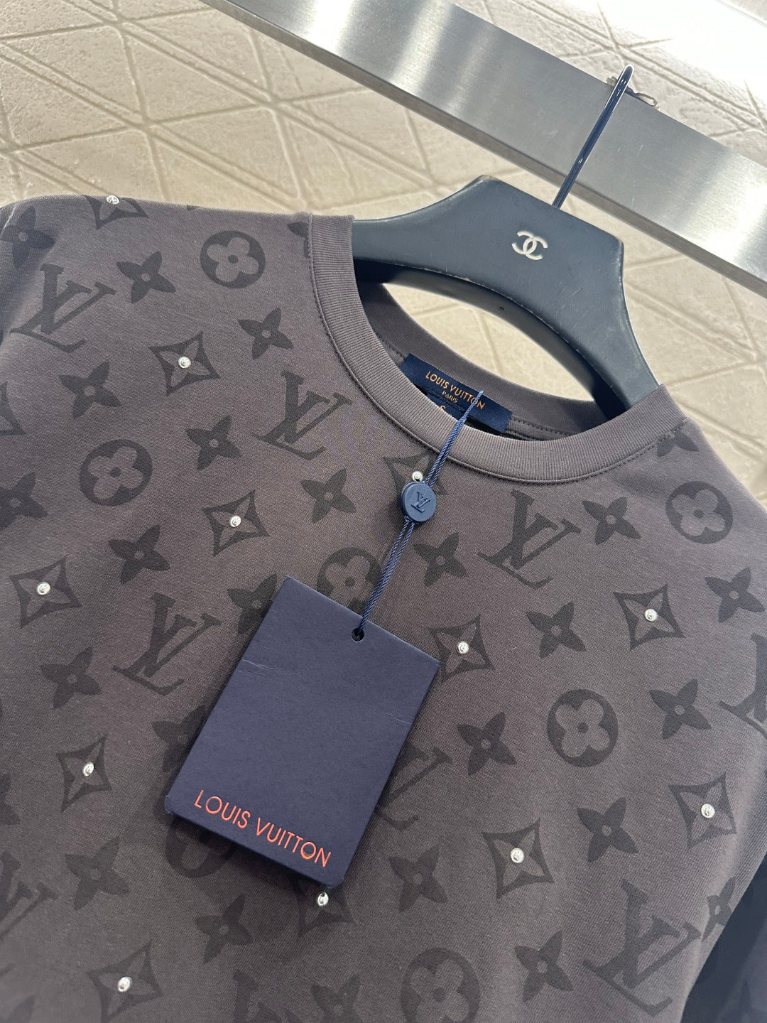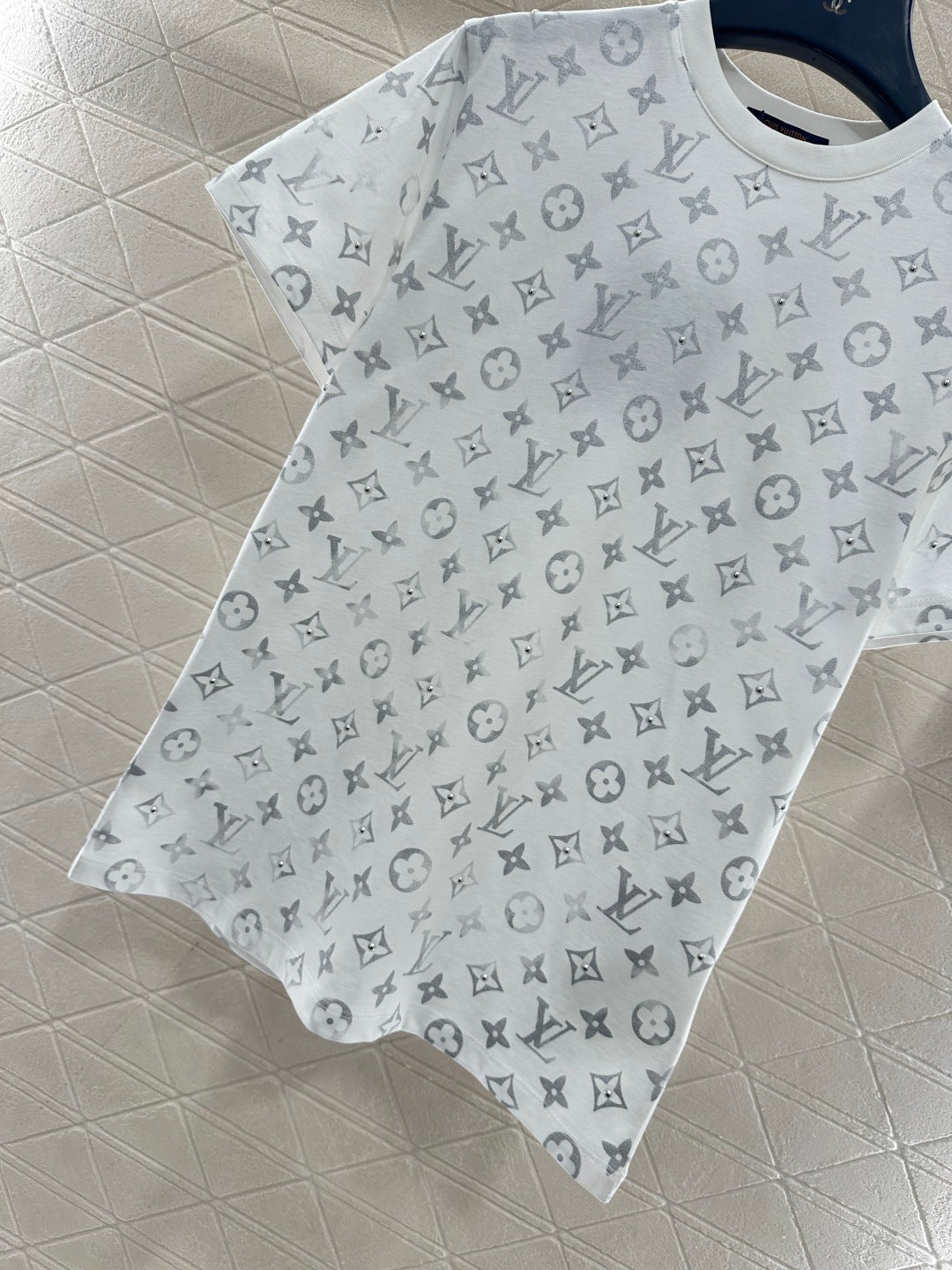 Made of all cotton material, breathable and comfortable, with a rich texture. The regular loose short sleeved cut highlights the brand's style. Made of heavyweight pure cotton with slight elasticity, it presents a slimming visual effect. The whole body is covered with four leaf clover letter jacquard, interspersed with willow nail bead decoration, reflecting light and showing a high-end style. It is fashionable and eye-catching when worn alone or on the inside