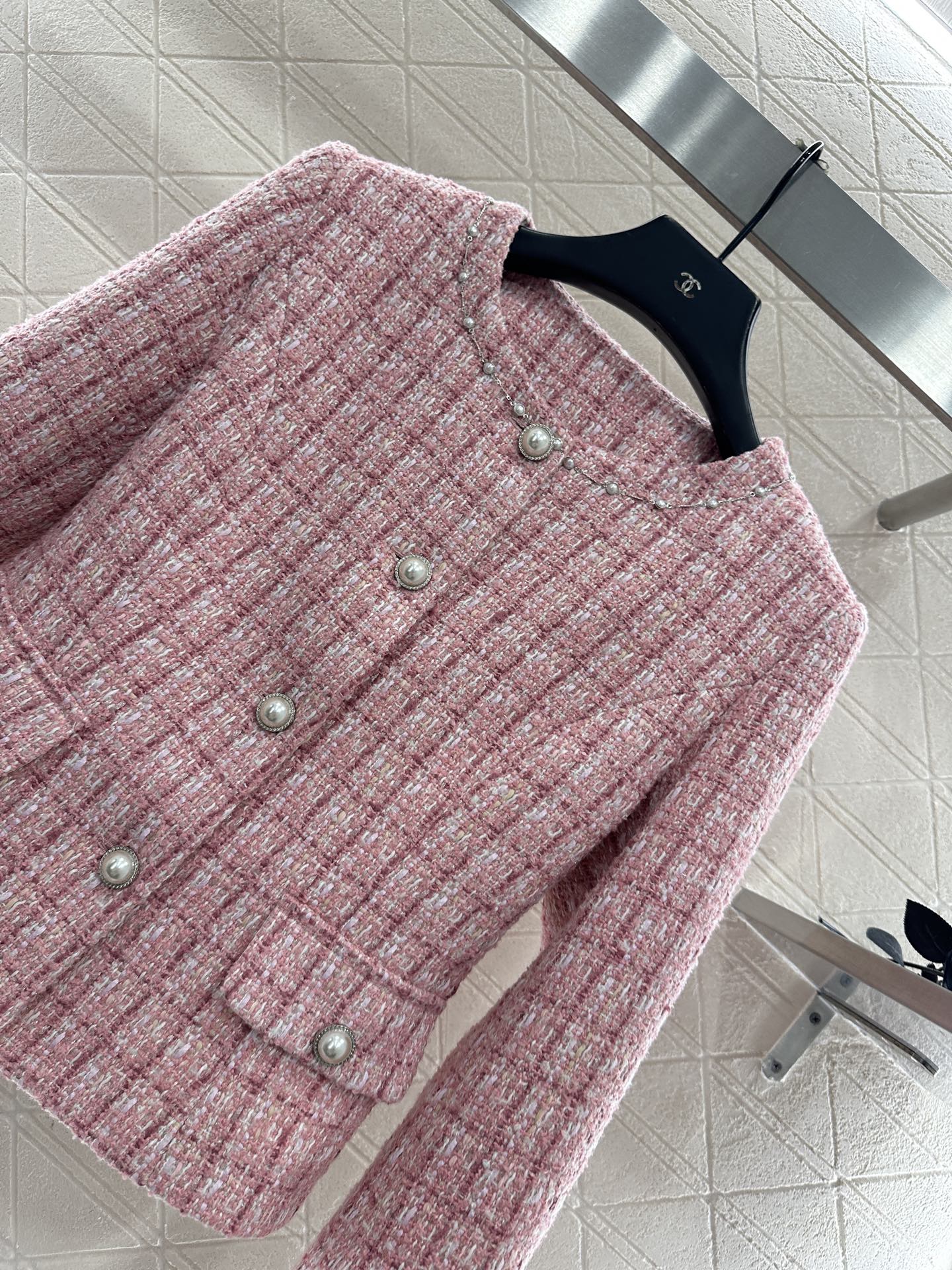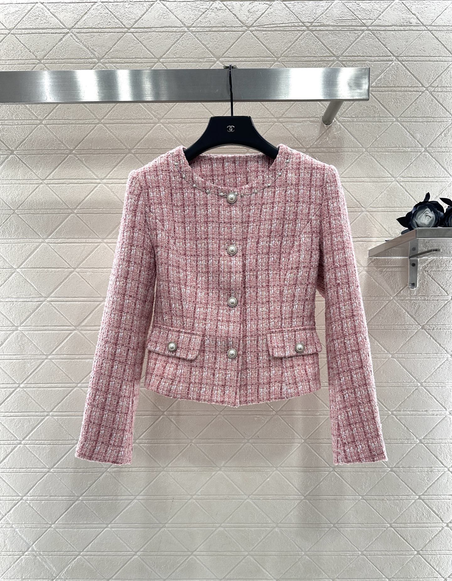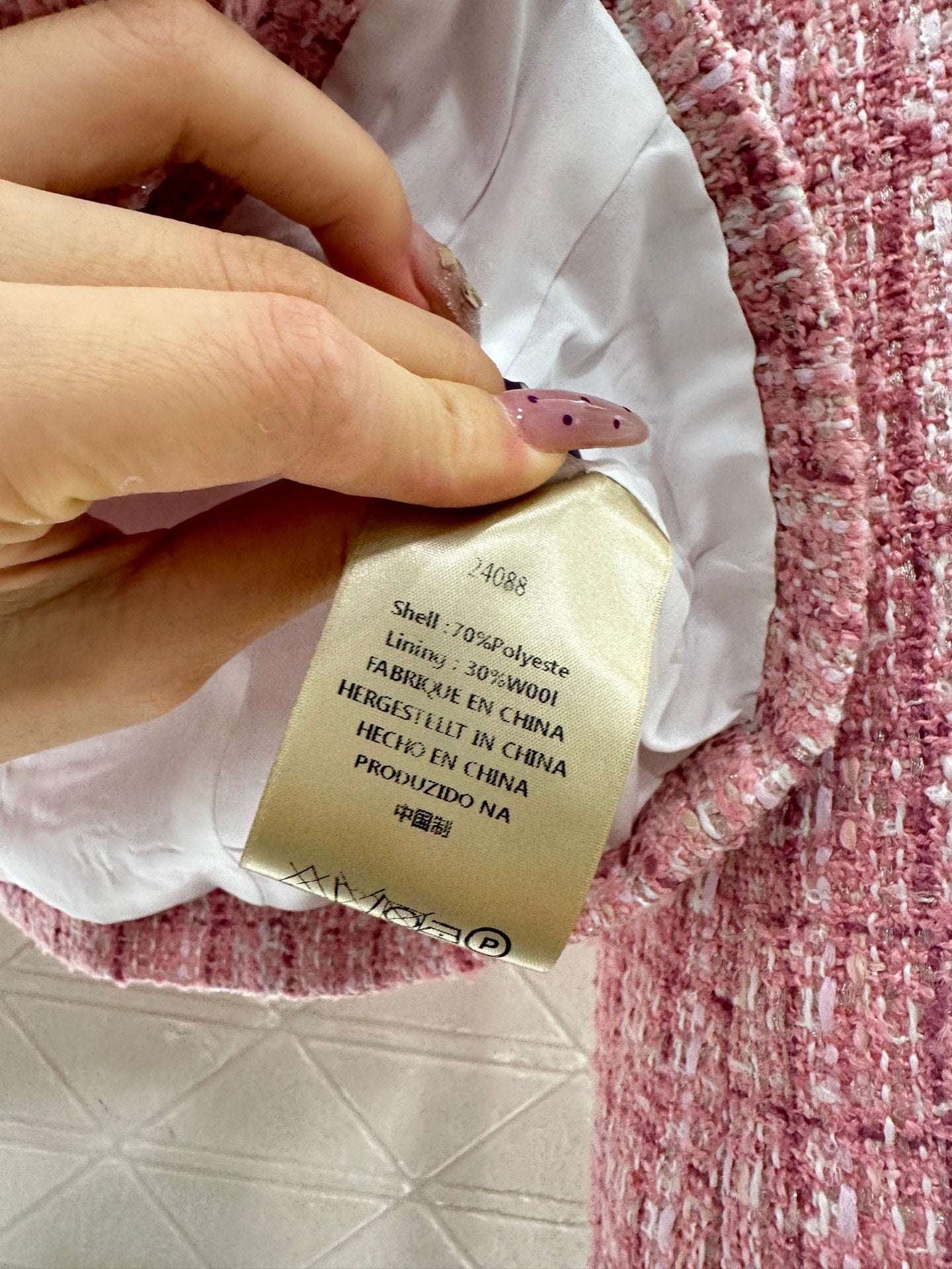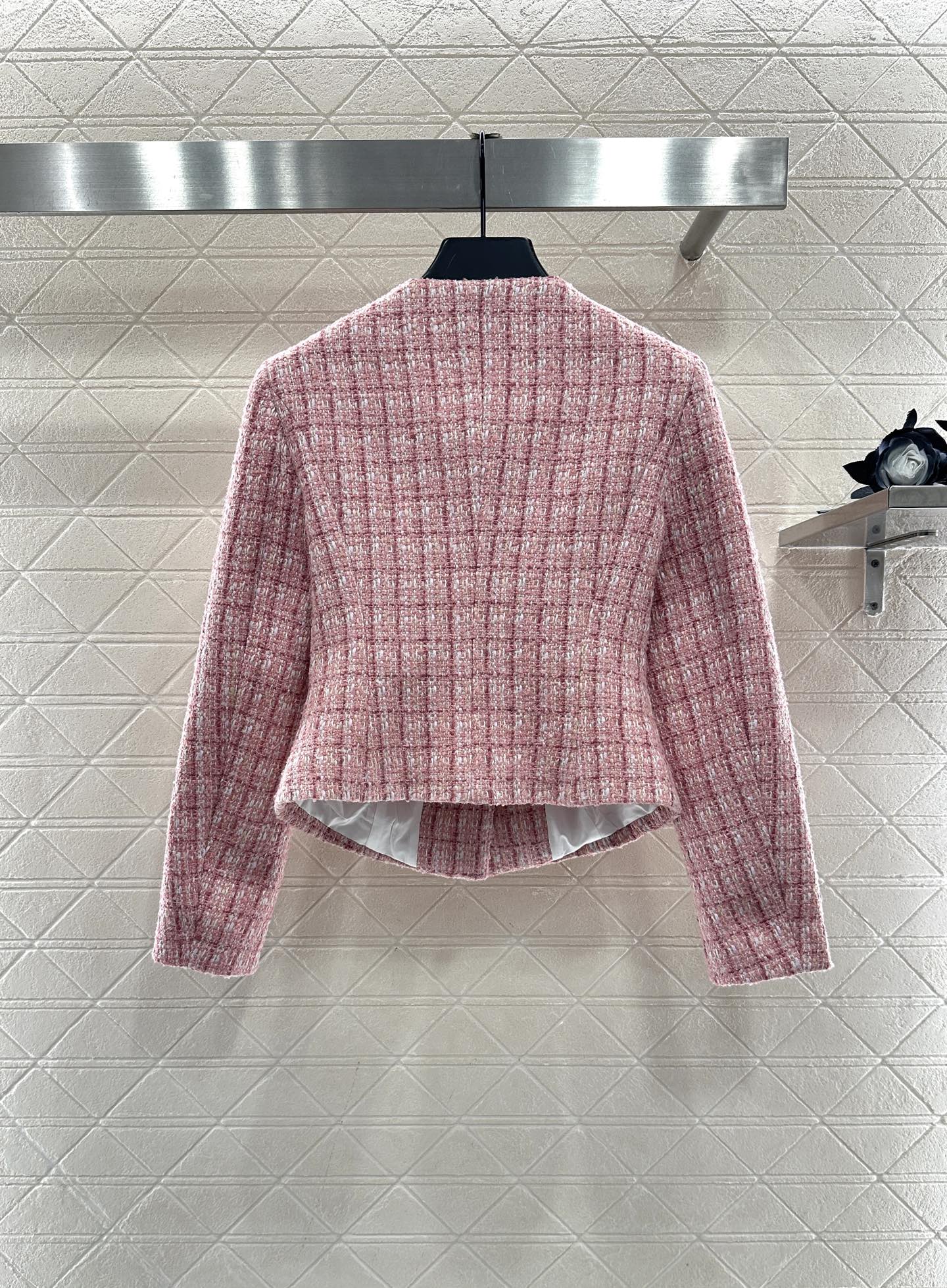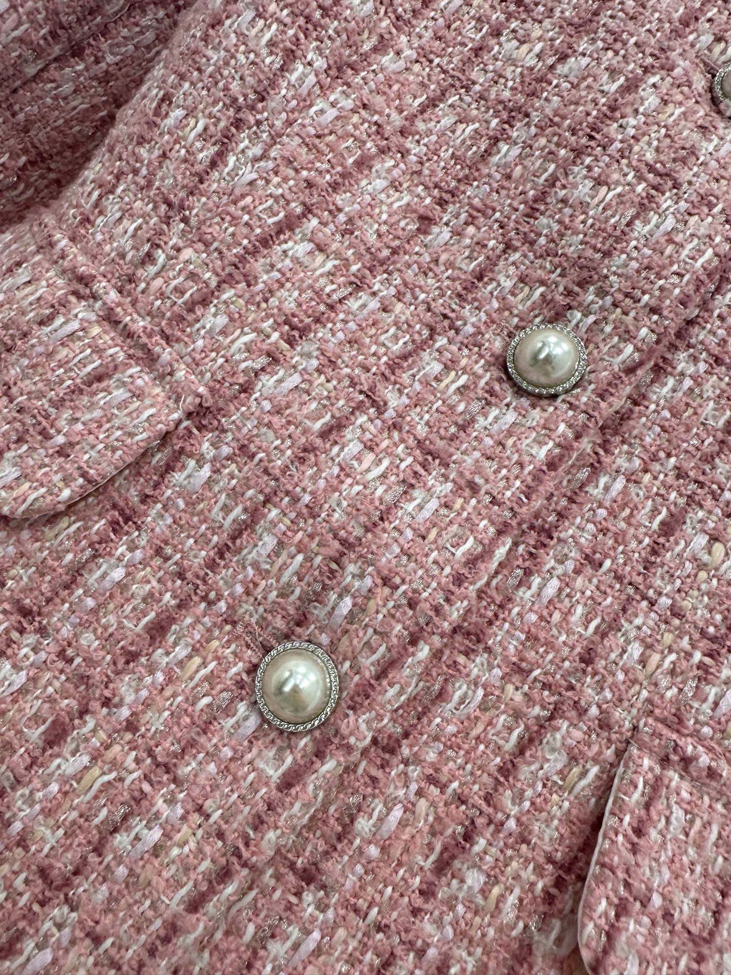 Made of coarse woolen material, with a high-end texture and full appearance, the round neck dress jacket is designed with shoulder pads that fit the human body, making the body appear slender and upright. The large neckline is adorned with silver yarn, and the front is decorated with pearl buttons, giving the overall shape a strong sense of luxury. The whole body has a bright pink background, and the delicate same color deep and dark grid texture is spread all over the body. The waist flap pocket is designed to retract the waist, making the socialite style stand out. The straight tube mid length skirt of the same series echoes the weaving details, and the back slit is more flexible, perfectly interpreting the elegant and luxurious feeling. It is intellectual and gentle
