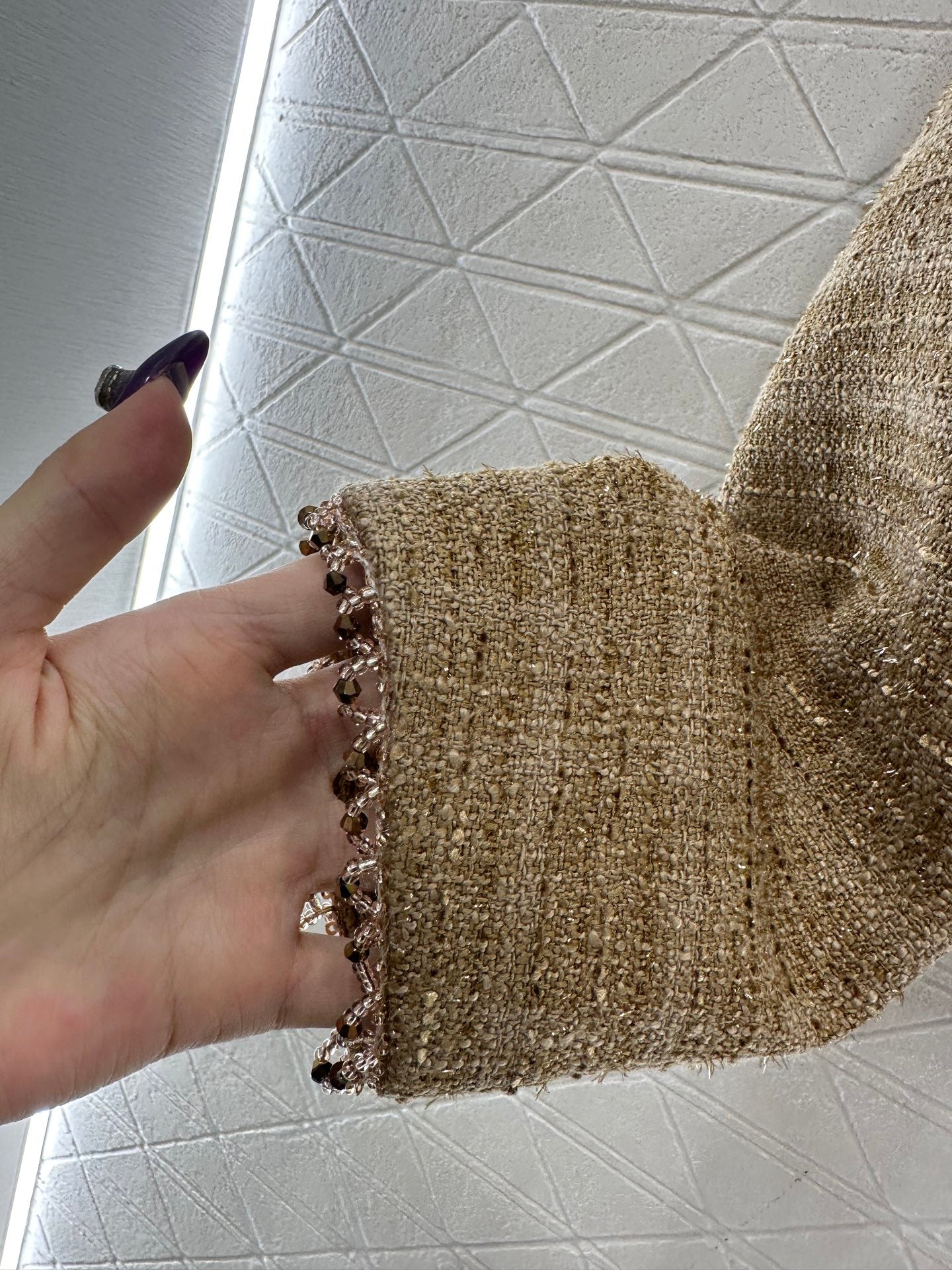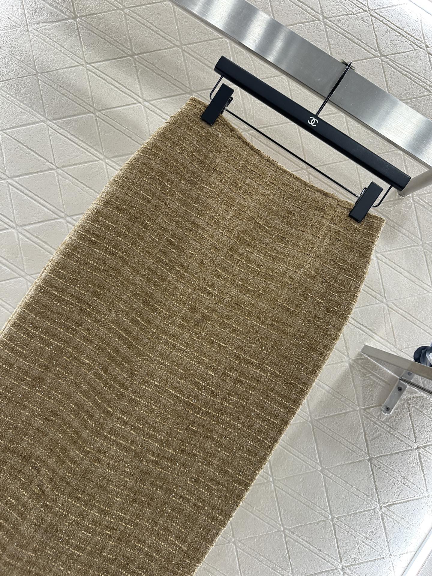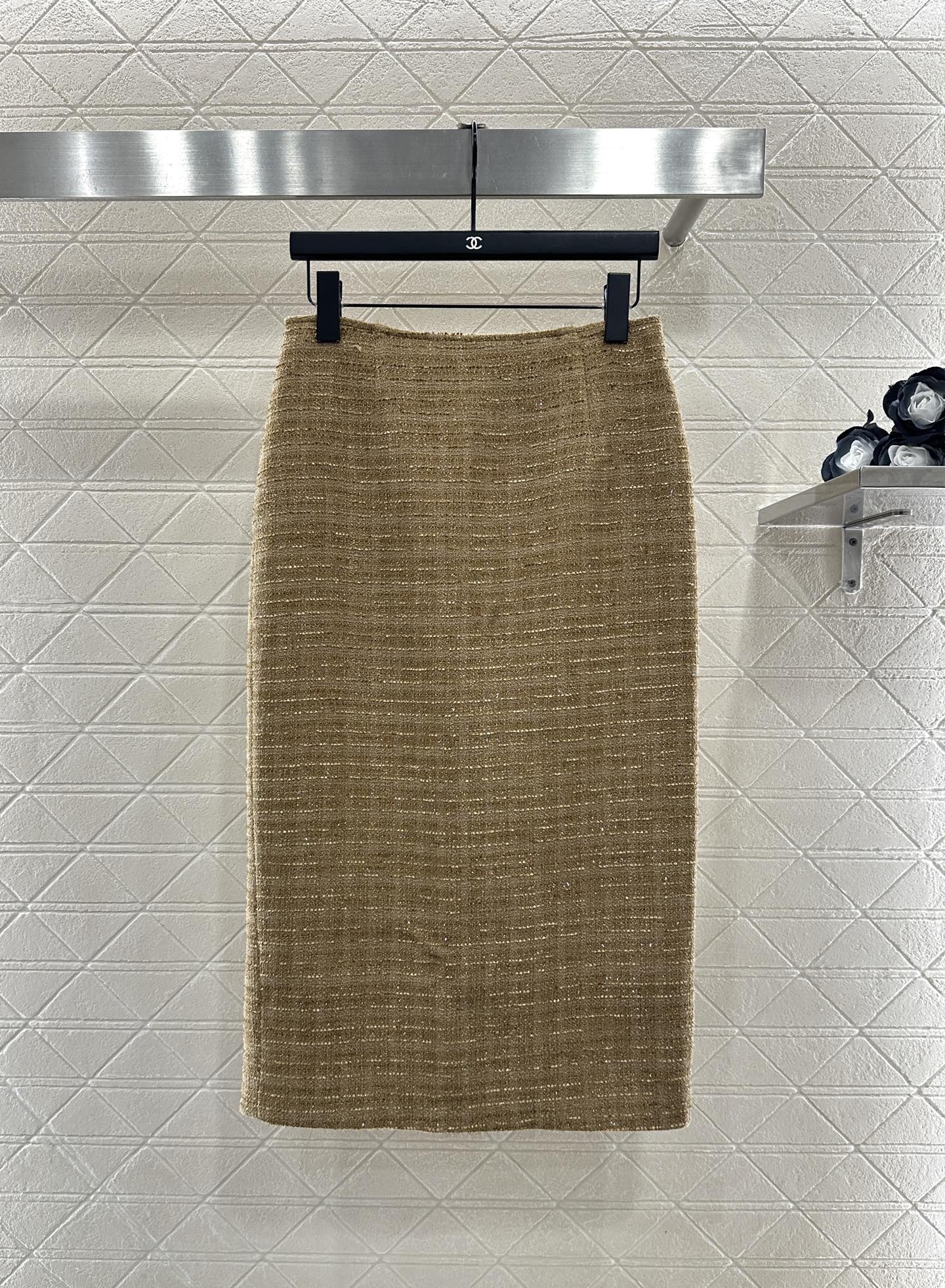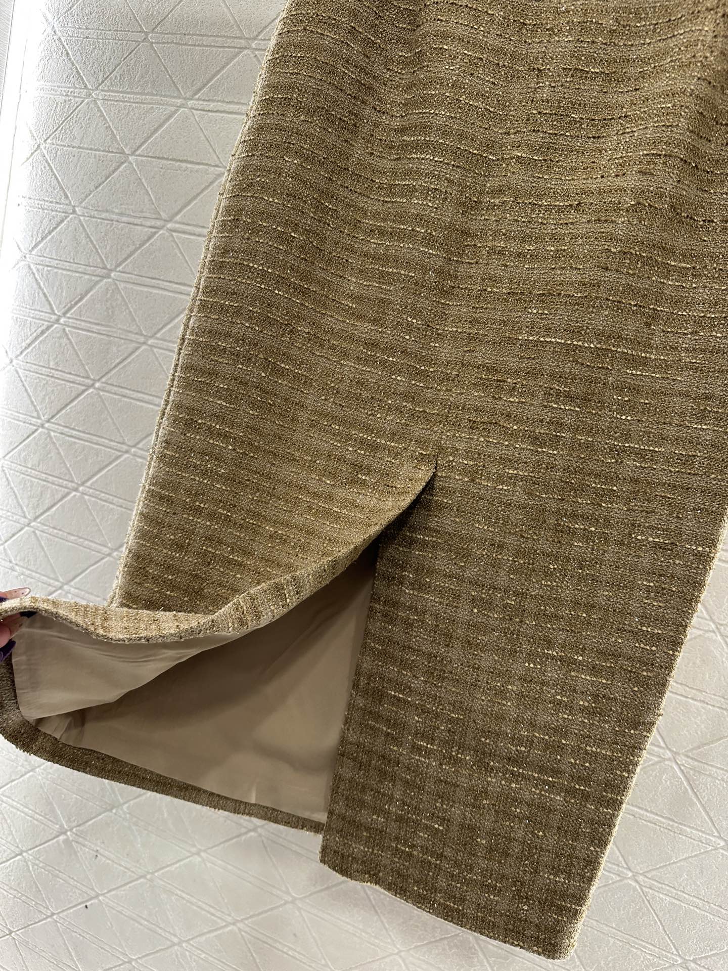 Made of high-quality woolen material, with a full appearance, this round neck dress has a tailored design that fits the human body. The shoulder pads are designed to enhance the slender and upright figure. The large neckline is adorned with woven gold yarn to highlight the details, echoing the cuffs and pockets. The overall color is caramel, and the square heavy breastplate is matched with delicate grid patterns and dark textures that cover the whole body. The socialite style is prominent, and the straight tube mid length skirt of the same series echoes the particle weaving details. The back slit is more flexible, perfectly interpreting the elegant and luxurious feeling, intellectual and gentle. It is an excellent choice for Christmas, New Year's Day, and year-end gatherings, instantly killing the whole scene and the focus.