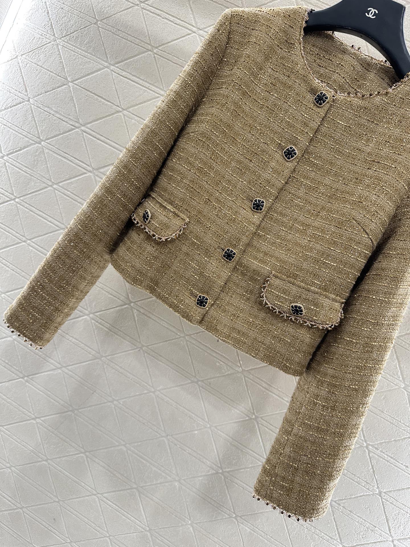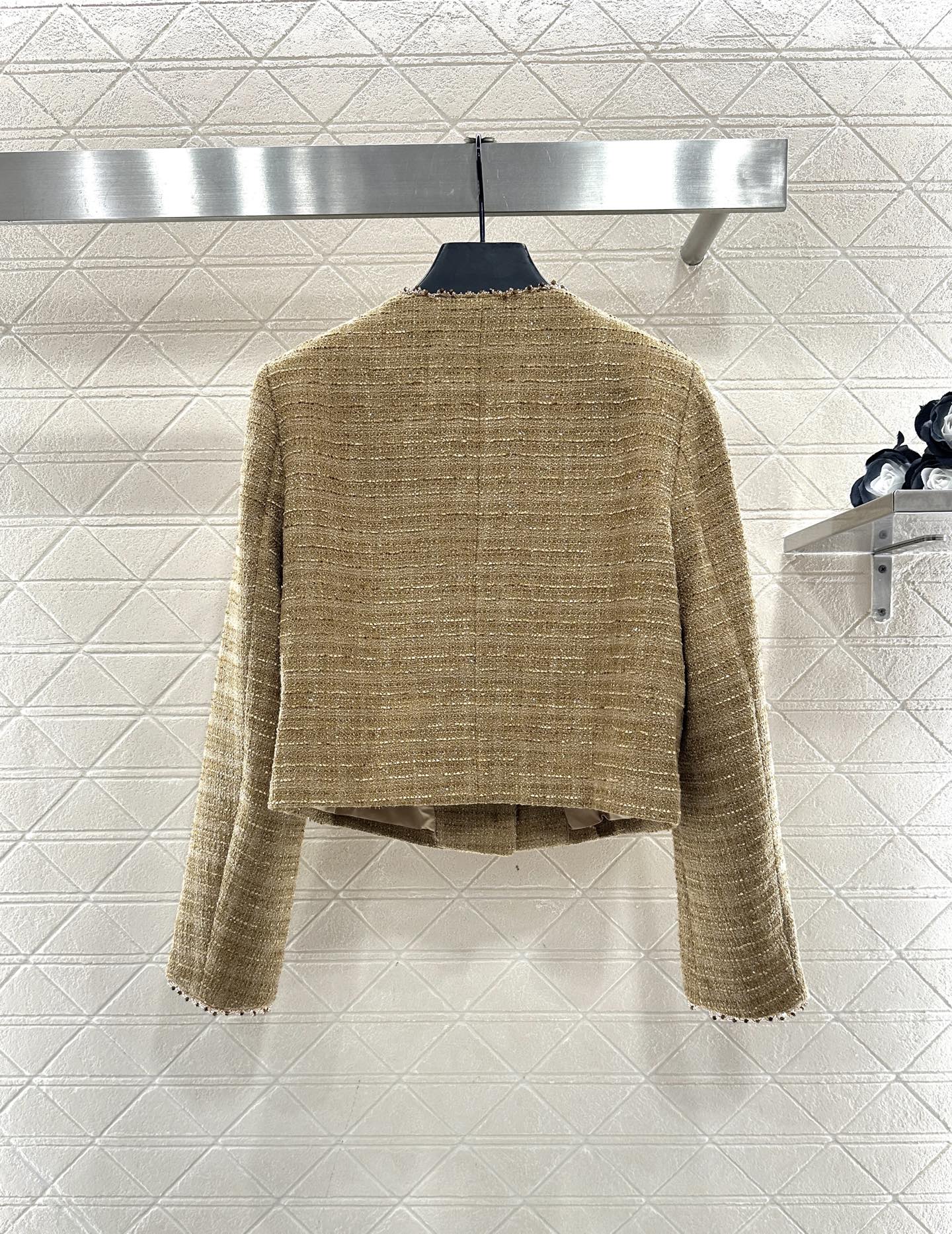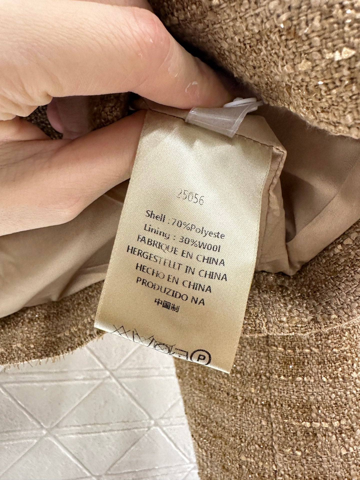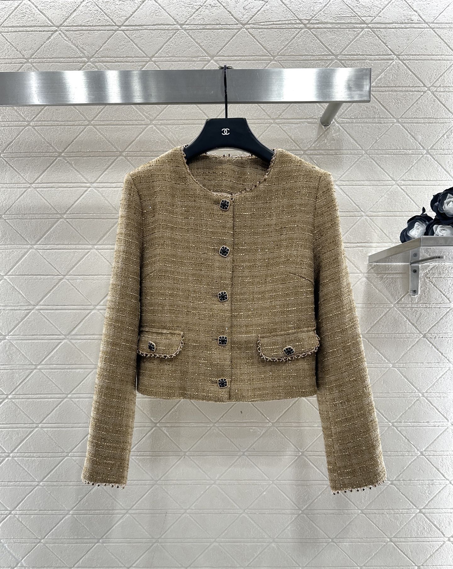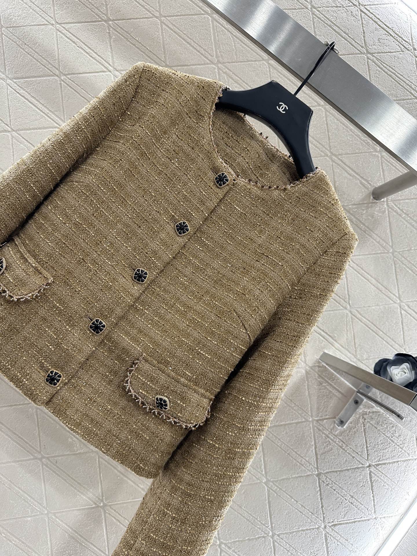 Made of high-quality woolen material, with a full appearance, this round neck dress has a tailored design that fits the human body. The shoulder pads are designed to enhance the slender and upright figure. The large neckline is adorned with woven gold yarn to highlight the details, echoing the cuffs and pockets. The overall color is caramel, and the square heavy breastplate is matched with delicate grid patterns and dark textures that cover the whole body. The socialite style is prominent, and the straight tube mid length skirt of the same series echoes the particle weaving details. The back slit is more flexible, perfectly interpreting the elegant and luxurious feeling, intellectual and gentle. It is an excellent choice for Christmas, New Year's Day, and year-end gatherings, instantly killing the whole scene and the focus.