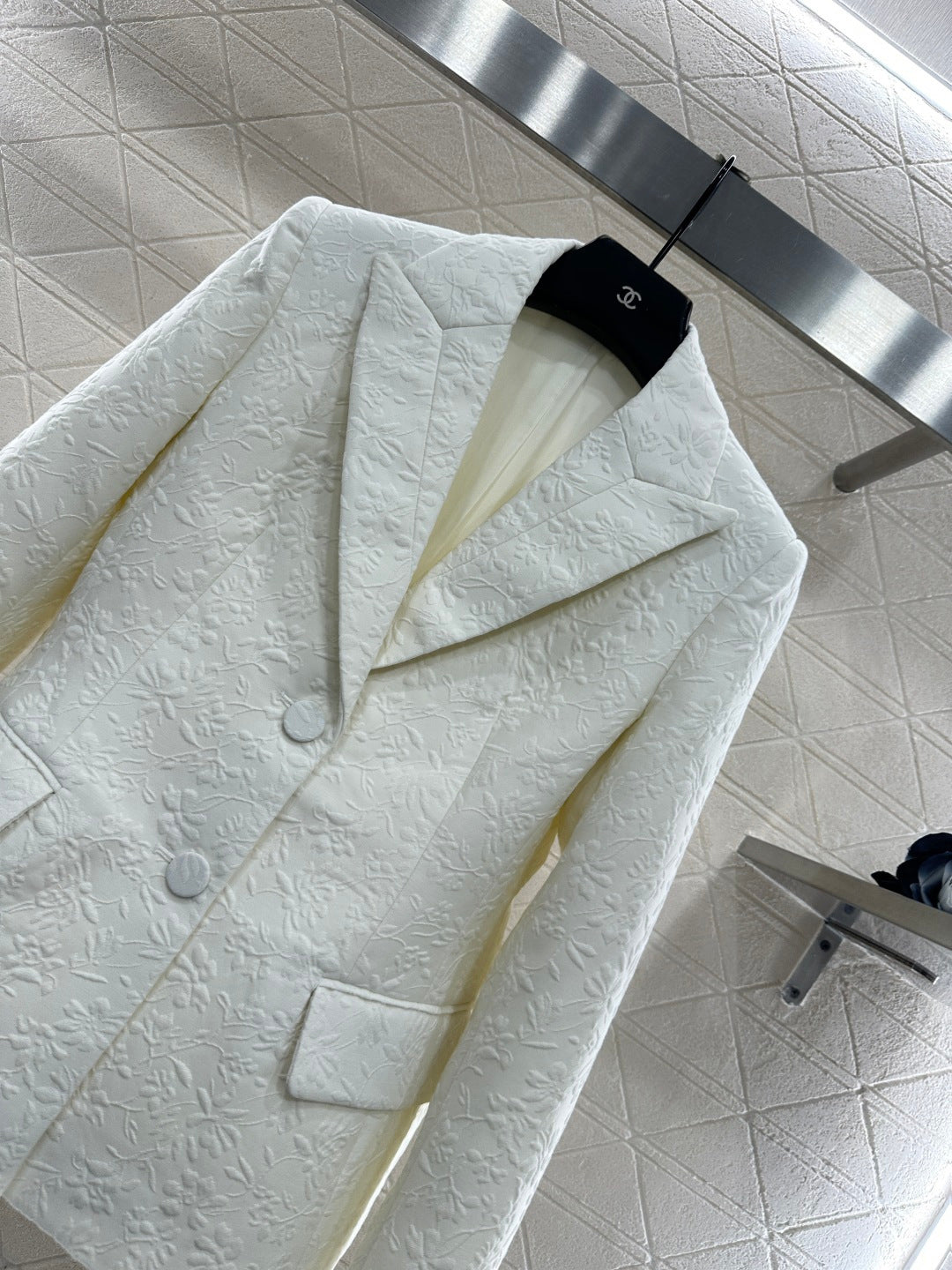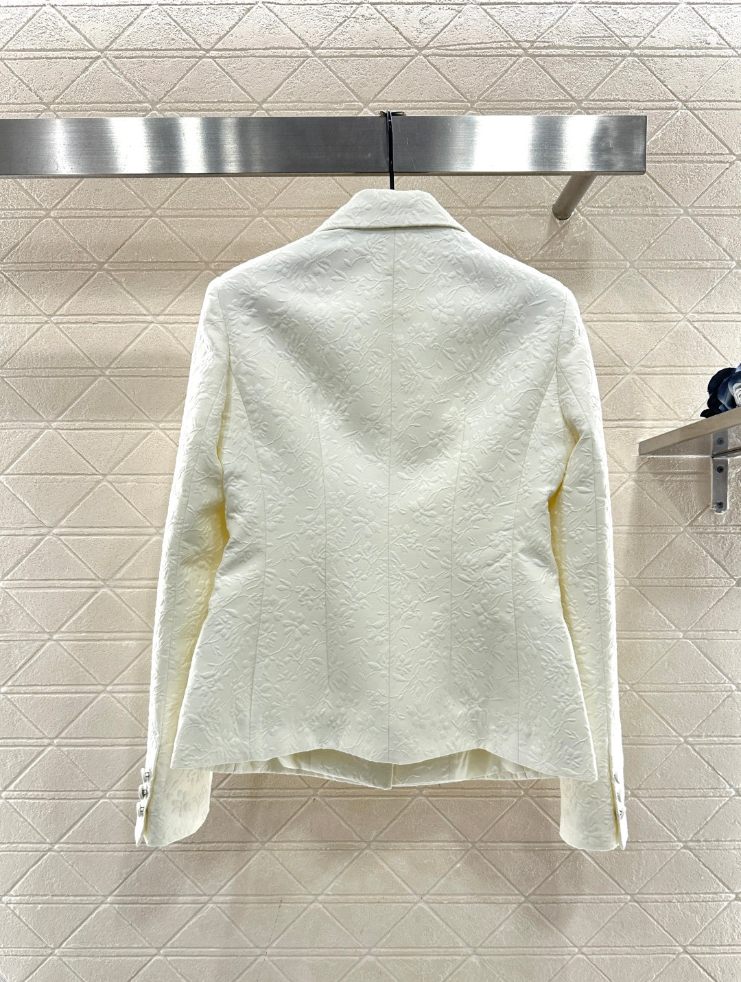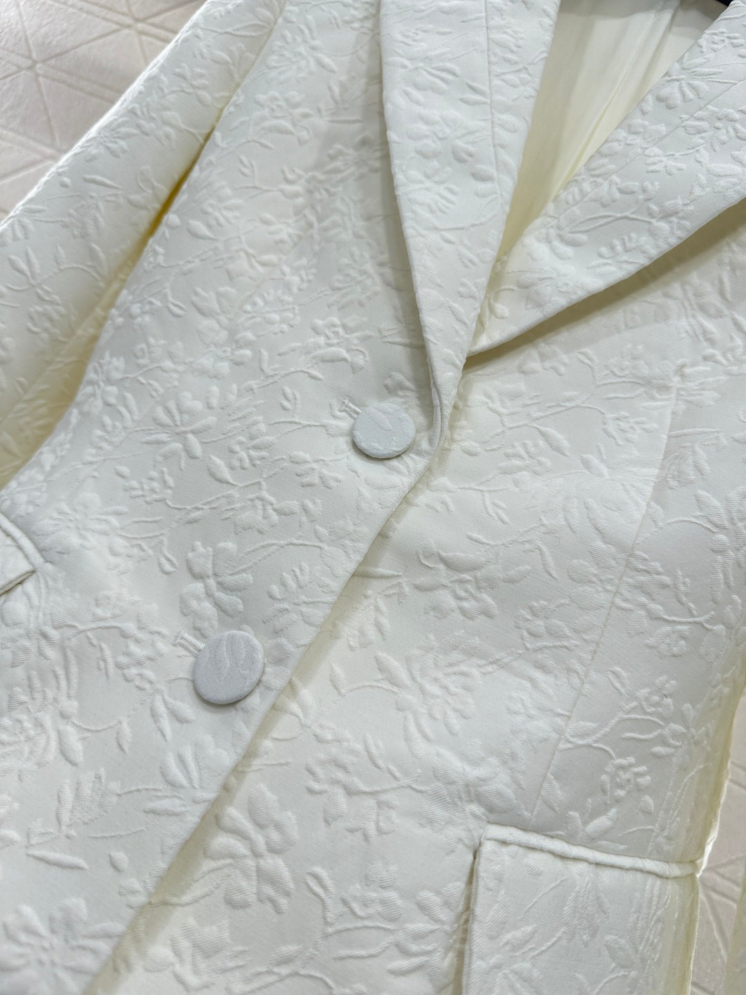 Made of fuzzy material, the fabric is textured with prominent folds of flowers and vines, giving it a stylish and flowing feel. It features a collar and shoulder length suit jacket, with a gun collar and a single row of round buttons embellished on the front. The waistline is extended, and the flap pocket at the waist is decorated with curves, making the upper body slim. Paired with the same series of umbrella shaped skirts, the high waisted A-line design creates a floating and swaying posture, adding nobility to the walking and swaying posture