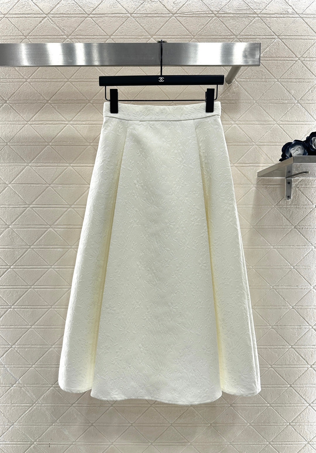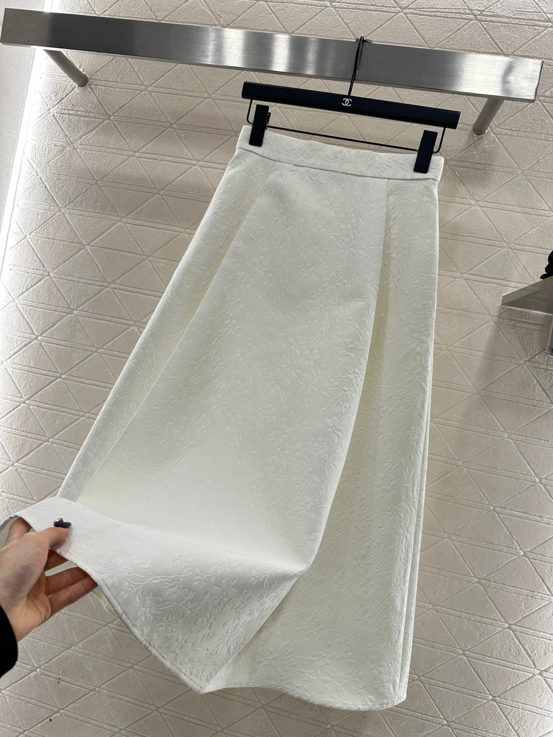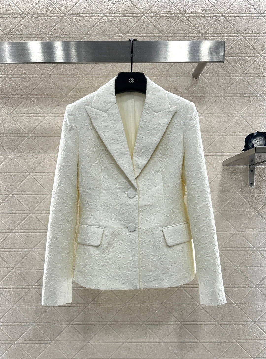 Made of fuzzy material, the fabric is textured with prominent folds of flowers and vines, giving it a stylish and flowing feel. It features a collar and shoulder length suit jacket, with a gun collar and a single row of round buttons embellished on the front. The waistline is extended, and the flap pocket at the waist is decorated with curves, making the upper body slim. Paired with the same series of umbrella shaped skirts, the high waisted A-line design creates a floating and swaying posture, adding nobility to the walking and swaying posture