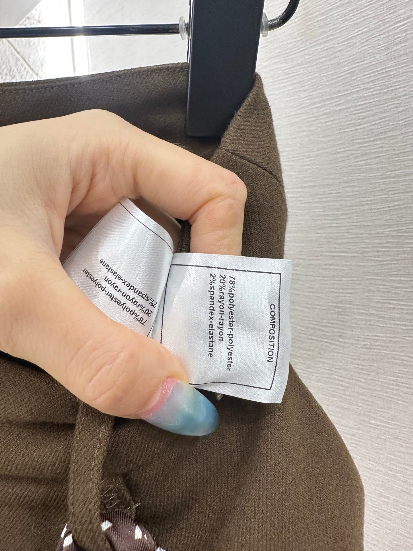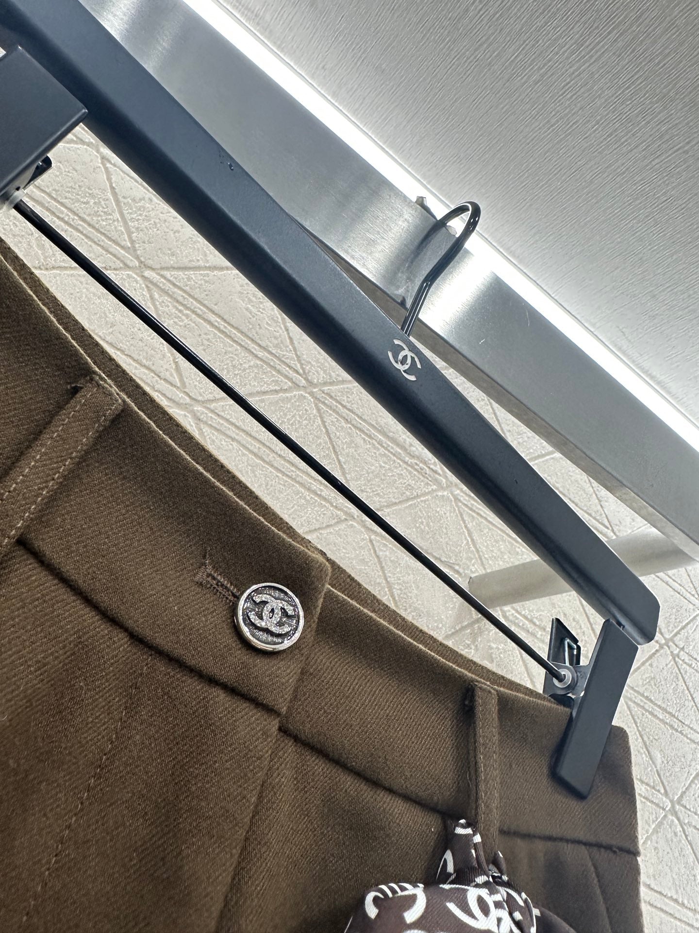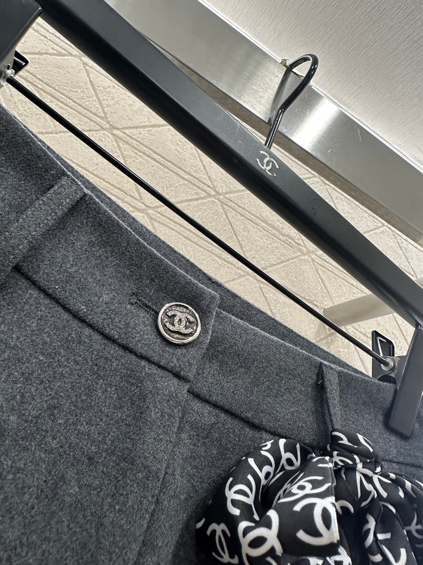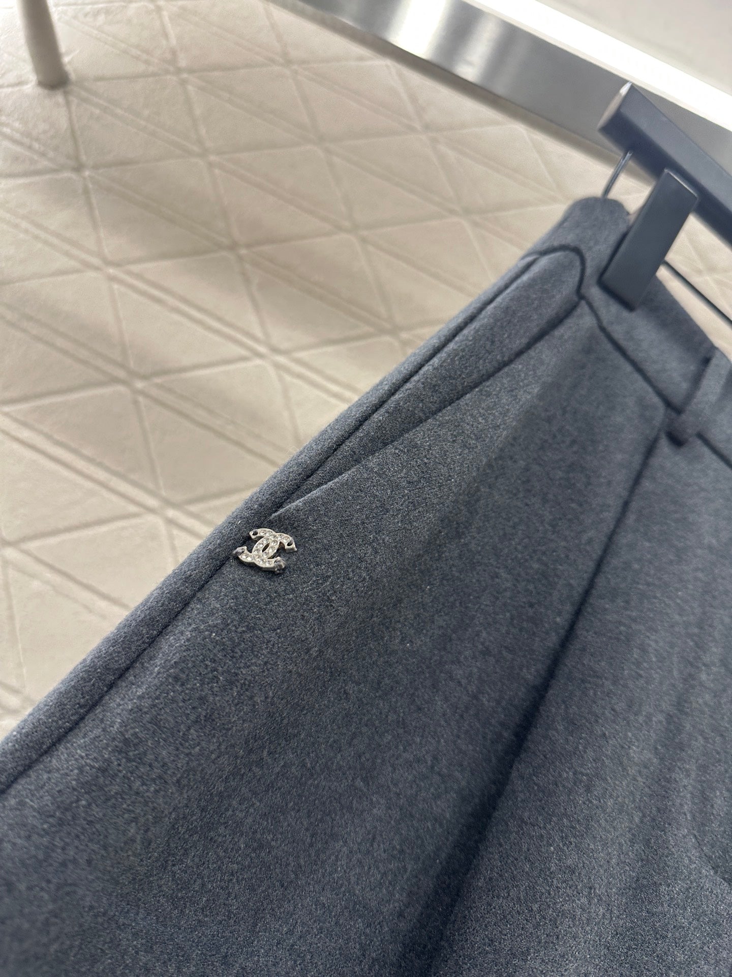 Made of woolen material, the texture is thick and comfortable to hang down. The high waisted wide leg pants are designed with a three-dimensional cut that enhances the overall texture. Paired with rhinestone double C accents in the pockets, the high waisted center buckle echoes, highlighting the brand's style and standing tall and neat posture. The waist and crotch ribbons highlight playful vitality, while the double C full layer design details create a dynamic feel, making the outfit more coordinated, high-end, and fashionable.