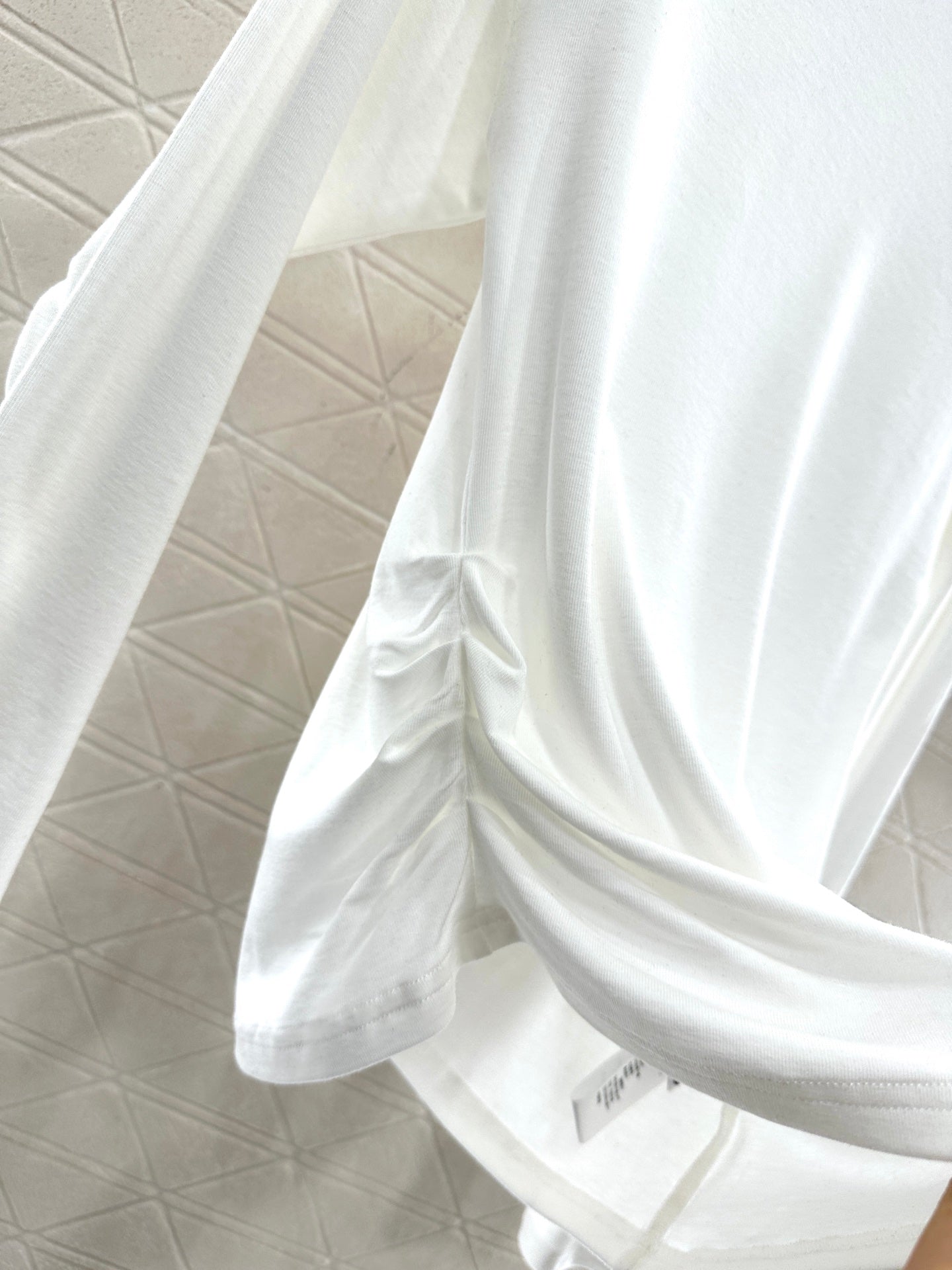 Tencel wool material, elastic texture, comfortable and soft, with a long sleeved top cut and a wide neckline that exposes the shoulders and neck. Paired with a single-sided horseshoe buckle shoulder strap, the Arc de Triomphe imprint echoes the hot diamond on the chest, enriching the design layers and making it look slimmer and more stylish. The single-sided waist fold tightens and decorates, providing a snug and slimming effect, making the style slim and fashionable.
