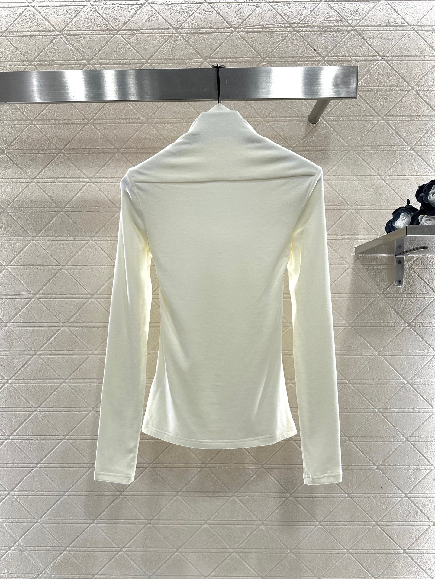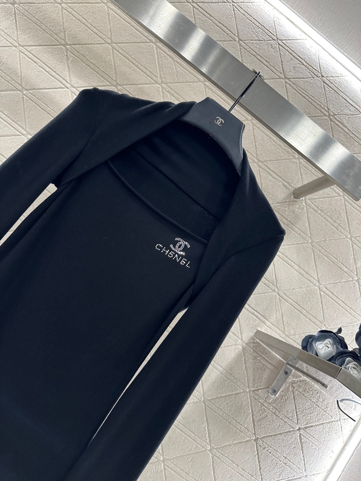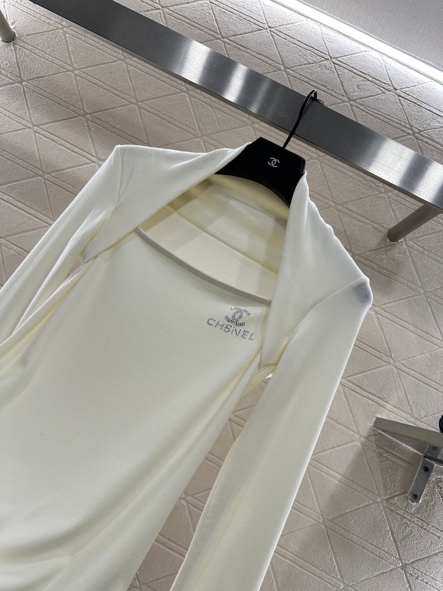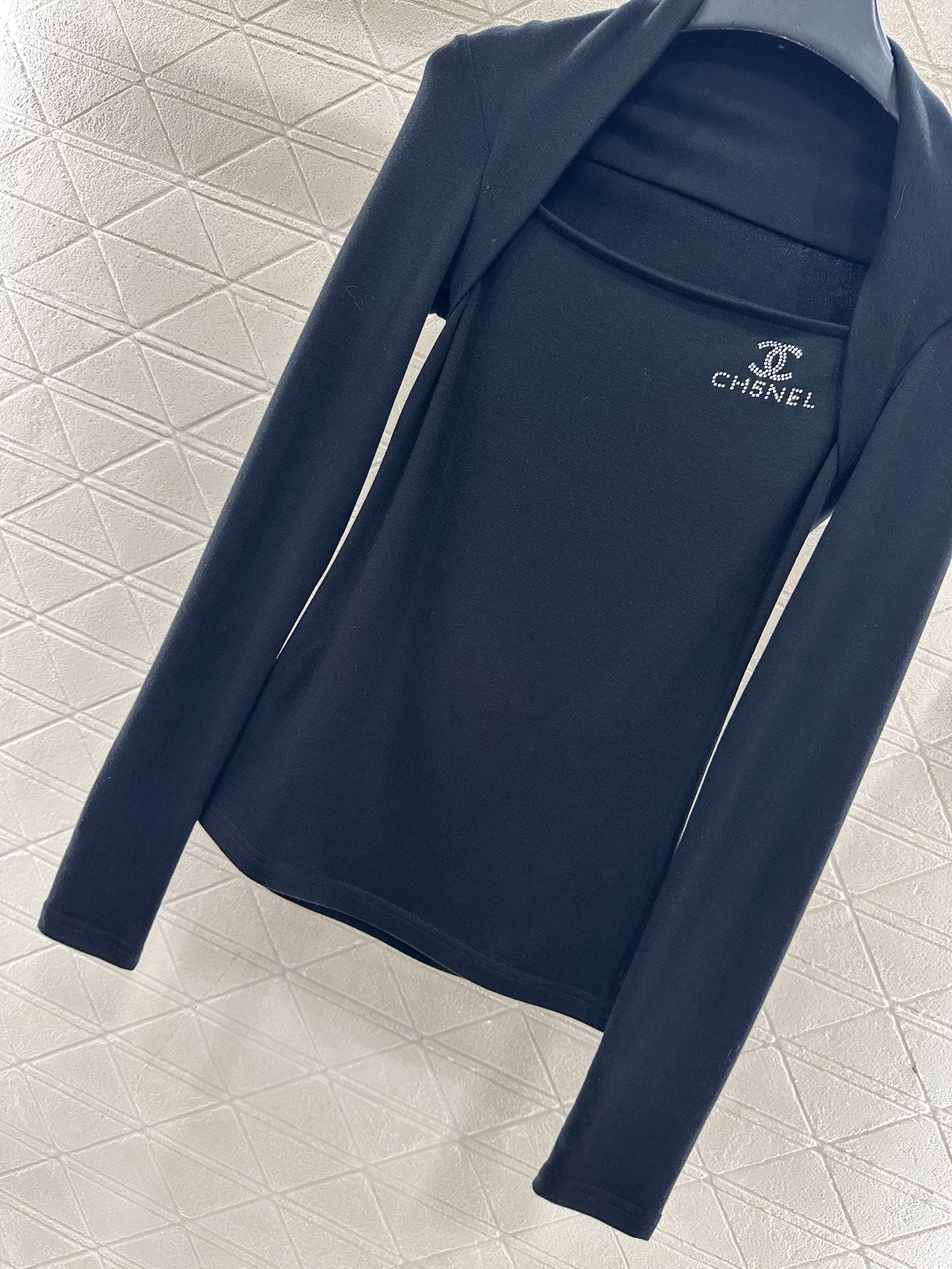 Cotton wool material, comfortable texture, good elasticity to wear, flat cut shoulder wrapped long sleeved top, layered design around the armpits to both sides of the shoulders, covering the accessory breast and exposing the collarbone for a slimmer look. The black and white solid color is versatile and durable, with the iconic double C letter logo decoration on the chest, using hot diamond reflection to increase luxury and get rid of boring monotony. The slim fitting cut fits the body shape, making the outfit look slim and high-end, showing elegant autumn and winter interior wear. It is suitable for daily commuting, dating and leisure 👌