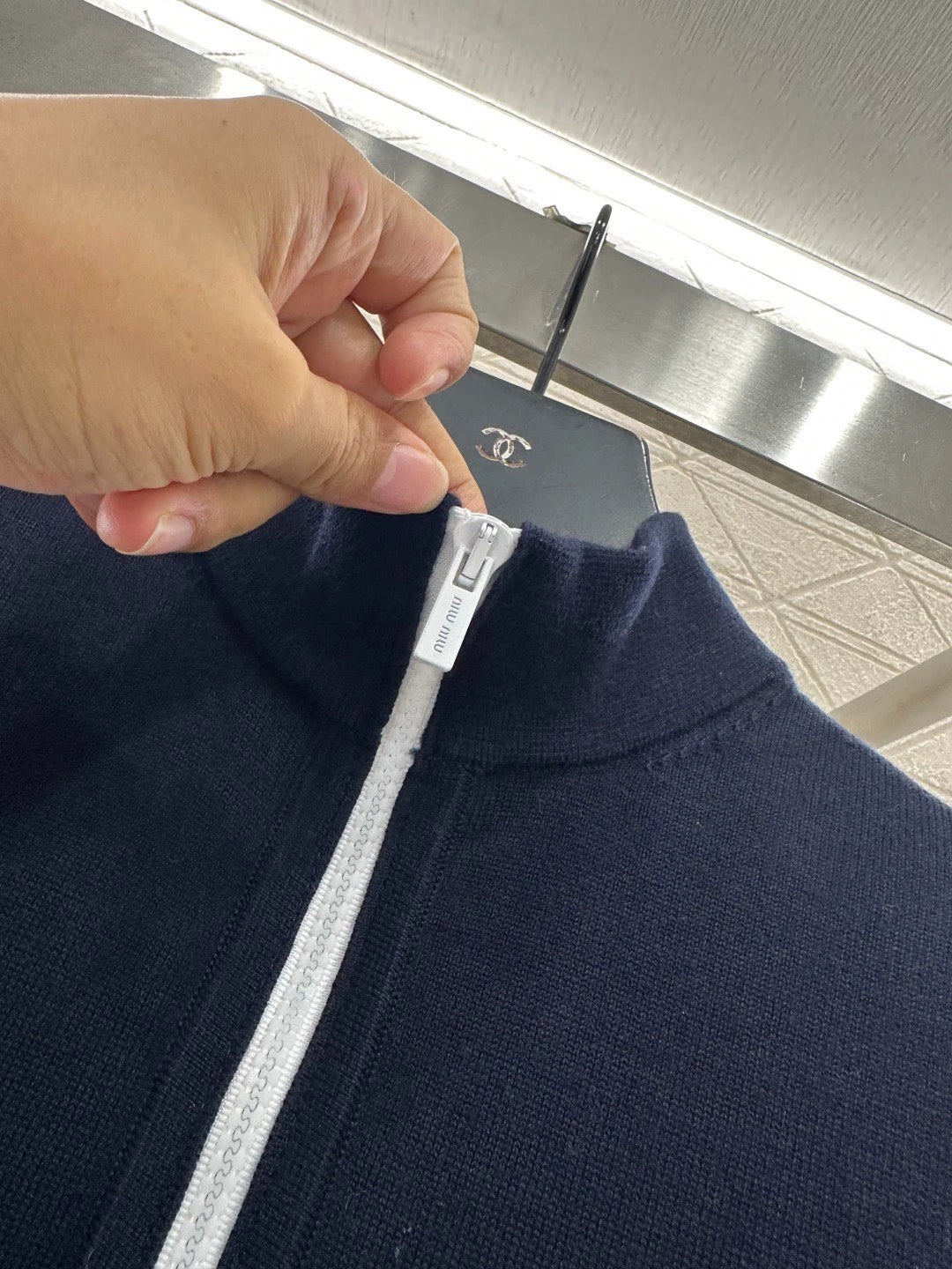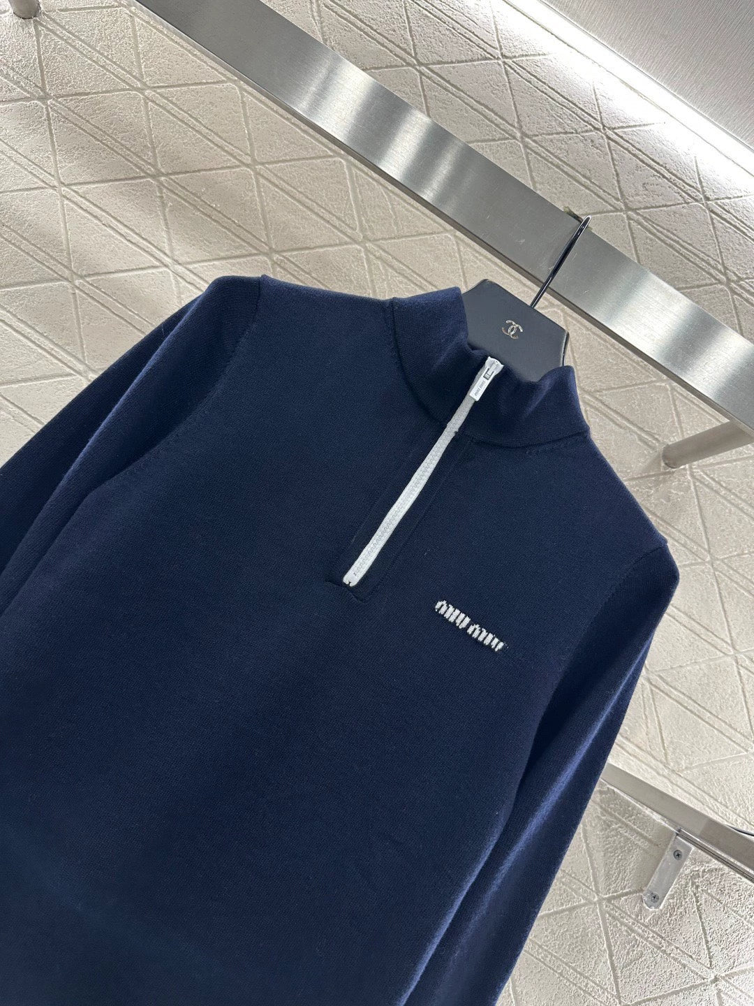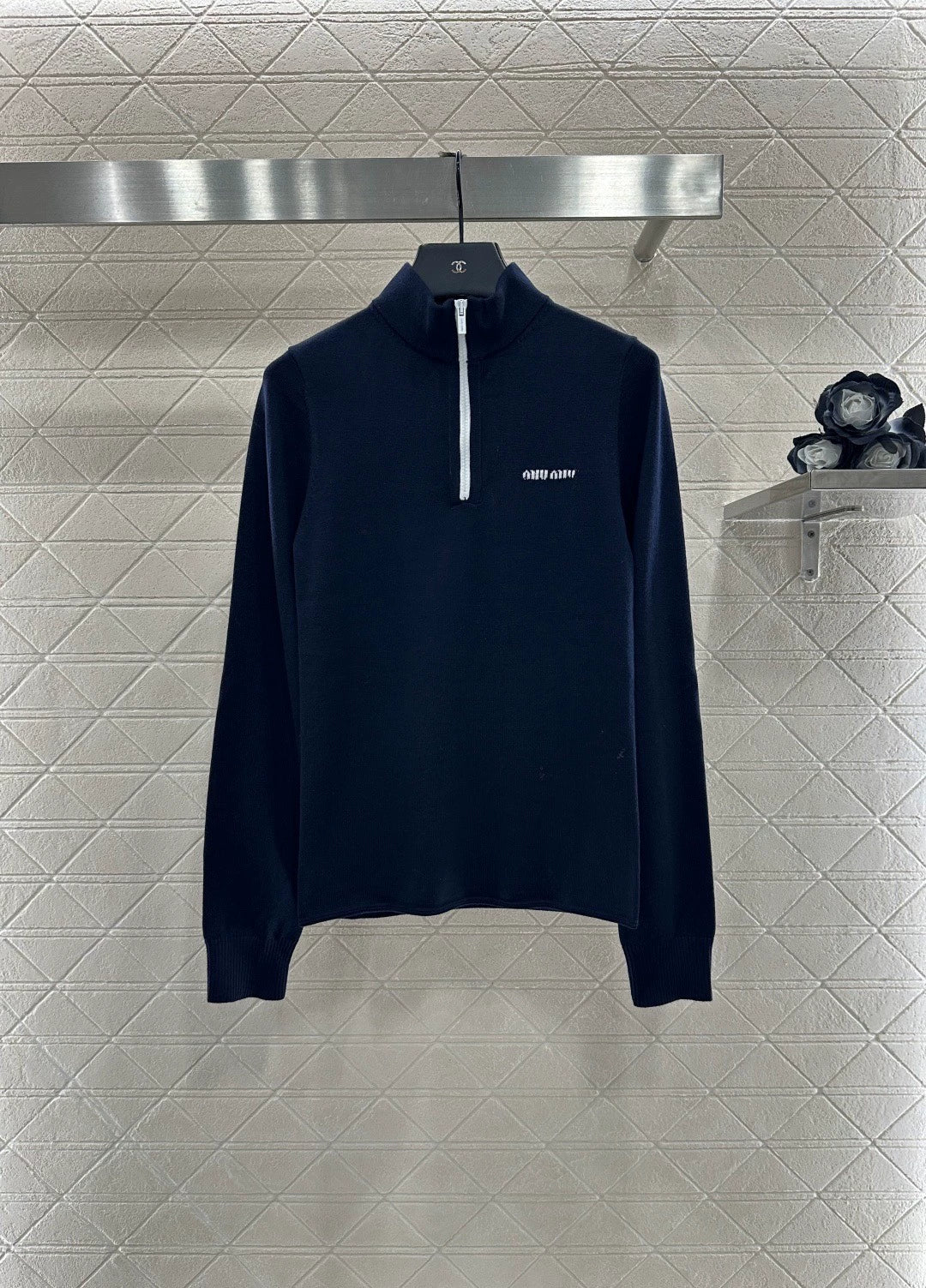 Woolen yarn weaving, delicate and soft, full of elasticity, exquisite lapel top design, semi open zipper design, the whole body is hooked with delicate texture, the elastic threaded collar is wrapped with grooves, visually narrowing the waist, matched with chest letter logo, perfect for details, basic style with warm thickness, strong retro college style, fashionable and age reducing for changing seasons, easy to control in daily life