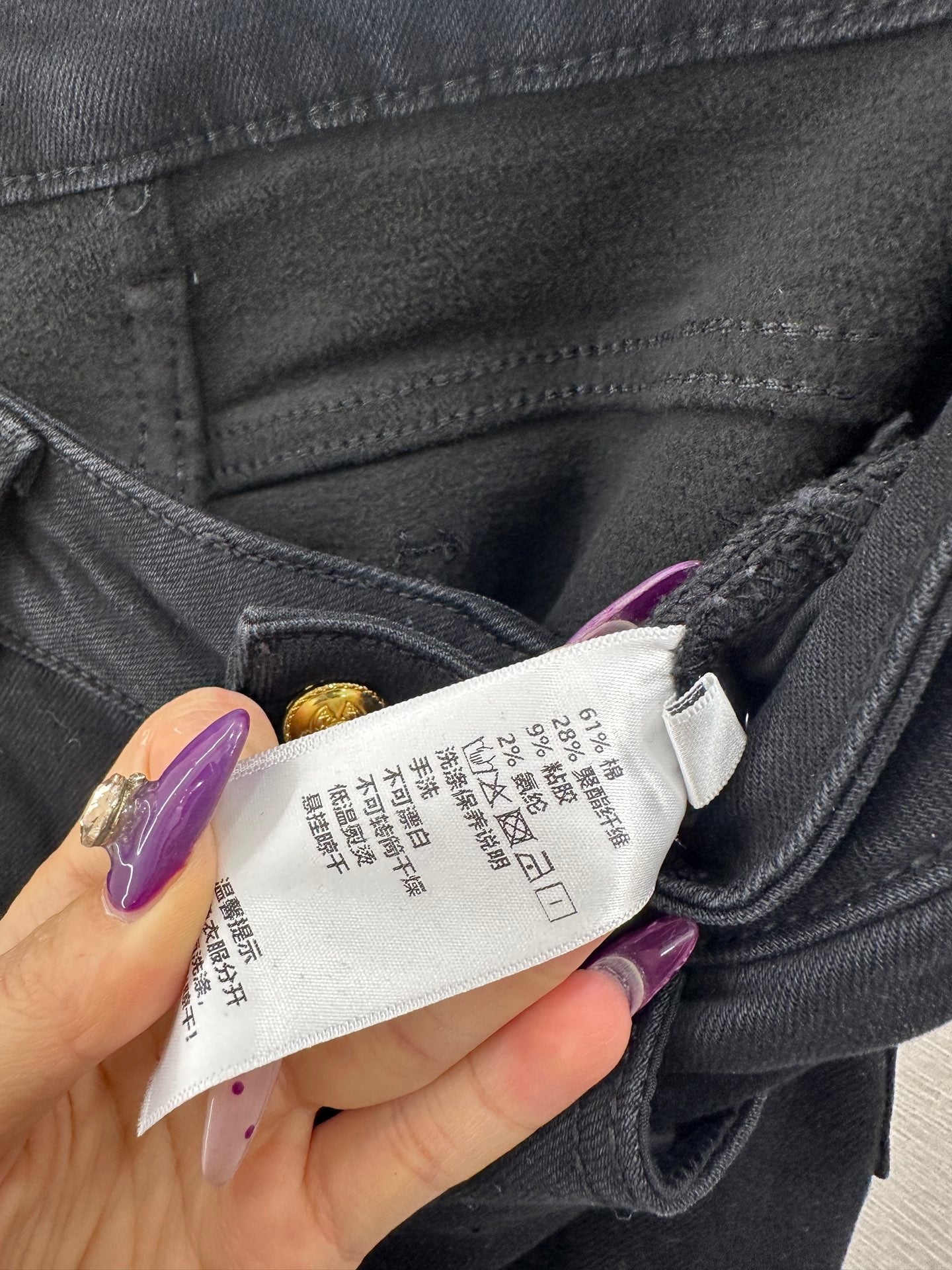 Twill cotton denim material, comfortable and elastic, stylish to wear, slightly stretchy long pants version, evenly dyed with enzyme water washing throughout the body, versatile and durable with retro carbon black, thigh positioning with staggered size rhinestones, double C letter logo ➕ Rear buttock leather logo with double C gold emblem ➕ Lingge pocketsweater pattern, highlighting temperament, three-dimensional cutting, stretchy and slim fit, standing out charming long legs, can be easily matched with tops, fashionable and stylish, with brushed lining, warm and fashionable for autumn and winter wear