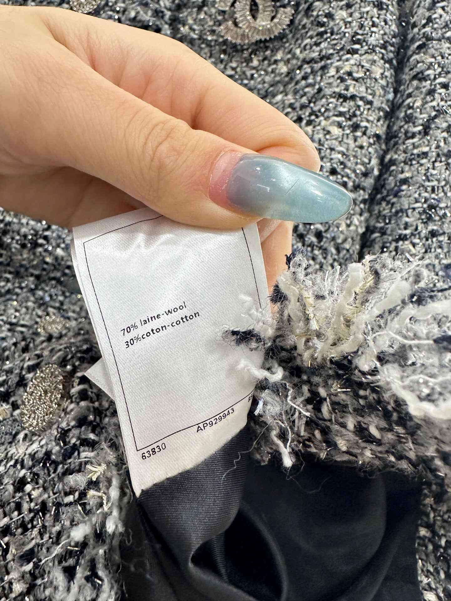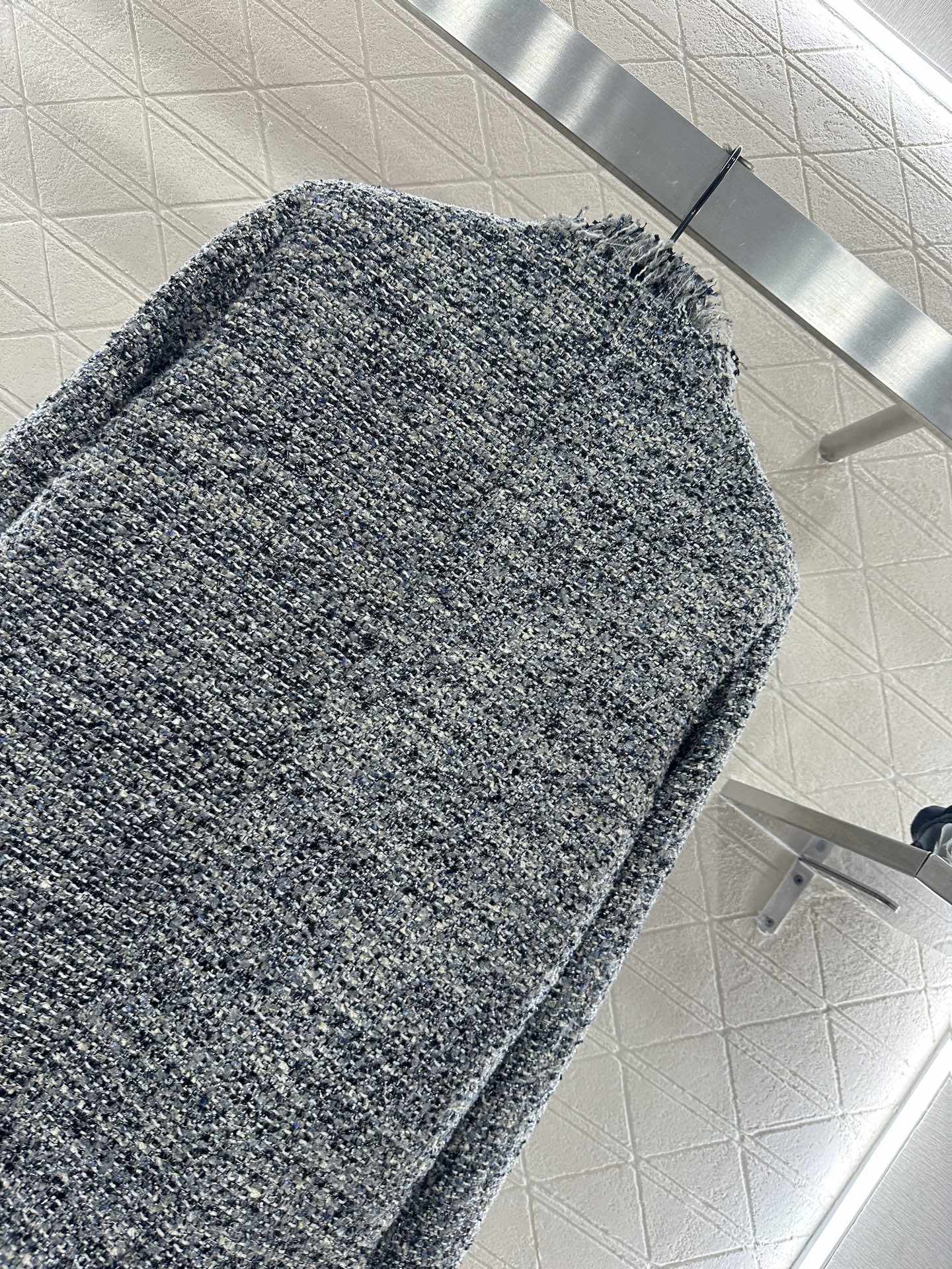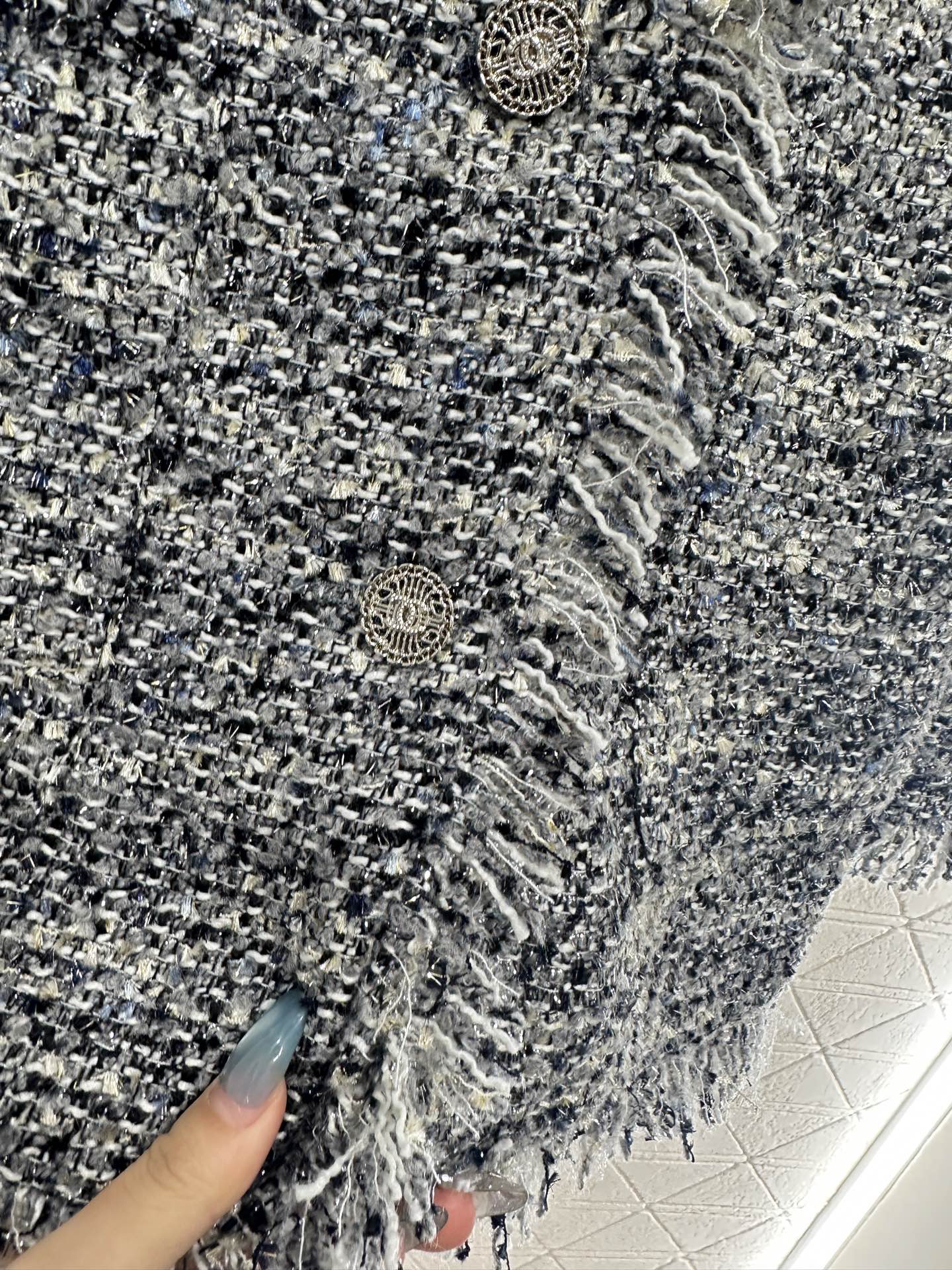 Made of coarse woolen fabric with distinct texture, visible to the naked eye and superior quality. The coarse striped woolen fabric creates a model of socialite style, and the round neck padded shoulder jacket features a single printed round button on the front side of the slanted collar ➕ Exquisite gray black horizontal weaving texture, luxurious yet elegant, with edge wrapped fluff and flowing fringe decoration. The chest rhinestone zircon double C brooch is elegant and charming, making it the first choice for fashionable and sophisticated dressing.