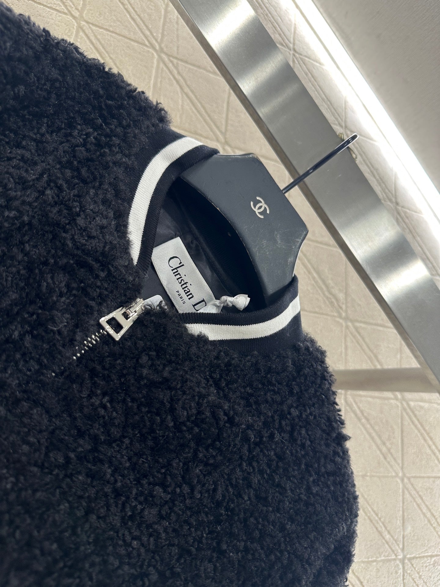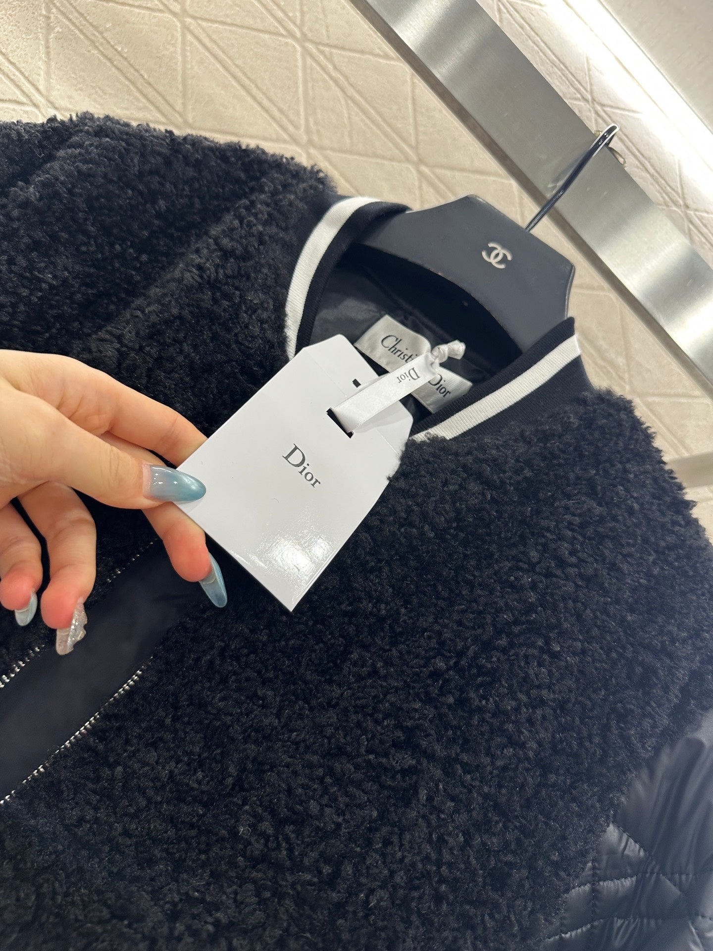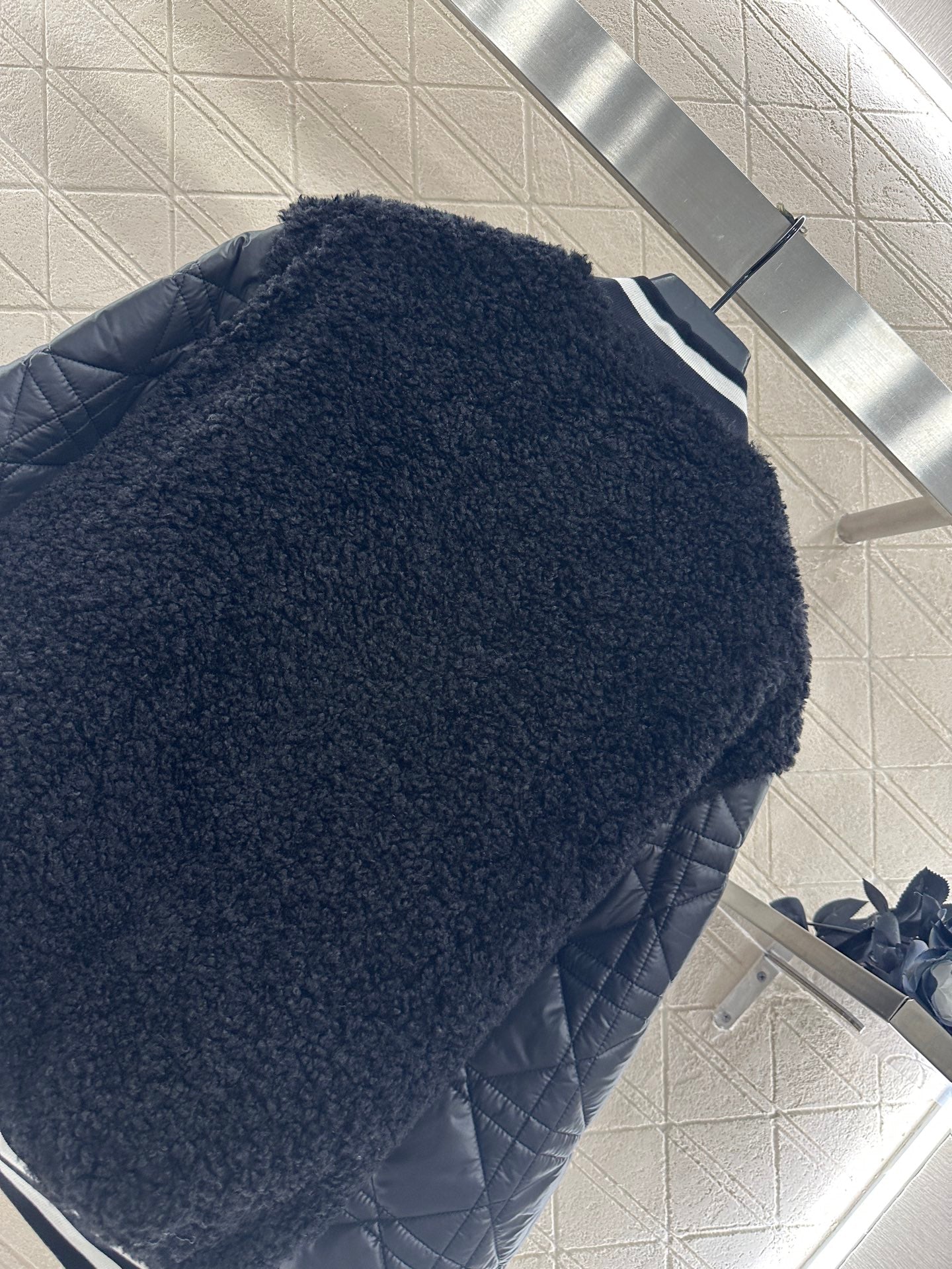 The shoulder, chest, and body parts are decorated with teddy plush material, which is soft and comfortable in texture. The two sleeves are spliced with windproof nylon, and the materials collide, creating a fashionable and stylish look. The stand up baseball style cotton jacket is cut with a full sense of design, featuring patchwork and contrasting colors. The arms are paired with rattan plaid embossed lines, showcasing the brand's style. The black and white striped threads are tightly wrapped, adding a sense of fun to the interweaving. The overall silhouette is upright, loose fitting, and has a furry feel, making it a playful and stylish outfit for reducing age. It is the first choice for autumn and winter wear, with a fashionable and stylish style.