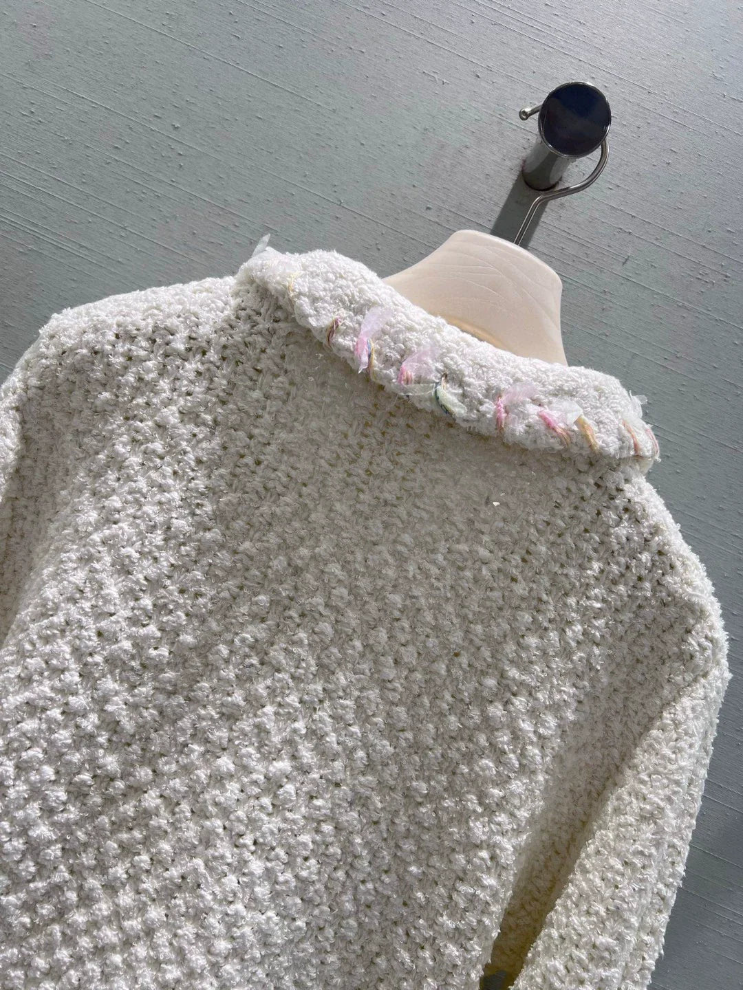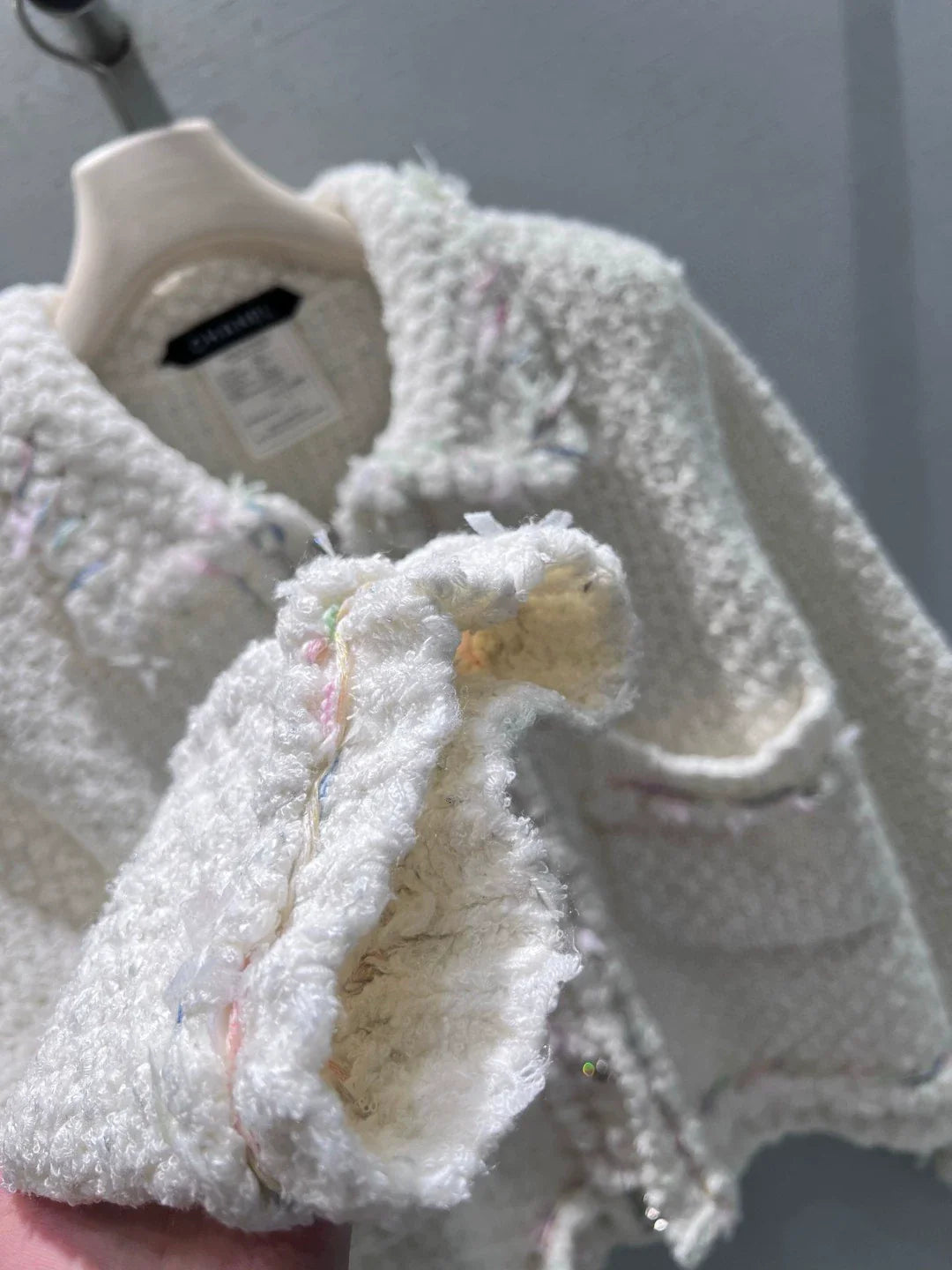 The heavy-duty series features a soft, fluffy off-white tweed fabric with a plush texture. Colorful tassels adorn the collar, placket, and pockets, breaking the monotony of a solid color and adding a touch of sweetness without being cloying. The cut is a quintessential element of the Chanel-inspired style, with relaxed, dropped shoulders that flatter various body proportions.