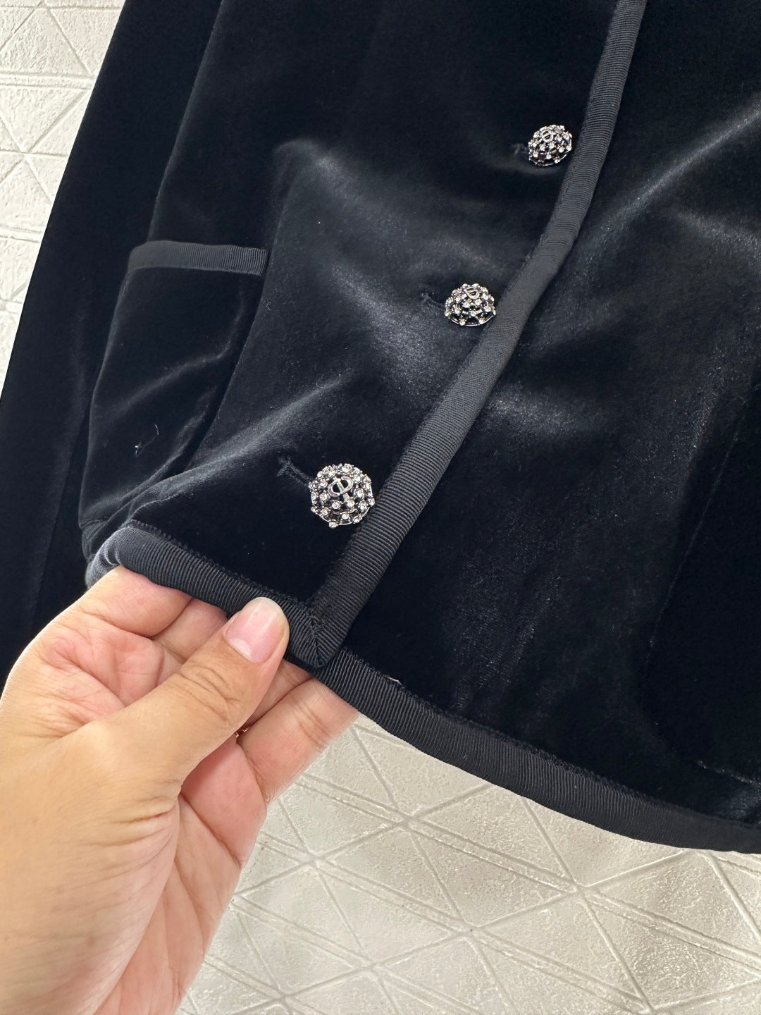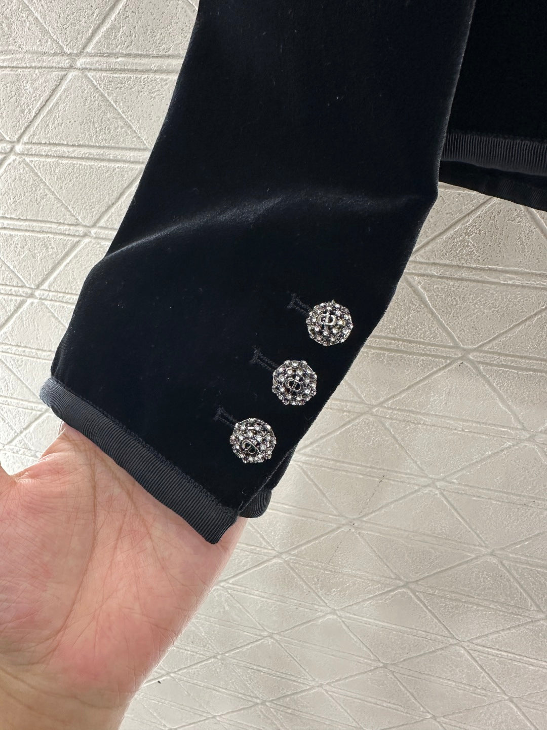 Velvet material, glossy texture, skin friendly and comfortable, round neck single west jacket cut, rhinestone zircon ➕ The CD letter logo is engraved with round buttons, which complement the cufflinks to highlight the brand's style. The button placket is matched with a moderate length, and the whole body is wrapped with edges, creating a relaxed retro effect. The front shoulder style is elegant and intellectual, and can create a luxurious style without embellishment,