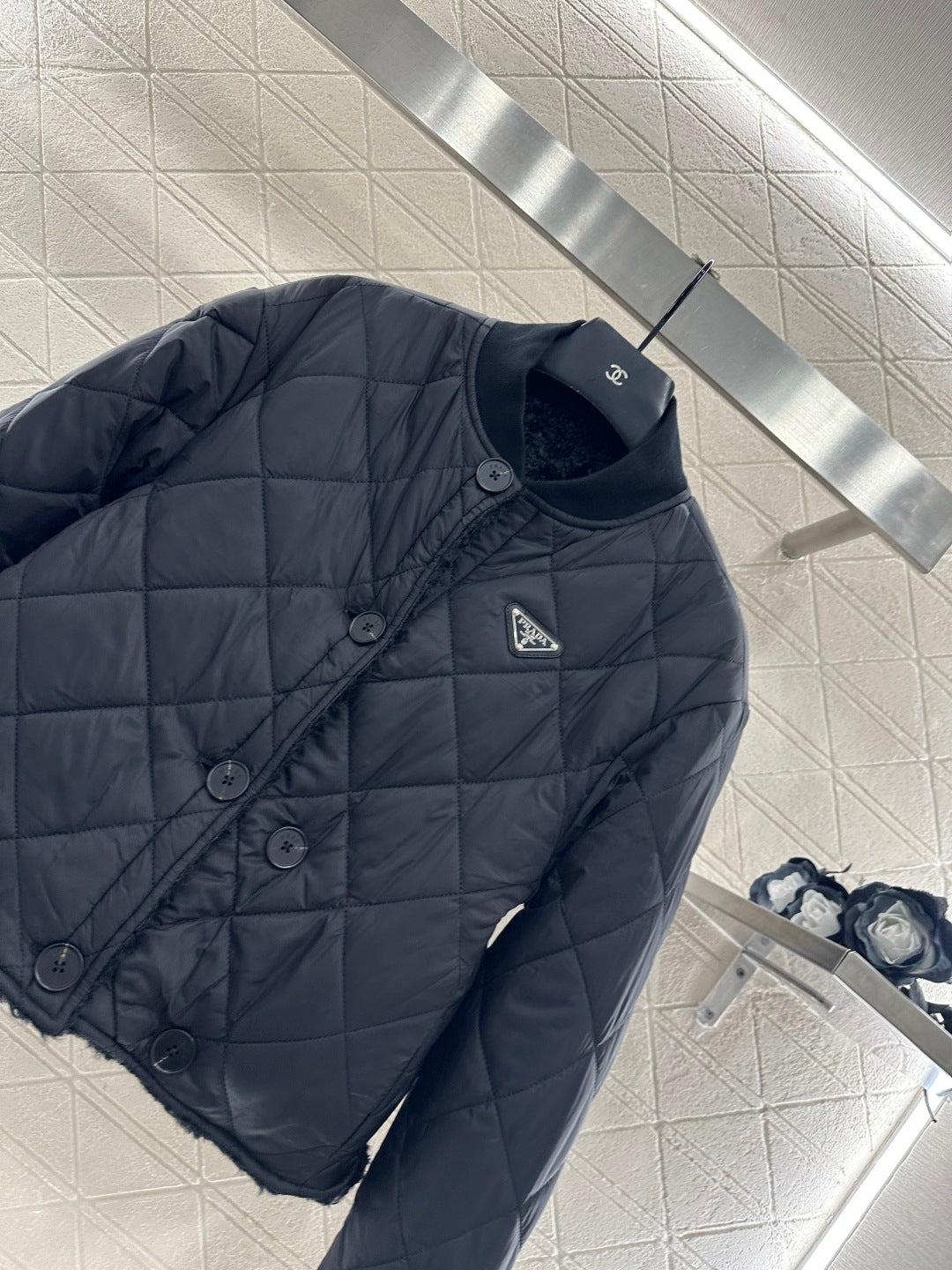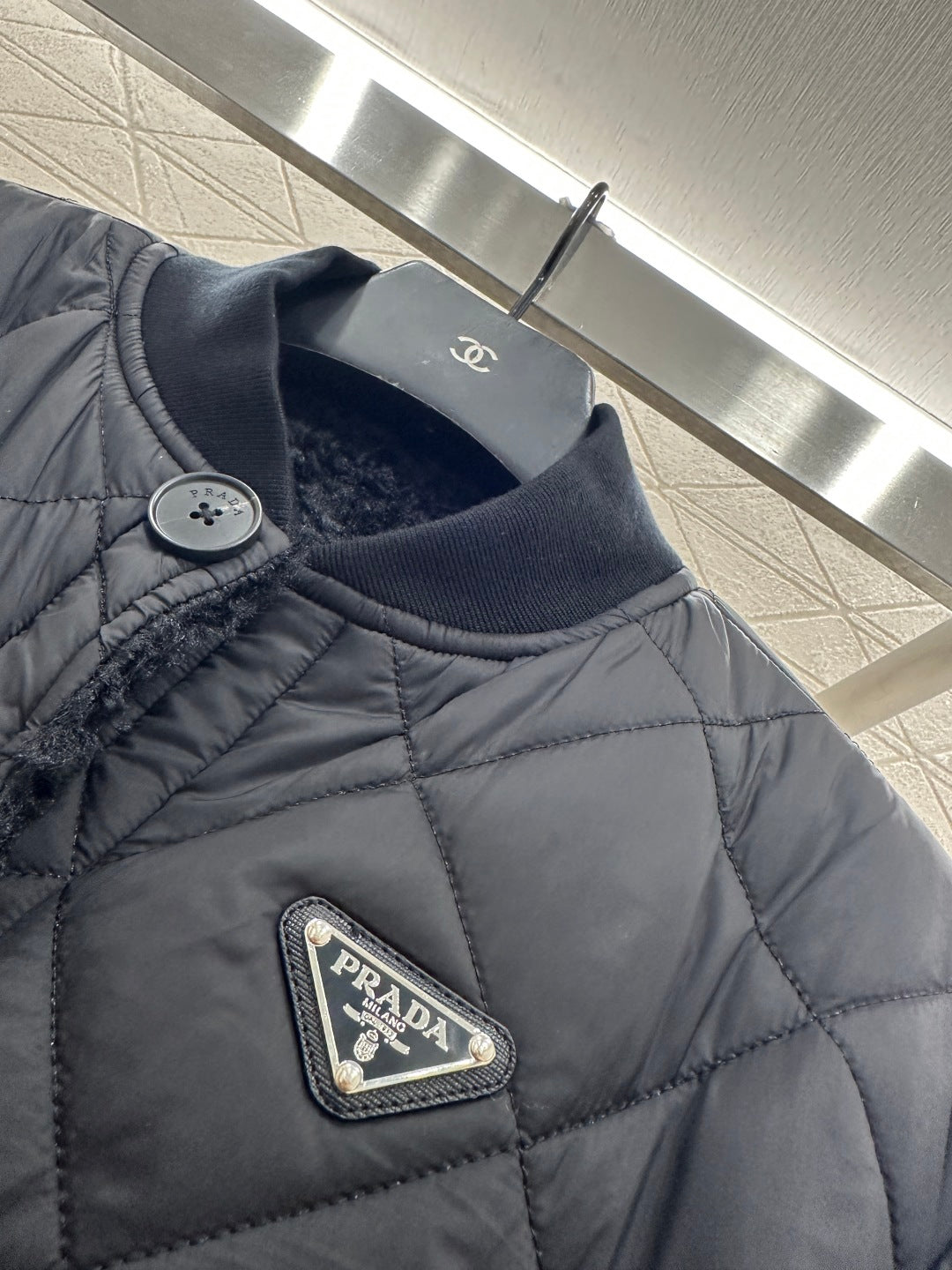 Windproof and waterproof nylon ➕ Made of lamb wool material, uniquely designed for warmth and comfort, with a threaded collar that echoes the cuffs. The jacket features a shoulder drop finish and is designed to be worn on both sides, with a diamond patterned embossed pattern ➕ Lamb hair, more suitable for winter dressing, with a triangular metal logo decoration on the chest, giving it a fashionable and stylish look on the upper body.