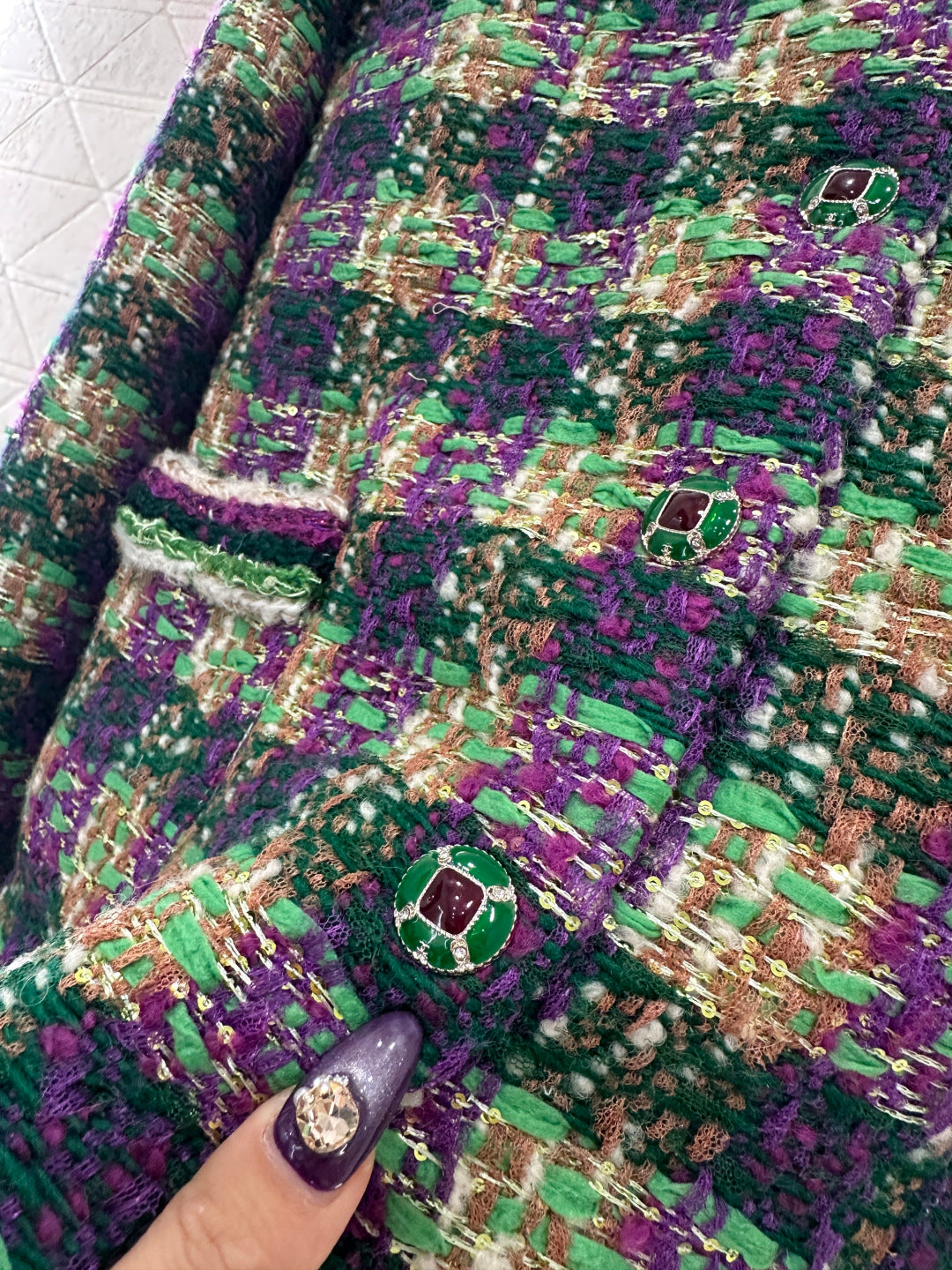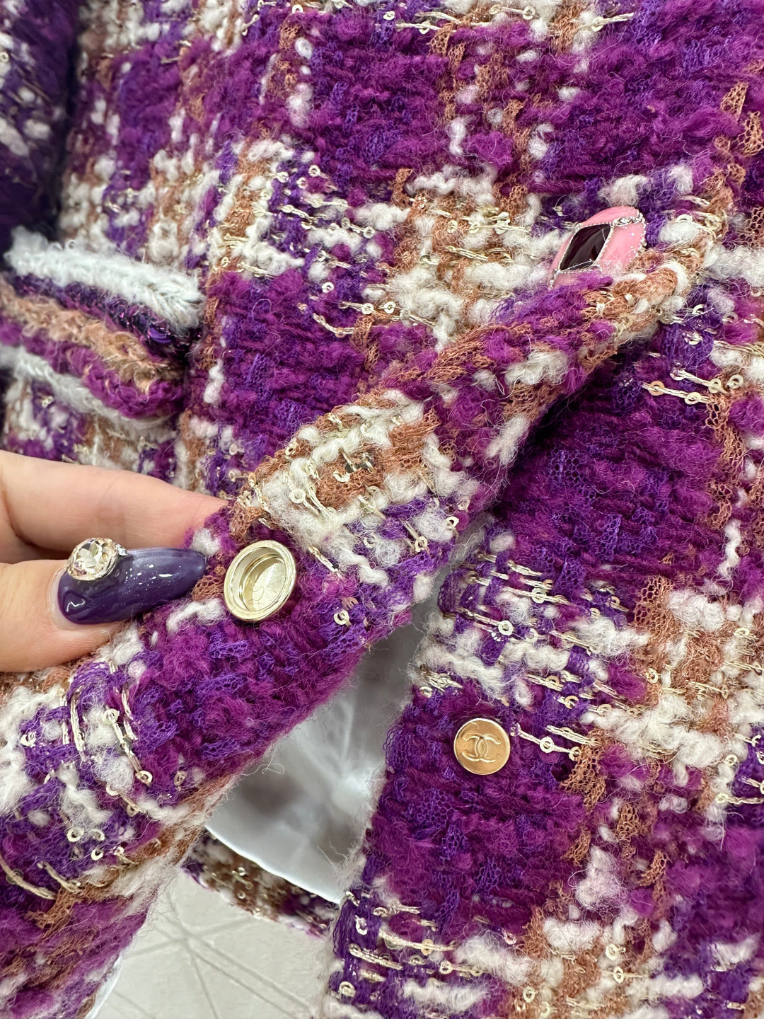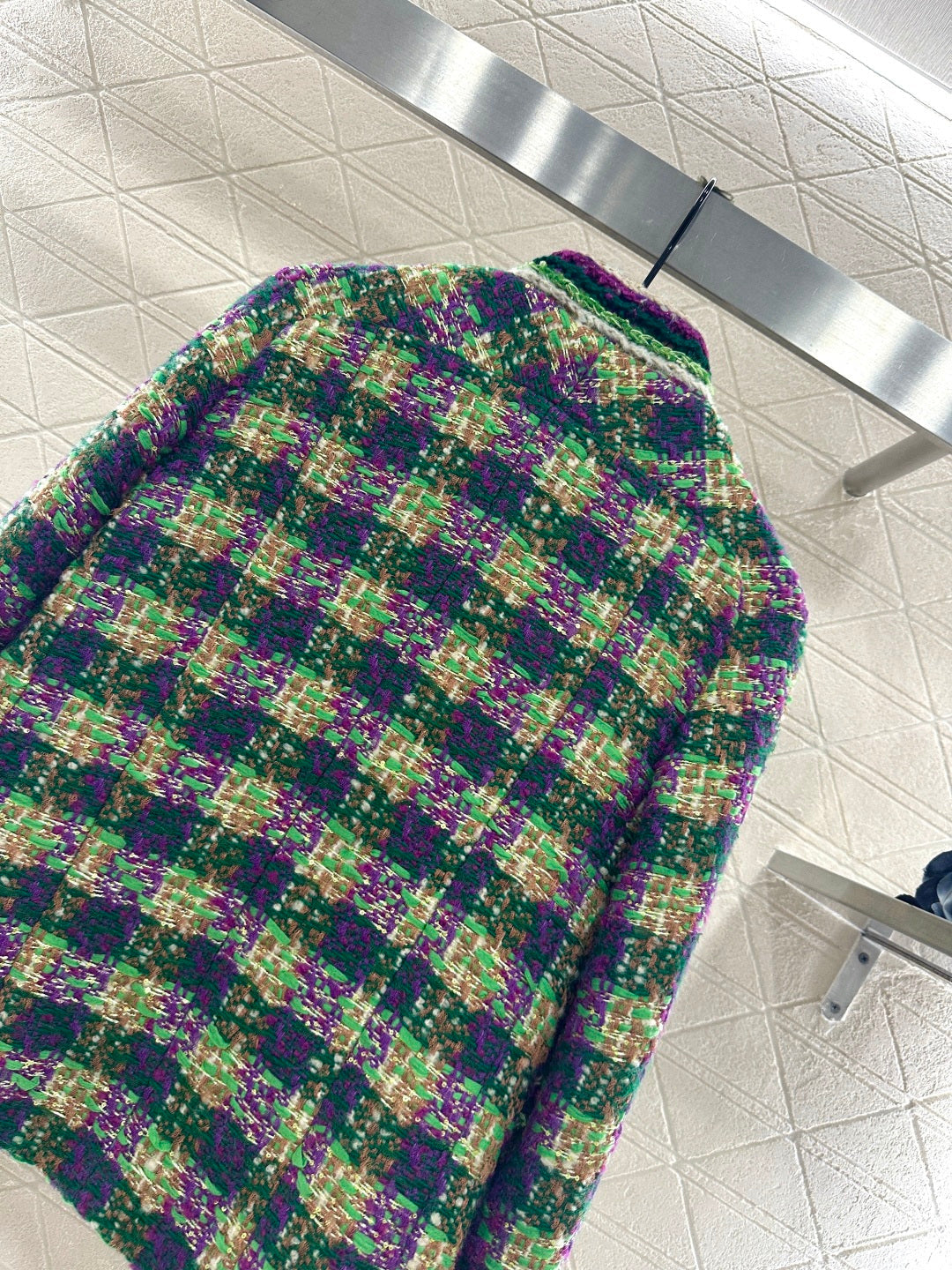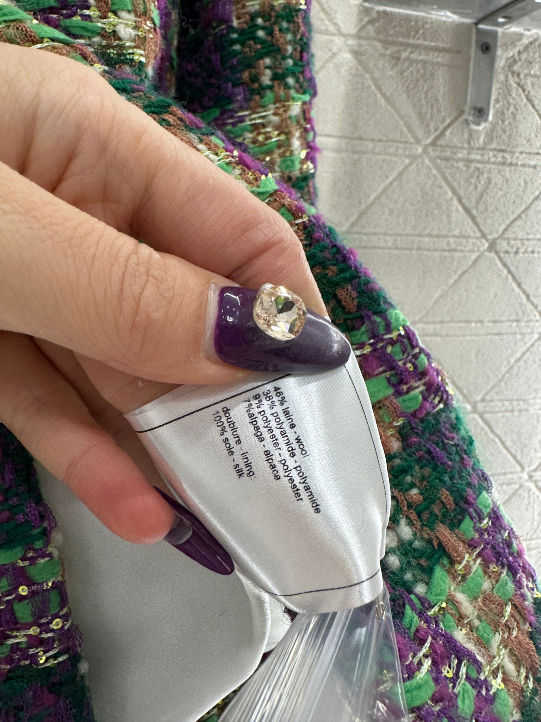 25coco Ski🎿 Series# Made of coarse wool tweed with a distinct texture and visible wool fibers, this high-quality piece features a sophisticated, elegant look. The stand collar and structured shoulders complement the contrasting stripes on the cuffs and pockets, while the single-breasted double-C snap buttons and vintage-inspired contrasting glaze accents echo the high-saturation Hong Kong style color scheme of the woven texture. Luxurious yet refined, the straight cut is flattering and slimming