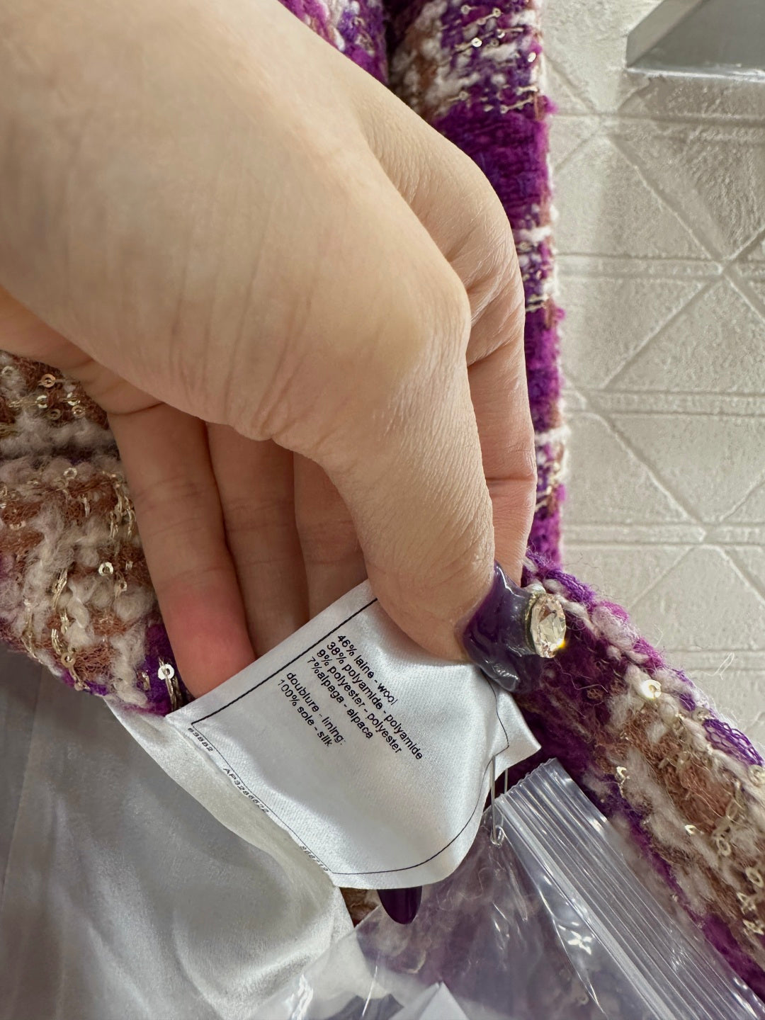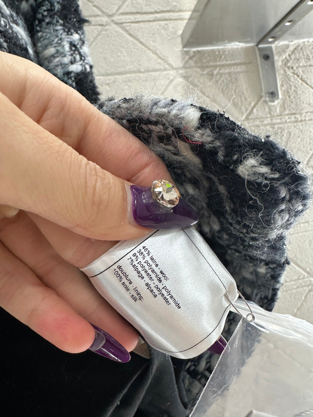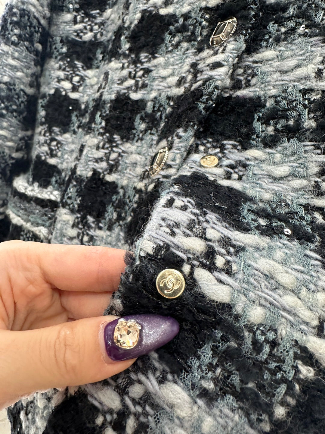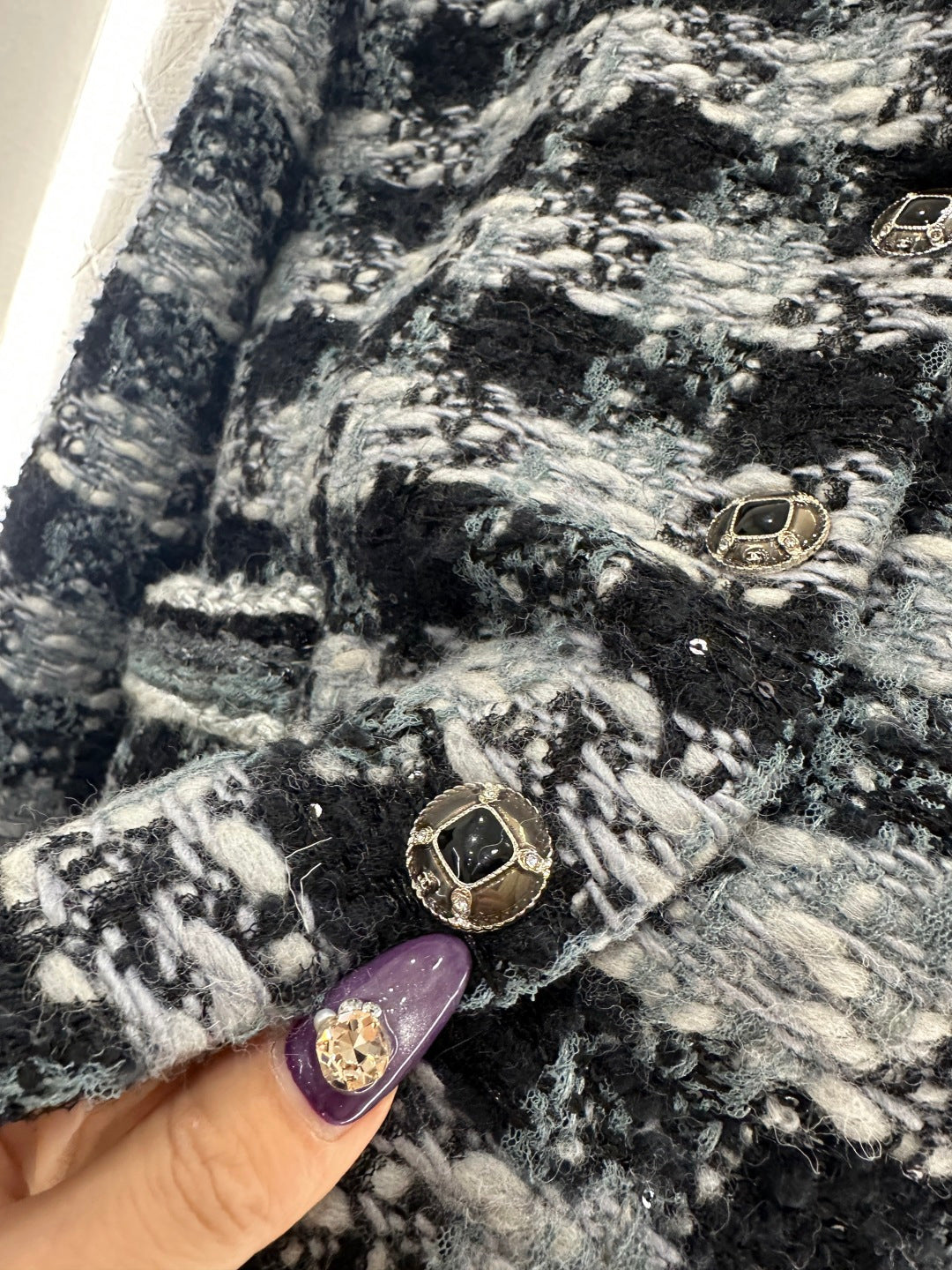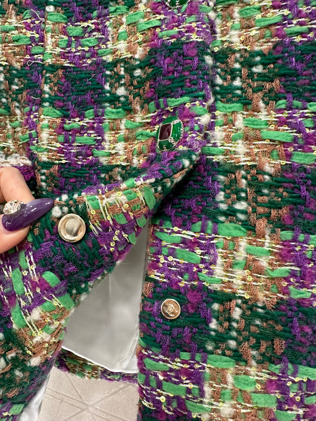 25coco Ski🎿 Series# Made of coarse wool tweed with a distinct texture and visible wool fibers, this high-quality piece features a sophisticated, elegant look. The stand collar and structured shoulders complement the contrasting stripes on the cuffs and pockets, while the single-breasted double-C snap buttons and vintage-inspired contrasting glaze accents echo the high-saturation Hong Kong style color scheme of the woven texture. Luxurious yet refined, the straight cut is flattering and slimming
