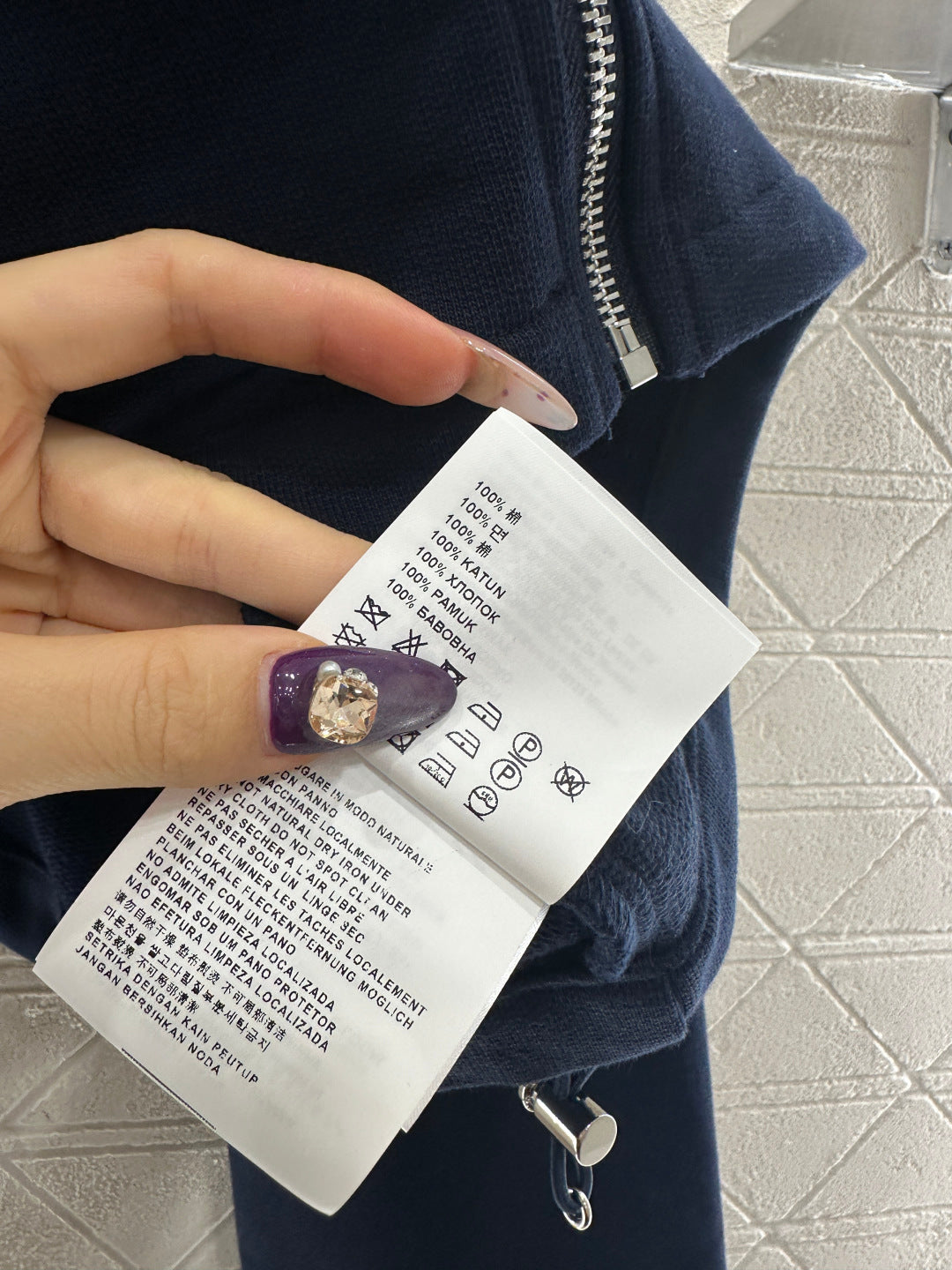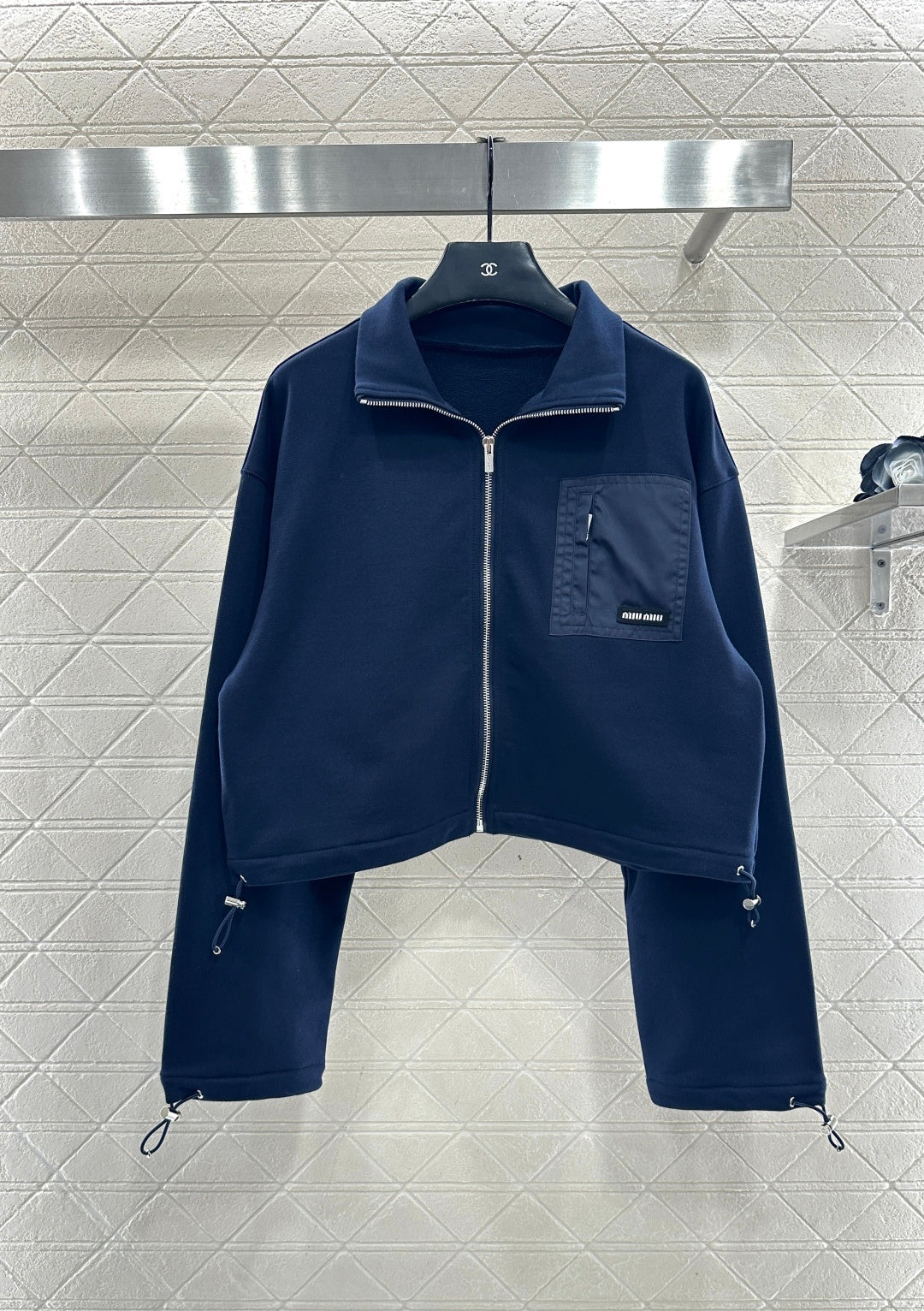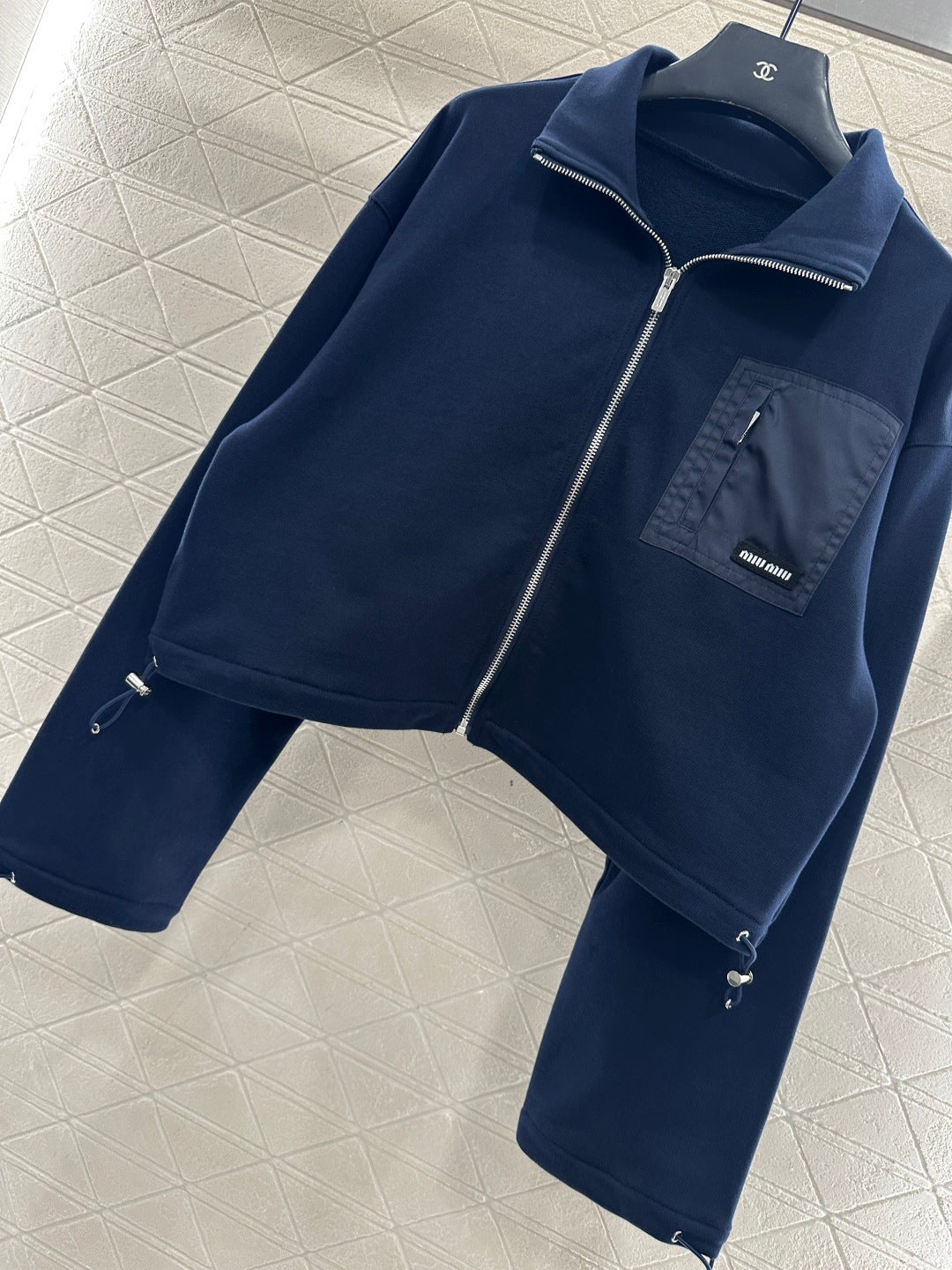 The twill all cotton material has a glossy texture and a strong sense of drape. The zipper jacket jacket has a loose zipper lapel and stand up collar design. The nylon treatment of the chest pocket is embellished with letter logos, echoing the brand positioning. The drawstring and plug-in pocket enhance practicality, and the exquisite and durable details highlight the brand style. It is paired with a high waisted workwear short skirt of the same series. The zipper letter details on the side pocket echo up and down, presenting a casual college style and fashionable and stylish dressing