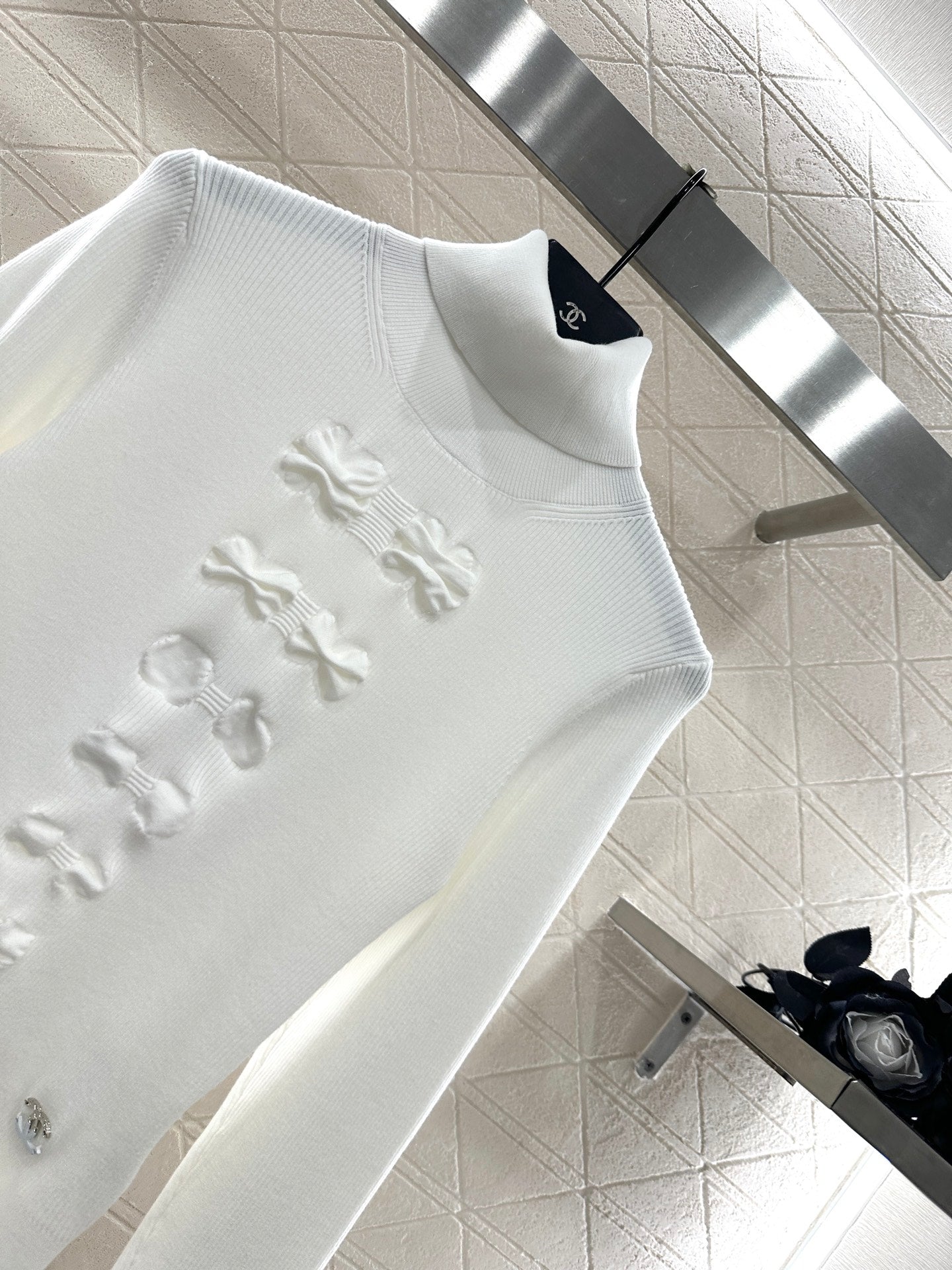 Cotton yarn weaving, soft and delicate, comfortable texture, high necked knitted long sleeves, decorated with concave and convex textures from top to bottom to create bow decorations, rich design layers, combined with threaded elastic edging for a more slimming effect. The double C-letter logo at the hem shows the brand tone, low-key and textured, elastic fabric, fits the body, and exudes elegance and generosity on the upper body