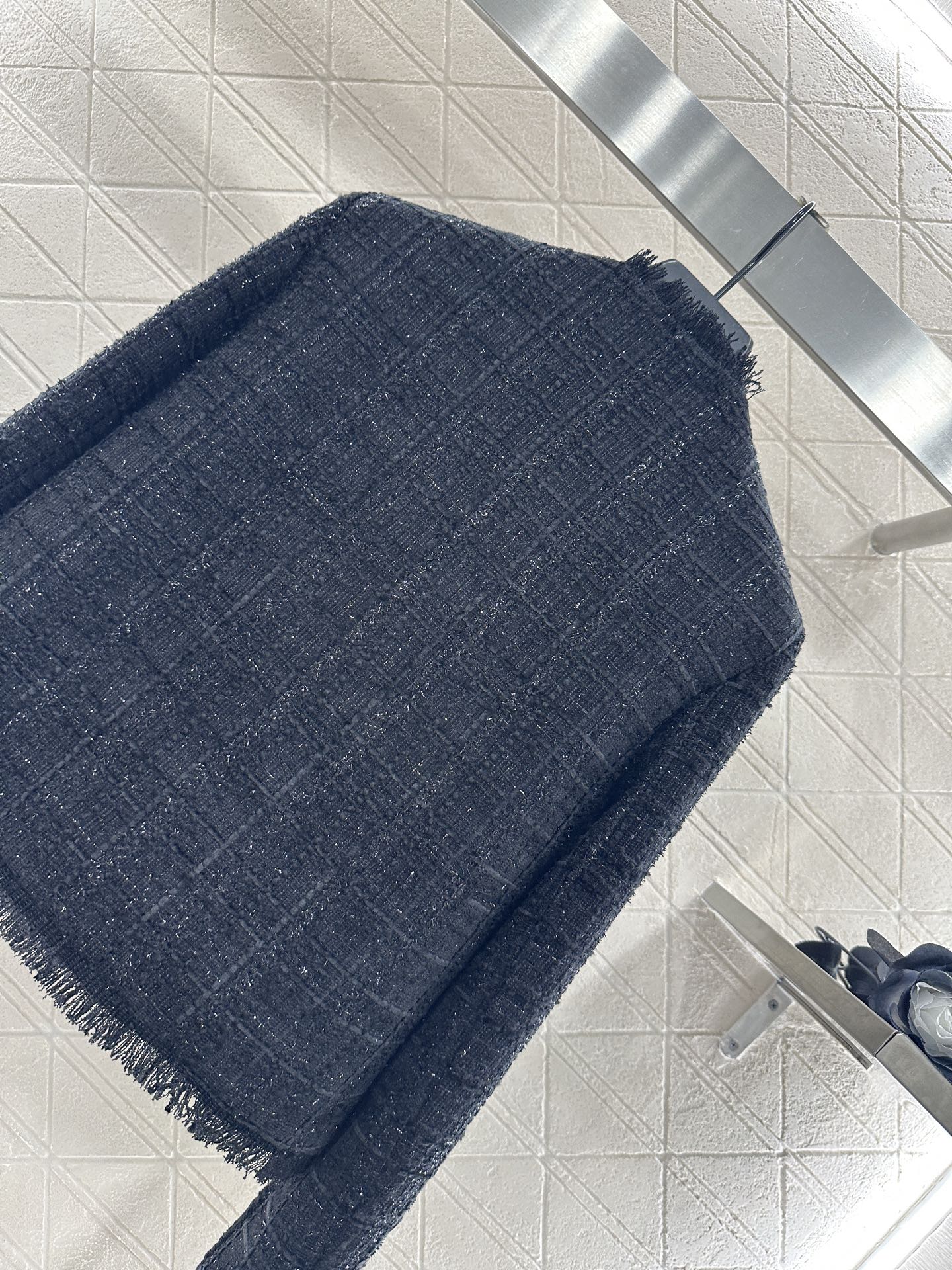 Woolen woolen fabric with high-quality texture, full of appearance. Small round neck dress jacket with shoulder pads designed to fit the human body, showing a slender and upright posture. The whole body is made of silver yarn interwoven with texture, covering the entire body. The front of the collar is embellished with a fuzzy texture that echoes the hem, paired with double C-buttons and rhinestone grid brooches to light up details and perfectly interpret the elegant and luxurious feeling. The pure black color scheme is distinguished by its quality perception and is the best choice for attending formal occasions