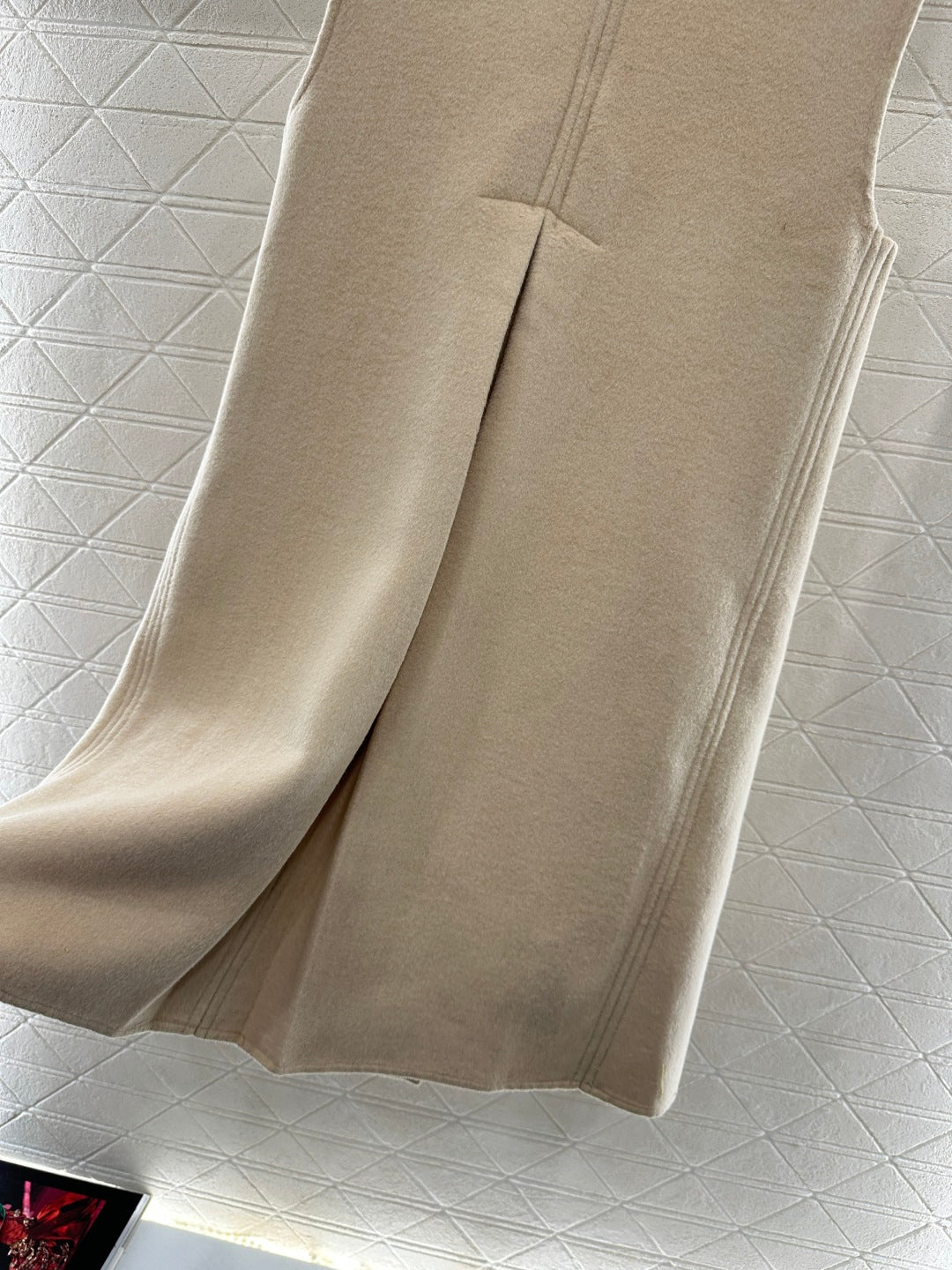 Made of 100% wool material and treated with double-sided nylon technology, the texture is superior and obvious. The long vest is cut, and the H-shaped design looks slim and stylish. The front placket is decorated with contrasting round buttons, and multiple symmetrical pockets are paired with a V-shaped metal logo to further elevate the design. The upper body adds richness to the shape, and it can also be worn as a vest skirt. It combines elegance, sweetness, and coolness when worn in autumn and winter.