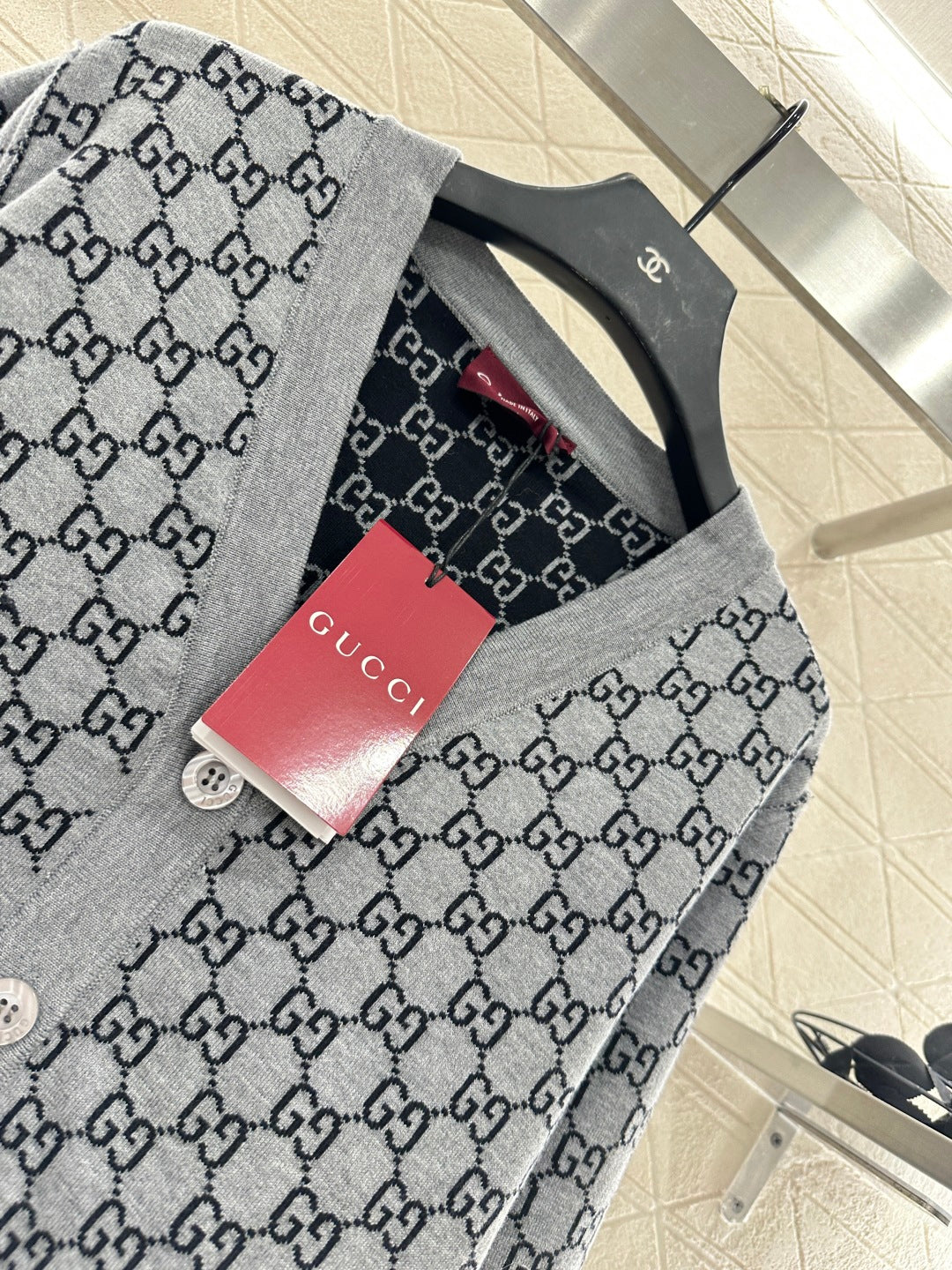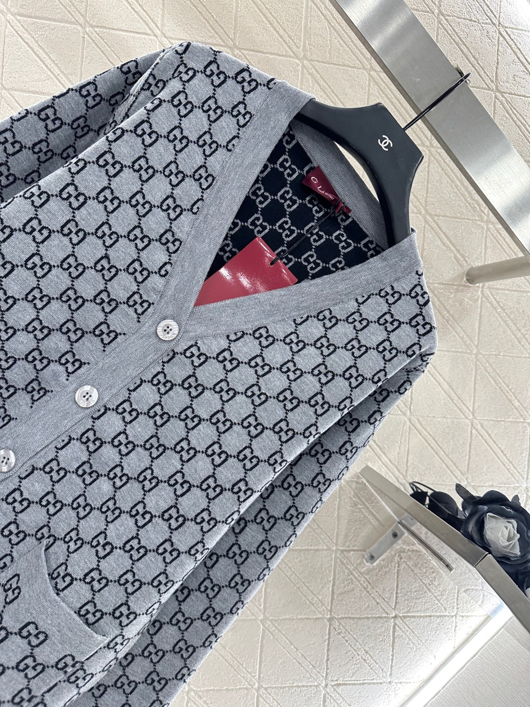 The texture is delicate, the fur feels comfortable, and the obvious V-neck knitted cardigan is embellished with a molded twist button, and then decorated with a V-neck design to enhance the shoulder and neck lines while adding delicacy. The overall decoration is contrasting gray and black, and the double G logo can be reversed inside and outside, making it easy to wear on both sides to achieve a retro style with strong fashion sense. It can be easily controlled for daily travel or easy gatherings