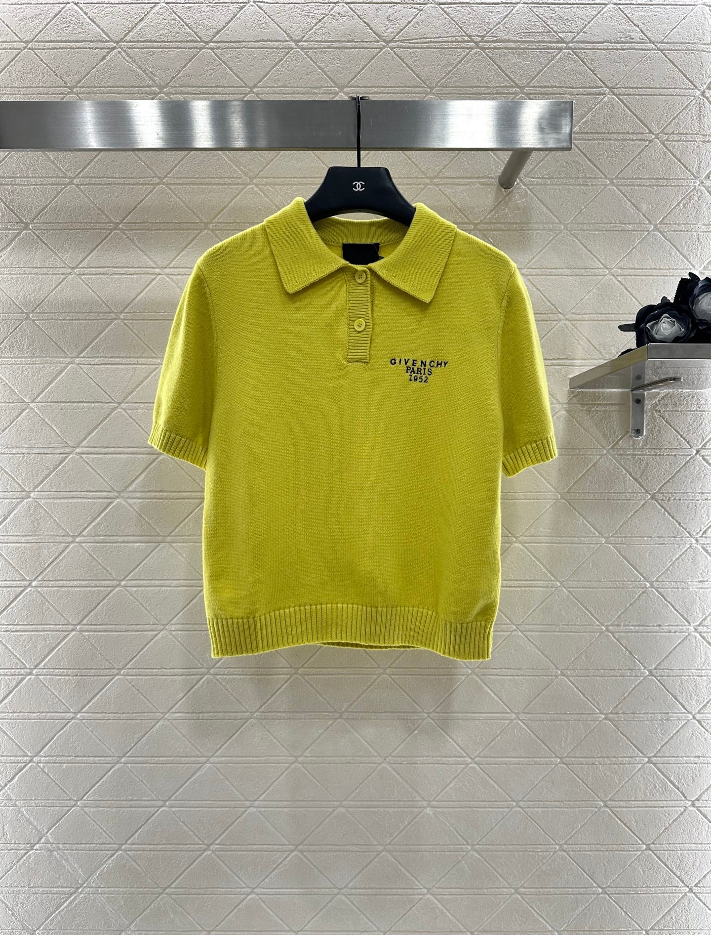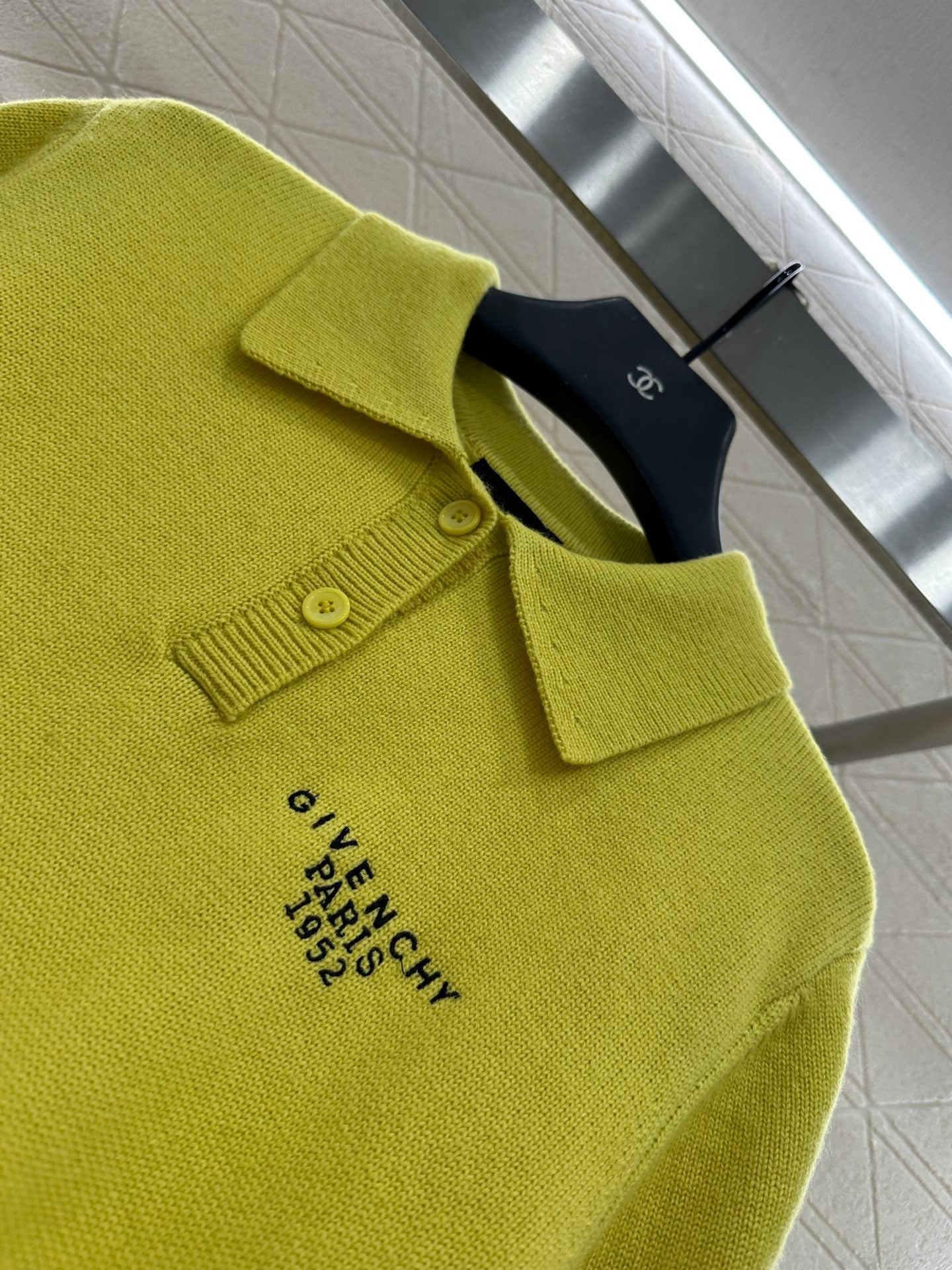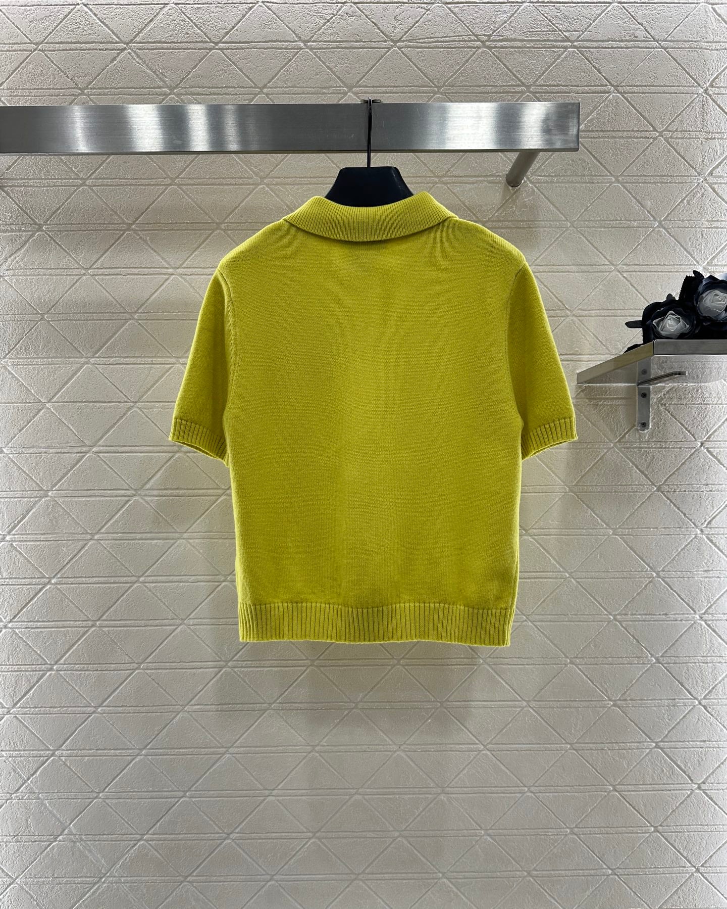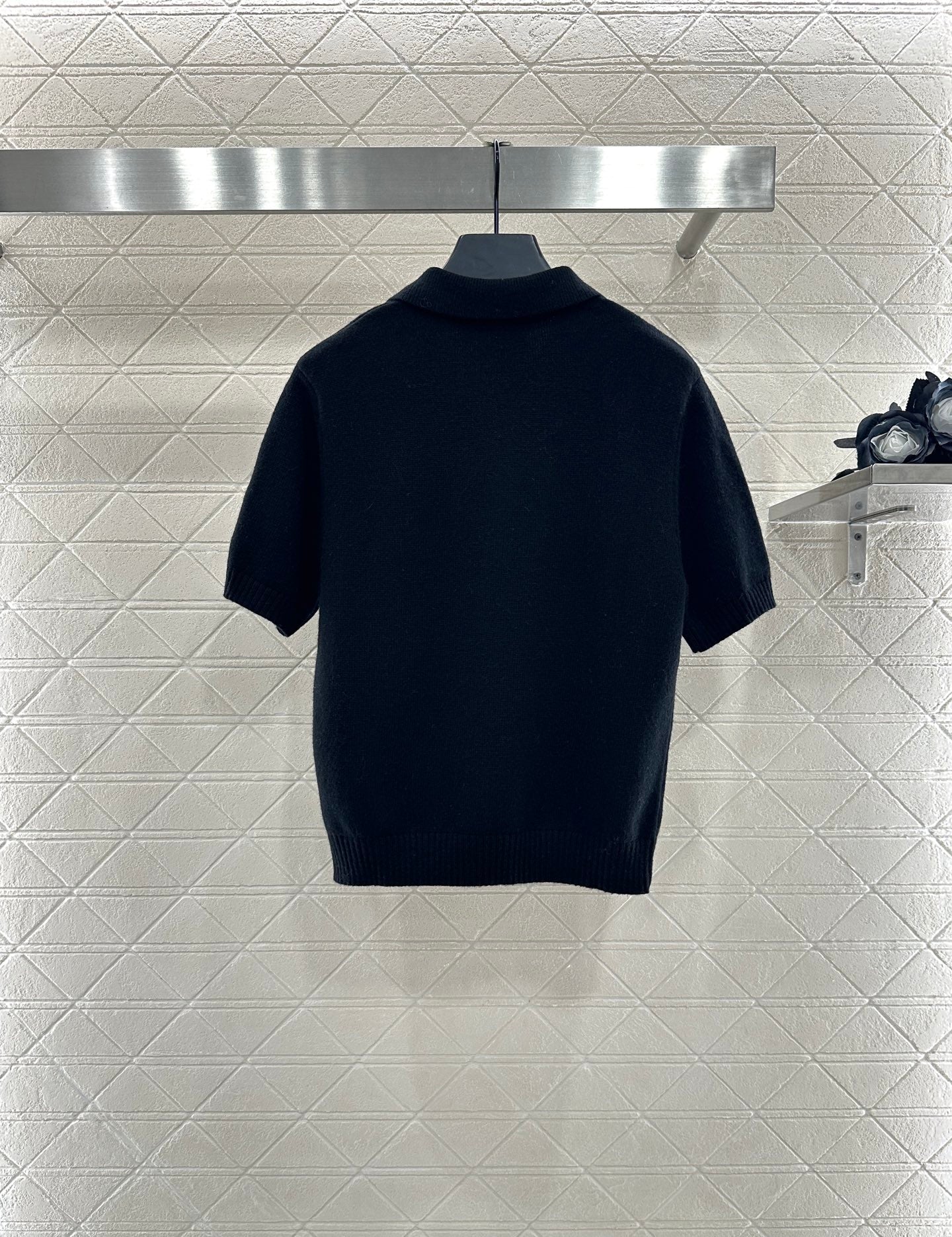 Cashmere yarn weaving texture is high-end, comfortable, soft, with a lapel collar and shoulder length short sleeved sweater. The half open button design is matched with delicate and dense texture. The edging is tightened with threaded strips and full of elasticity. The chest letter logo decoration highlights the high-end tone. The regular version is not picky about body shape, age, four seasons, daily life, simple and versatile