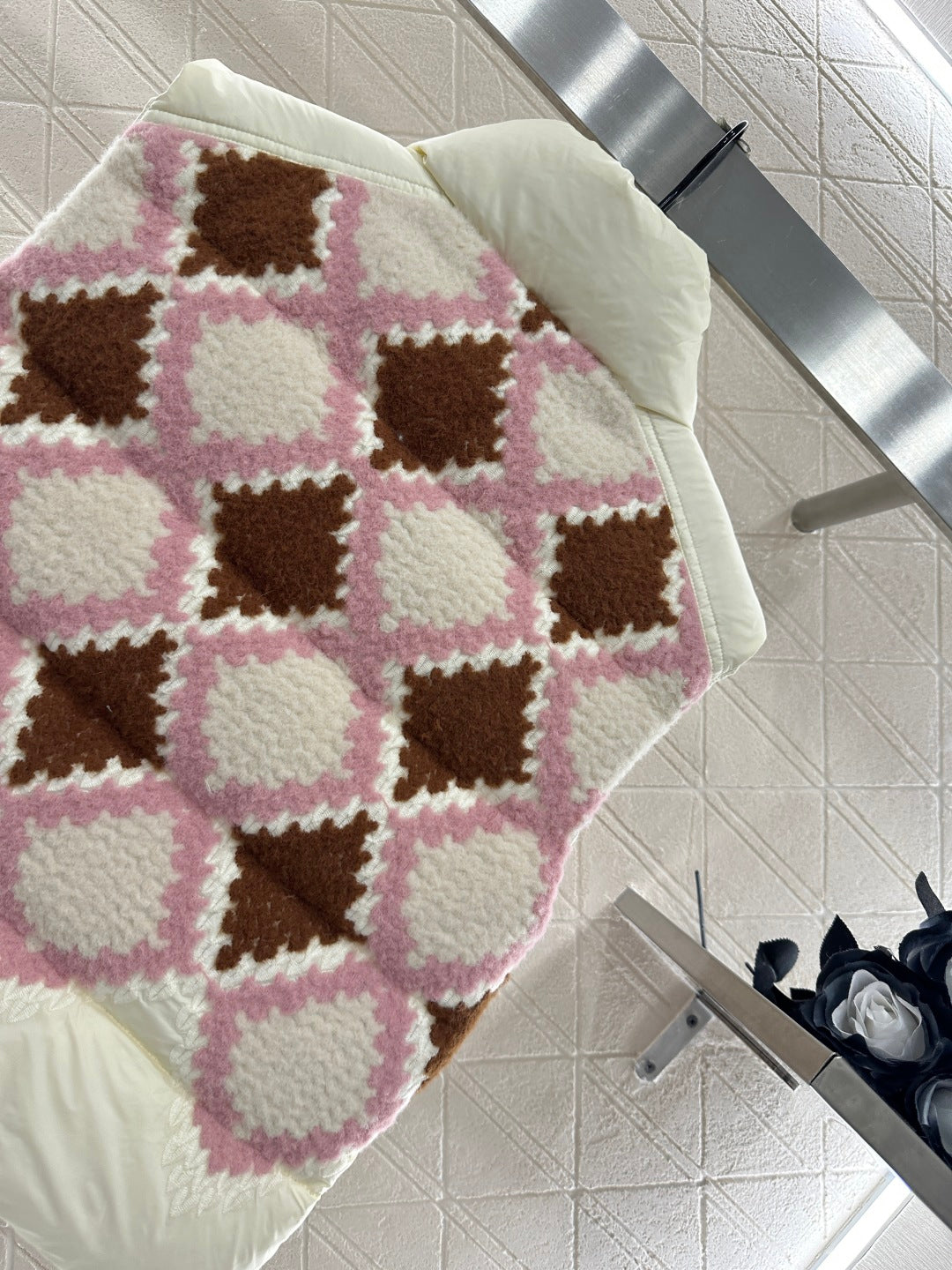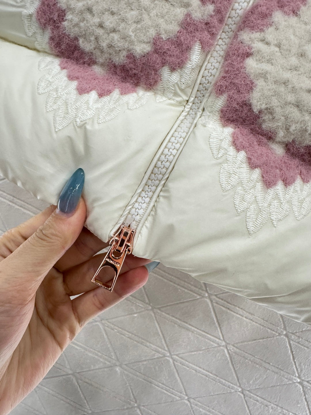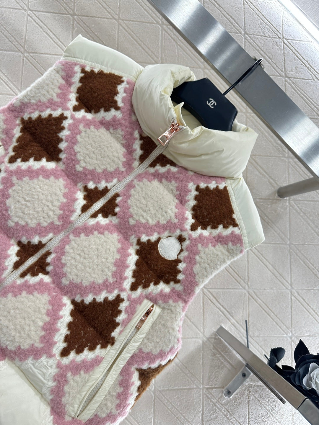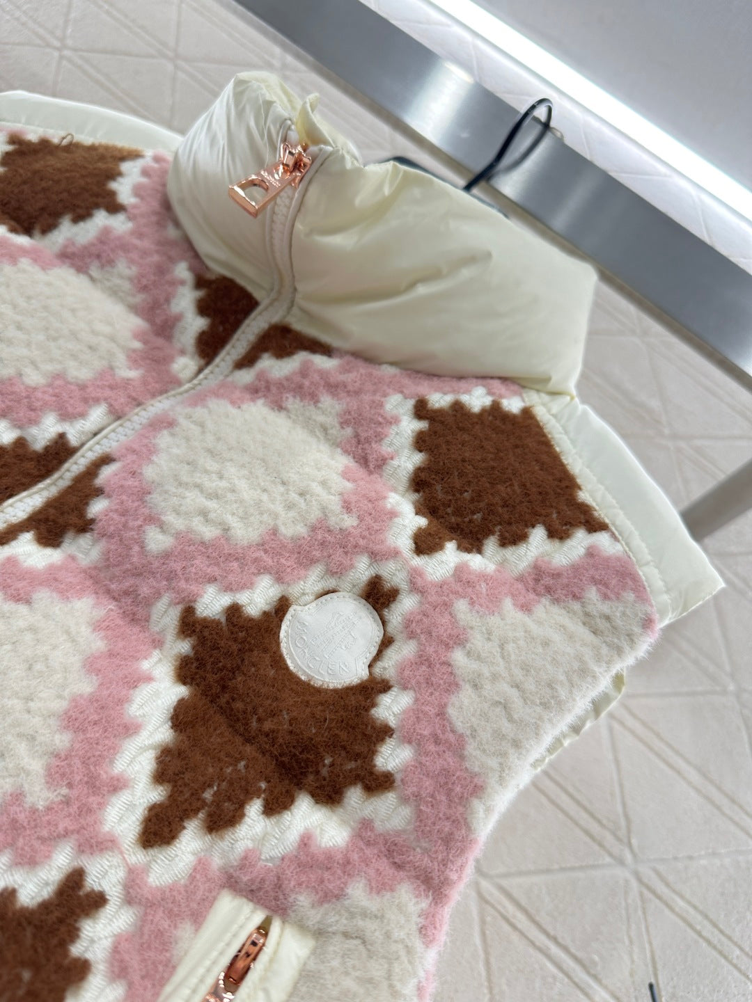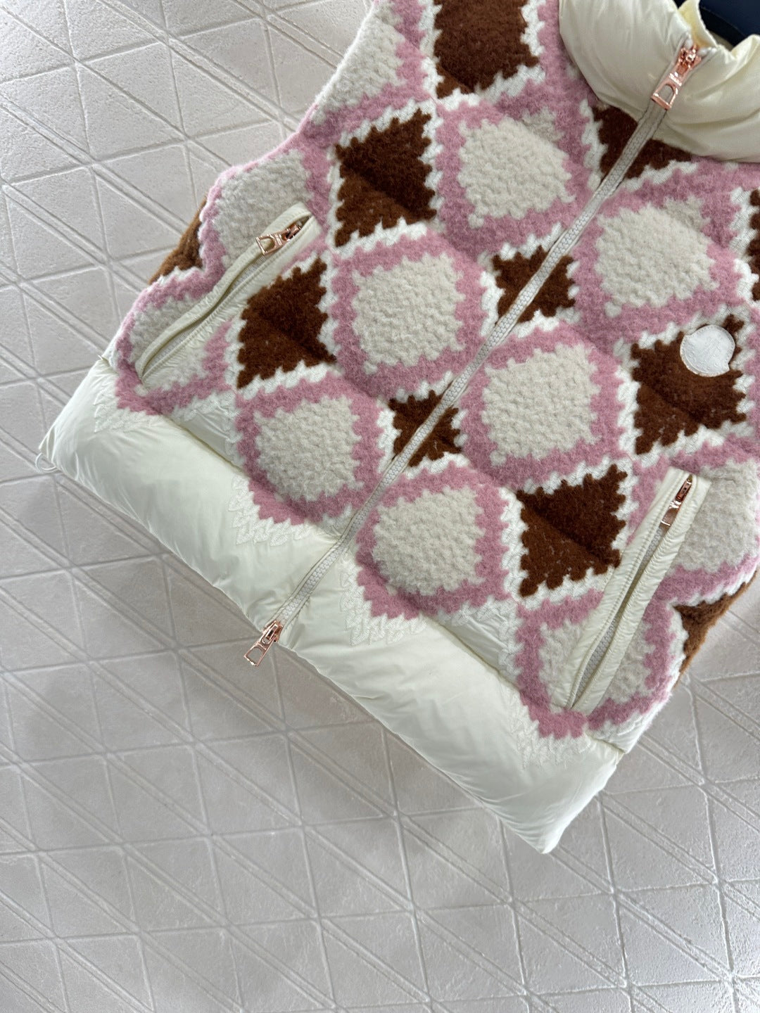 The upper layer of the shoulders and chest is decorated with knitted plush embroidery material, decorated with red and pink diamond grid patterns. The body is spliced with windproof nylon material, which collides with the material and exudes a fashionable and stylish style. The stand up down down zipper vest cut is full of design sense, with embossed badges on the chest, showcasing the brand's style. The rectangular embossed down is filled, the overall silhouette is upright, the loose fit is unique, and the embroidered splicing design is fashionable and stylish. It is the first choice for autumn and winter wear, and can be worn alone or stacked.