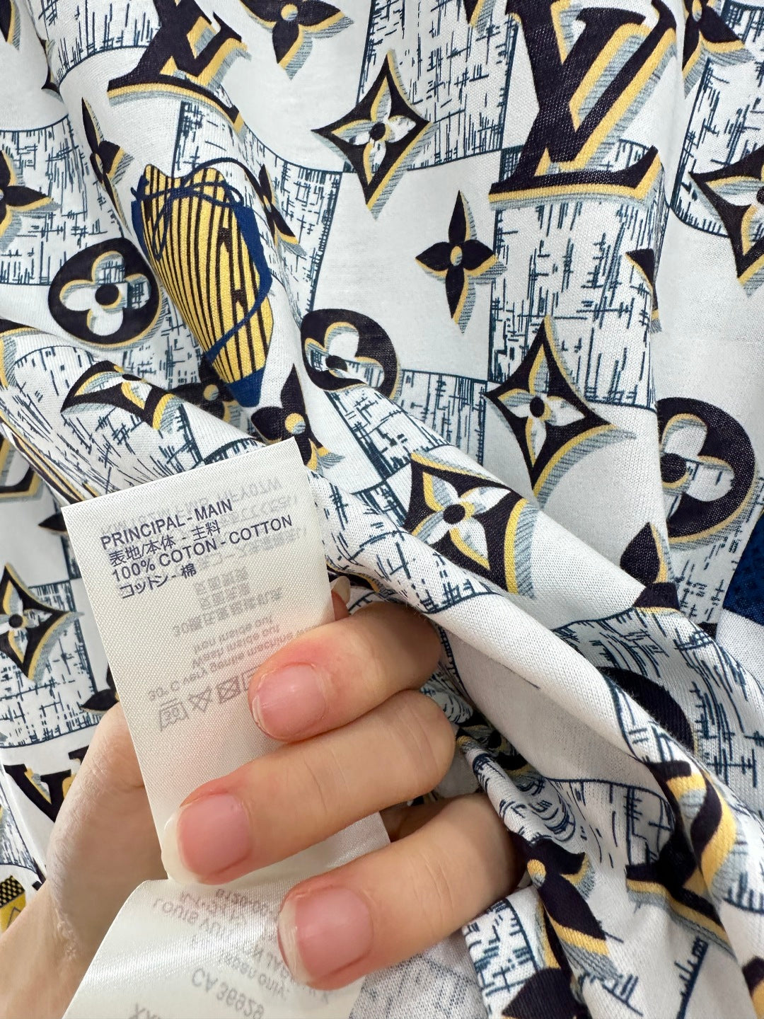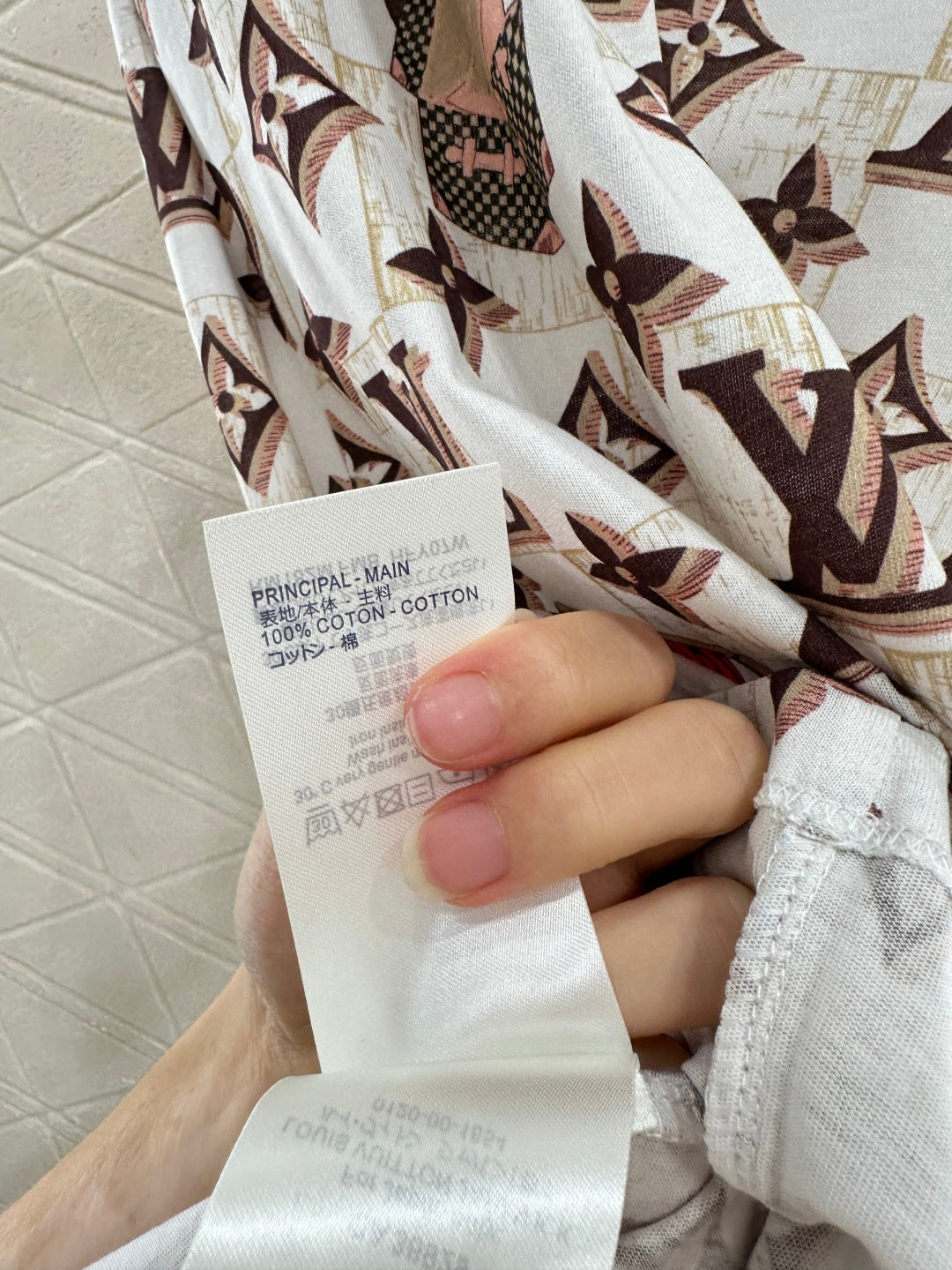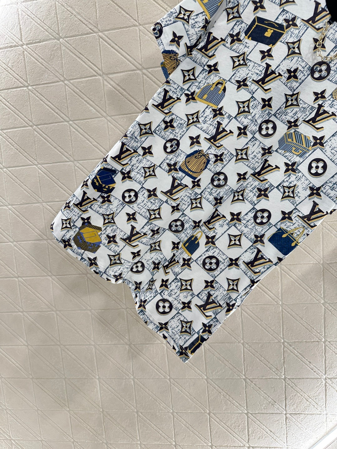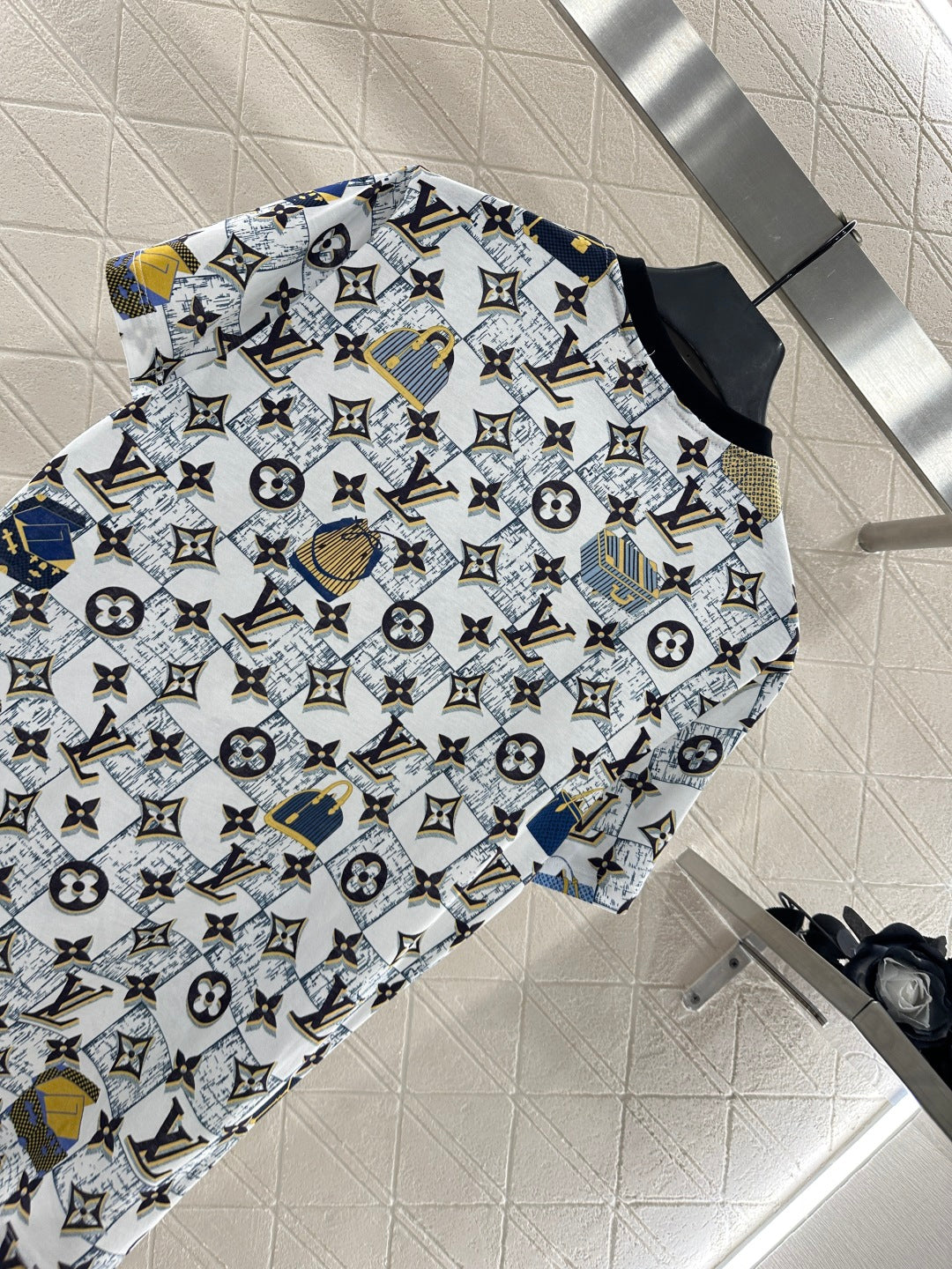 The twill cotton material has a delicate texture and is breathable and comfortable. The regular T-shirt cutting highlights the brand style. It is made of heavy-duty pure cotton with slight elasticity, presenting a slimming visual effect. The ready to wear garment is decorated with checkerboard pattern as the base, using four leaf clover elements and letter logos, and interspersed with bag patterns. The collar is wrapped with chain details, making the simple style more layered. Wearing it creates a casual and lazy style