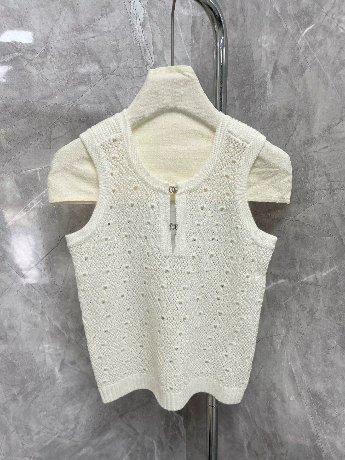 Available in black and white, 100% pure wool fabric, exquisite beading decoration, round neck design, double C logo embellishment, hollow weaving throughout, three-dimensional texture, short and slim fit