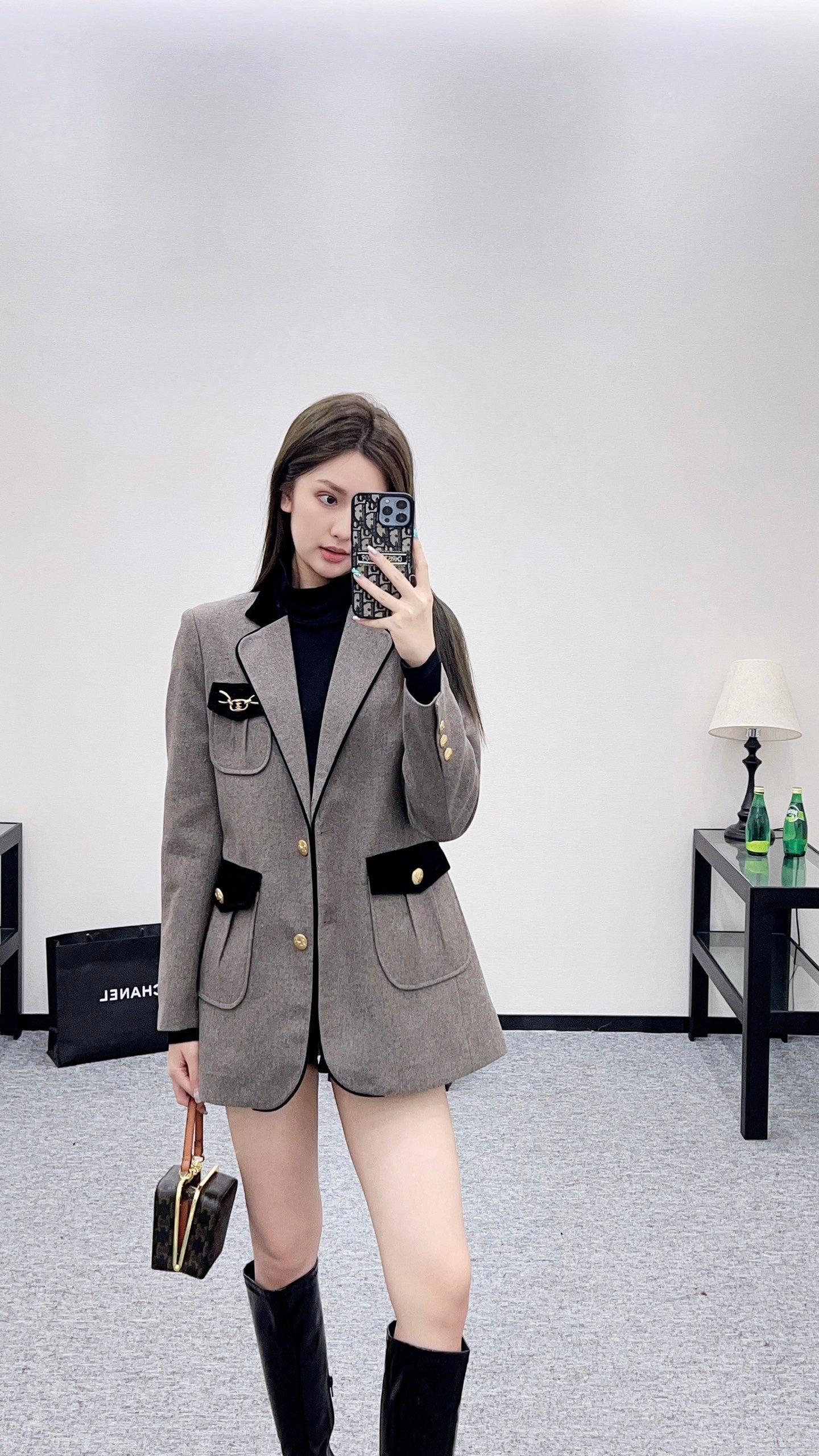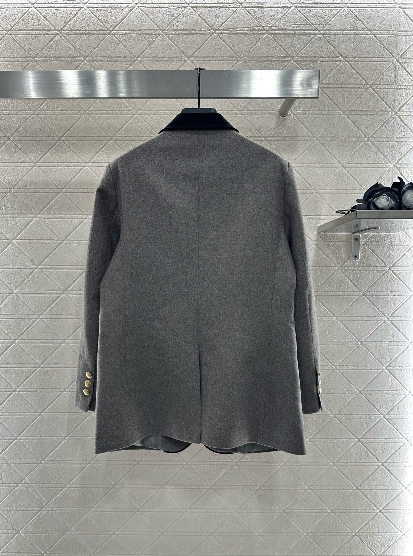 Custom-made YB imported imitation wool material, with a solid feel, upright and warm, showing the texture of high-grade wool. The shoulder-shaped suit jacket is tailored, the peak lapel is decorated with velvet binding and stitching, and the flap pockets echo the contrast of the black and gray body. The double-row gold buttons and the Arc de Triomphe logo on the pockets are embellished with heavy-duty molds, showing the charm of high-end customization. The regular silhouette covers the hips and modifies the proportions, creating a goddess-like temperament. It is suitable for different occasions and is an excellent choice for urban beauties.