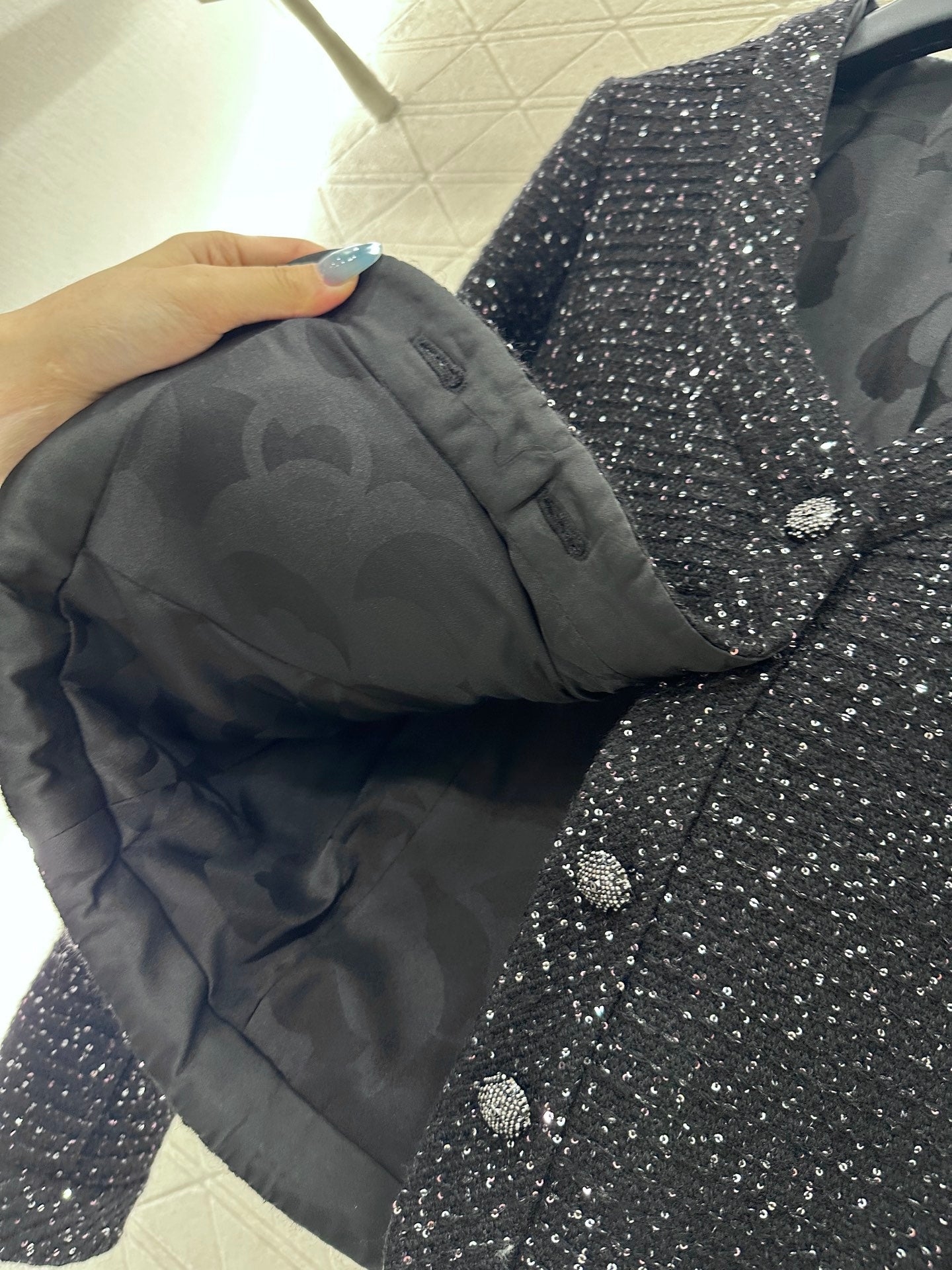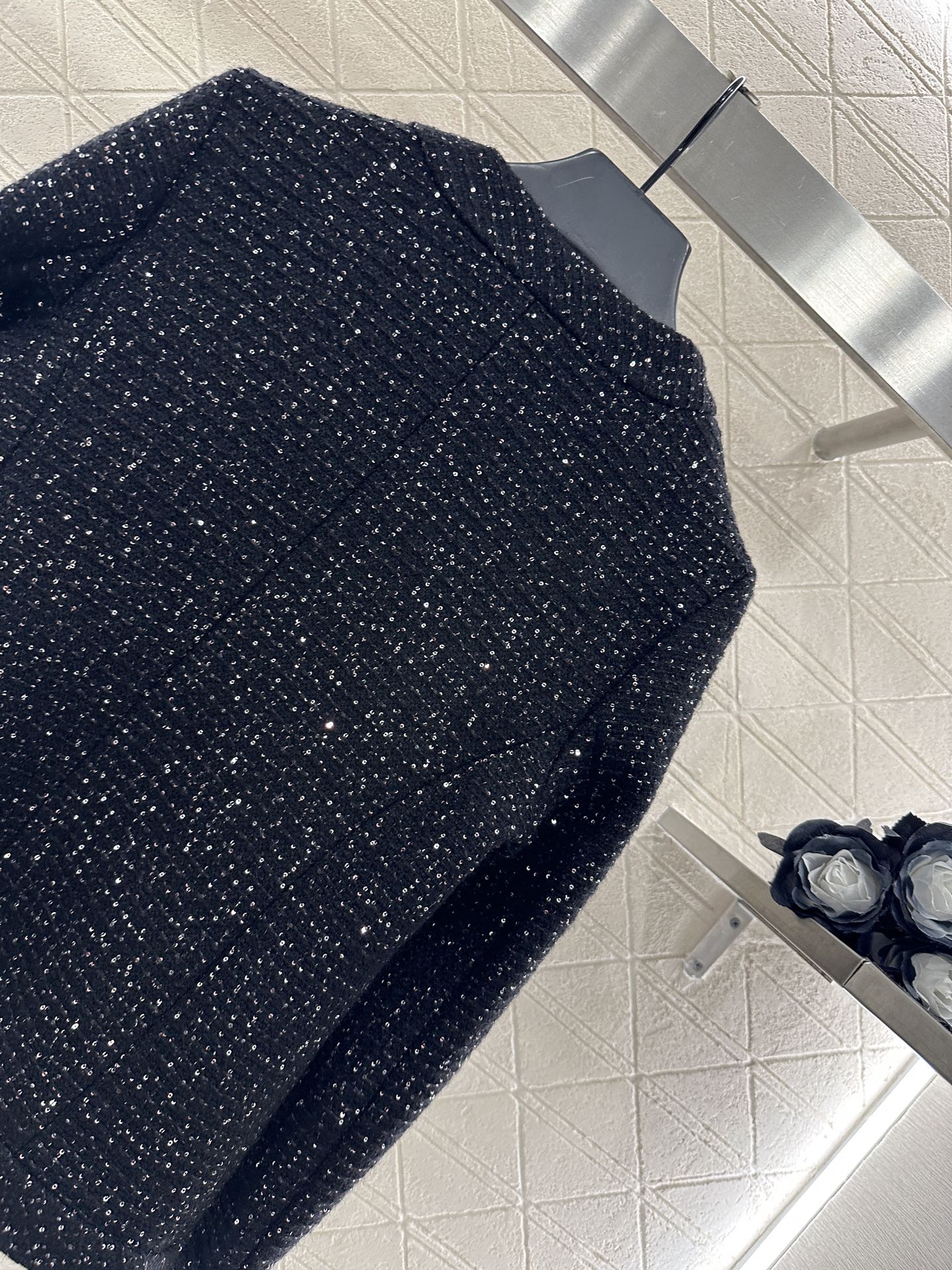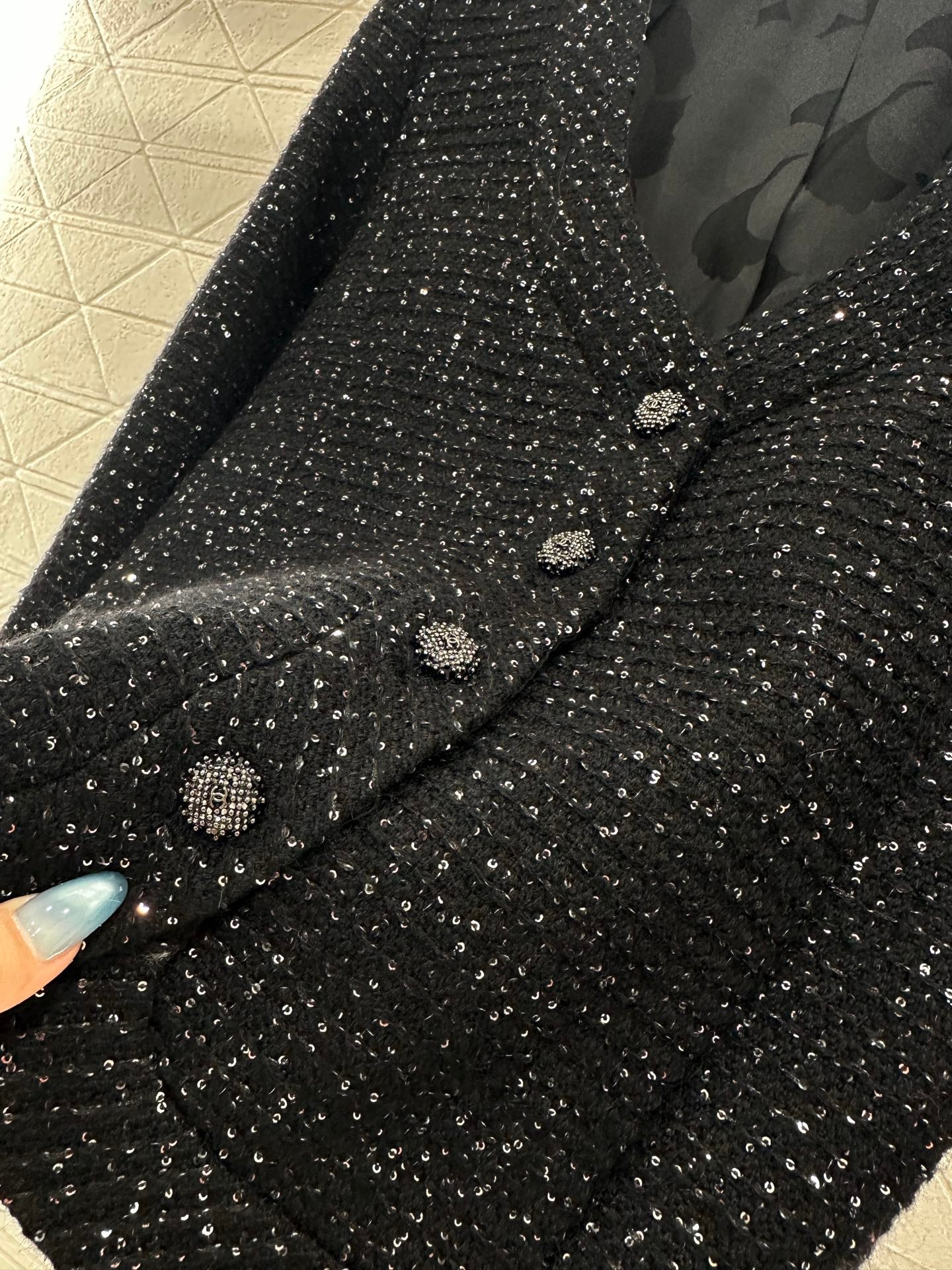 Customized YB imported woolen material, with obvious texture and superior texture, coarse woolen fabric creates a fashion model, peach heart V-neck, single row of heavy double C button decoration, showing luxury and elegance. Silver sequins are interspersed and woven, shining, elegant and charming, highlighting the taste of celebrities. A dress coat suitable for different occasions, fashionable and elegant