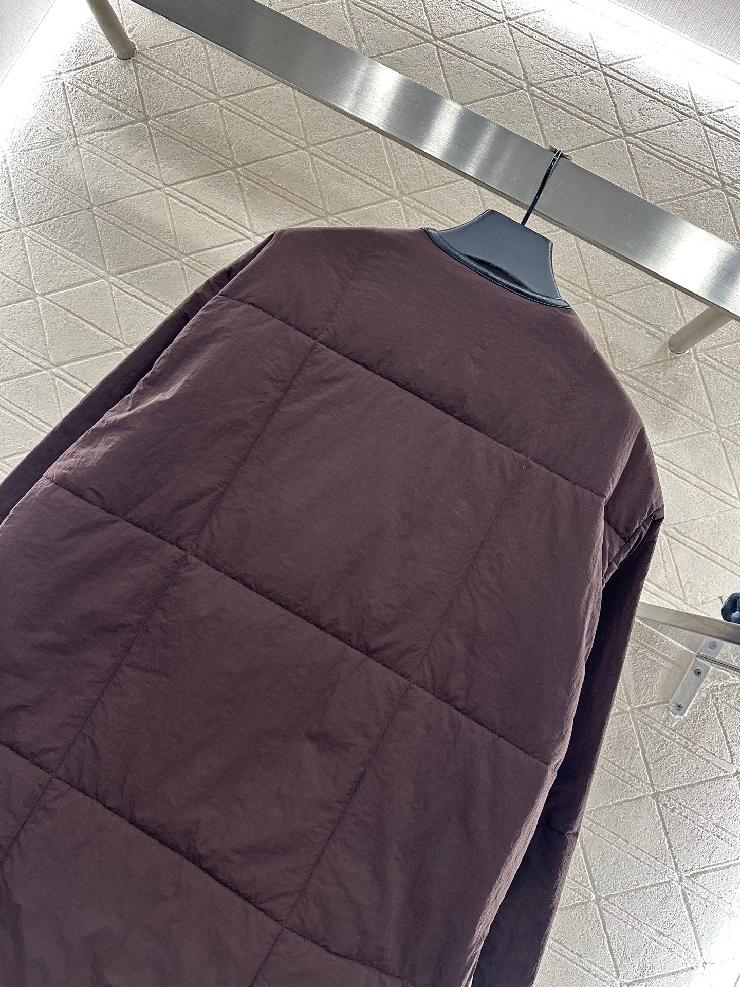 Customized YB windproof and waterproof nylon material, down cotton filling inside, the whole piece is light and warm, solid round collar slanted lapel, lining with full four-leaf clover letter logo, clavicle front perforated design, leather wrapped front edging, with leather monogram logo, fashionable and stylish, windproof and cold-resistant, side slits outline the silhouette to increase the sense of shape, double-side pocket design, practical and convenient, upper body loose and fashionable