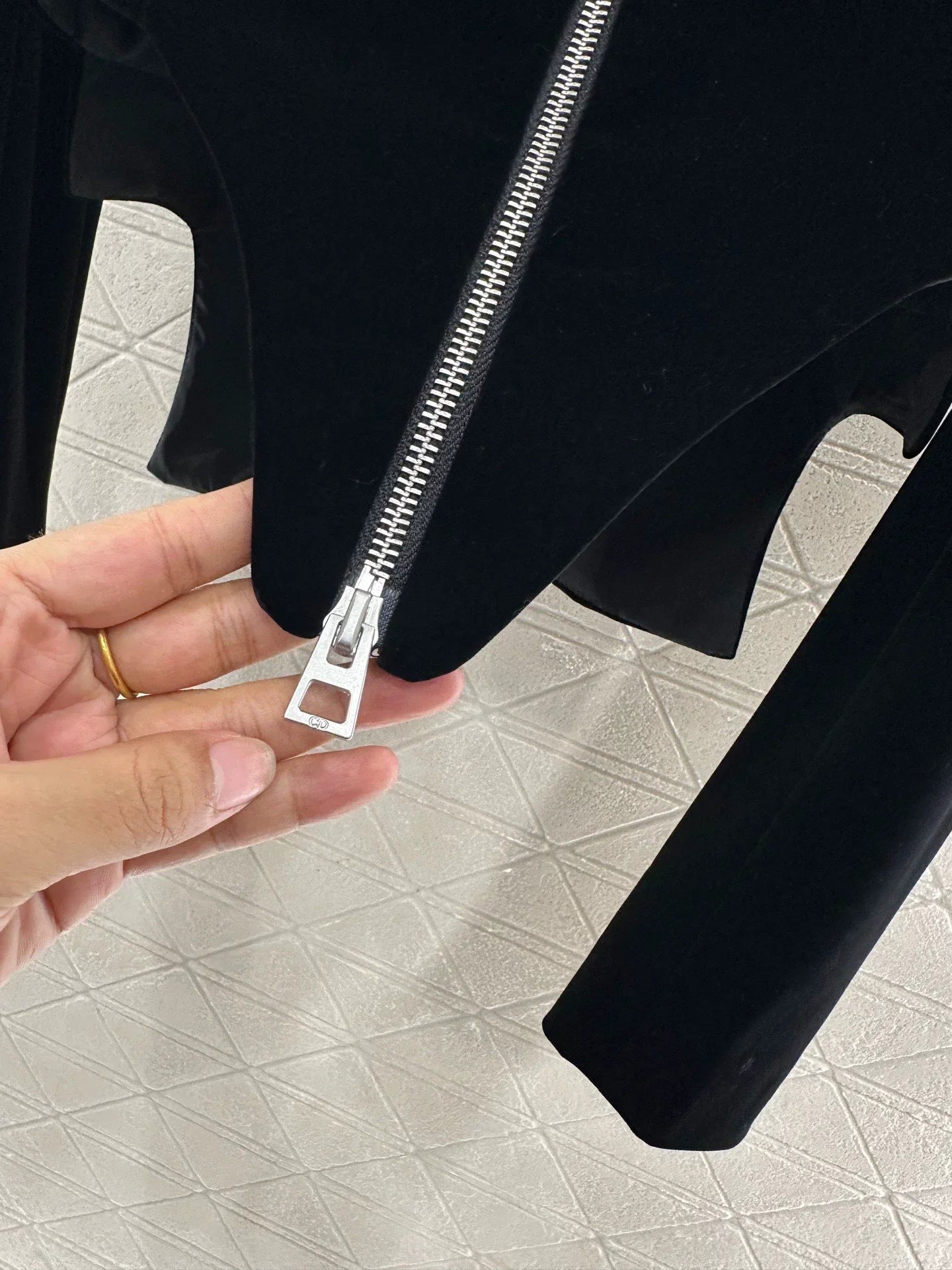 Velvet material texture, glossy and stylish bubble sleeve top with loose shoulder sleeves that accommodate the arms and a flat mouth to enhance skin exposure and make you look slimmer. The front placket is narrowed with a zipper, and the exquisite craftsmanship of the hem creates an irregular waistline decoration, making the simple top no longer monotonous. The three-dimensional cutting highlights the brand's high-end tone and height level fashion